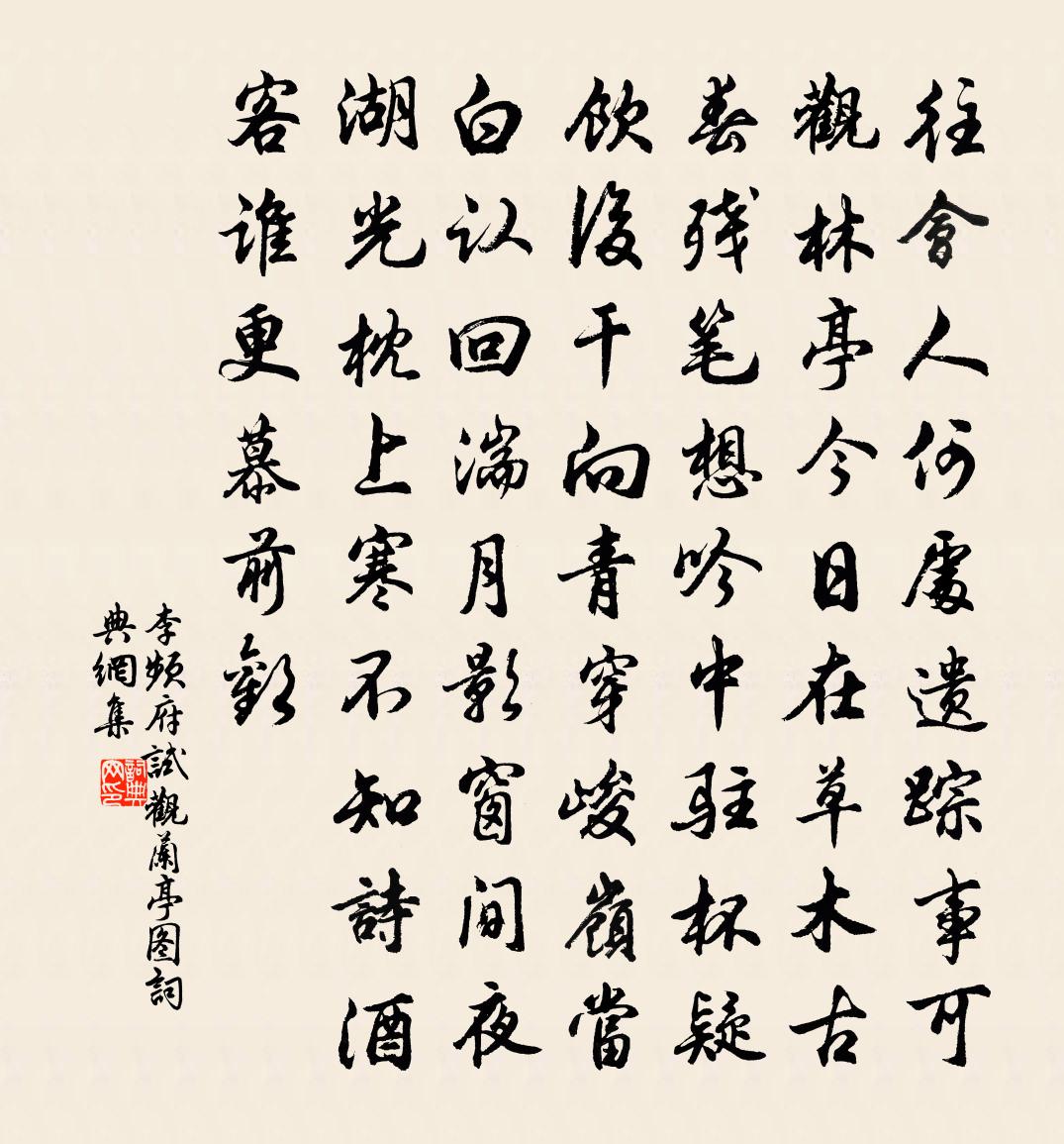 詩詞名句歷史字典書法欣賞書法字典國語詞典說文解字康熙字典古漢語字典標 題 作 者 詩 句 府試觀蘭亭圖作者:李頻 朝代:唐代府試觀蘭亭圖原文往會人何處,遺蹤事可觀。林亭今日在,草木古春殘。筆想吟中駐,杯疑飲後乾。向青穿峻岭,當白認回湍。月影窗間夜,湖光枕上寒。不知詩酒客,誰更慕前歡。詩詞問答問:府試觀蘭亭圖的作者是誰?答:李頻問:府試觀蘭亭圖寫於哪個朝代?答:唐代問:府試觀蘭亭圖是什麼體裁?答:五排李頻府試觀蘭亭圖書法欣賞府試觀蘭亭圖書法作品注釋全唐詩:卷589-43詩詞推薦江南逢故人張祜〔唐代〕河洛多塵事,江山半舊遊。春風故人夜,又醉白蘋洲。和陸明叟劉學箕〔宋代〕了無聞事上眉纖,一炷清香靜晝簾。造化自從回暖律,芬華頓覺轉窮簾。輕風度柳春情薄,細雨催花土脈黏。所愧送本中上人王冕〔元代〕上人飛錫何方去?笑指東南咫尺間。黃葉落時行細路,白雲生處看青山。欲求古道殊難得,悵望高風或可攀。朋舊竹榦青樂釣朱元璋〔明代〕曠浦澄天濕曉煙,智人樂釣穩沙前。蓑輕雨霽雲收谷,釣擲綸樞水映船。舉棹欲歸江月上,掛帆已近暮霞邊。汀蘆演福寺羅公升〔宋代〕禕翟當年讓福人,早知何用羨長春。帝鄉抔土真無憾,怨絕龍沙萬里身。夜靜獨登小閣有所見因書文同〔宋代〕危閣橫空蔽野扉,夜深來上久忘歸。水光瀲灩和煙動,雲色褵褷夾月飛。隔岸葦村聞笛遠,背灣松塢見燈微。此間水調歌頭(九日修故事訪南山,崖間有前太守所作水調歌,率爾次韻)萬某〔宋代〕卷盡風和雨,晴日照清秋。南山高處回首,瀟灑一扁州。且向飛霞瀹茗,還歸雲間書院,何幸有從游。隨分了公事村中閒步劉得仁〔唐代〕閒共野人臨野水,新秋高樹掛清暉。不知塵里無窮事,白鳥雙飛入翠微。代作五首項安世〔宋代〕流霞元是吾家飲,生日曾供老杜詩。色借榴心芳露重,香分荷氣碧泉滋。重闈永夜宜開酌,六禮今年看結褵。可但滿江紅華岳〔宋代〕自古麻稱稀,須麻信道、人麻生七十。當七月、慶生佳節,更逢七夕。丹鼎 * 多兩轉,蟠麻王母無雙實。更竹林洞仙歌(雨)陳亮〔宋代〕瑣窗秋暮,夢高唐人困,獨立西風萬千恨。又檐花、落處滴碎空階,芙蓉院、無限秋容老盡。枯荷摧欲折,多少離和薛仲止漁村雜詩十首劉黻〔宋代〕白髮疏疏青道衣,苦吟應有鬼神知。篇章但可陶情性,羞殺唐人自獻詩。海陽十詠蒙池劉禹錫〔唐代〕瀠渟幽壁下,深淨如無力。風起不成文,月來同一色。地靈草木瘦,人遠煙霞逼。往往疑列仙,圍棋在岩側。湘中雜詠十絕王炎〔宋代〕江天雲暝雨垂垂,日暮移舟口岸時。拈筆欲題還袖手,細搜摩詰畫中詩。六月三日大風雨蔡忠惠家玉堂紅一洗而盡因憶陳宓〔宋代〕三年渴想玉堂紅,六月都隨一夜風。卻憶去年當此際,一時台府饋筠籠。寒食王禹偁〔宋代〕寒食江都郡,青旗賣楚醪。樓台藏綠柳,籬落露紅桃。妓女穿輕屐,笙歌泛小舠。史君慵不出,愁坐讀離騷。送韋整尉長沙張祜〔唐代〕遠遠長沙去,憐君利一官。風帆彭蠡疾,雲水洞庭寬。木客提蔬束,江烏接飯丸。莫言卑濕地,未必乏新歡。山城張耒〔宋代〕野縣閉門早,山深更漏微。薄雲依月宿,孤翼犯霜歸。弓冷新膠健,貂寒舊縷紕。旗亭換新酒,不惜篋中衣。壽昌道中翁卷〔宋代〕清游從此起,過處必須看。背日山梅瘦,隨潮海鴨寒。平途迷望闊,峻岭痴行難。聽得居人語,今年冬又殘。臨江仙程大昌〔宋代〕夾路傳呼杳杳,垂腰印綬累累。萬般榮貴出丹枝。遙知心樂處,椿畔桂當時。酒到芳春偏弄色,輕黃泛灩鵝兒。大名句推薦大樹底下好遮陰張南莊《何典·第十回》 冬宜密雪,有碎玉聲。王禹偁《黃岡竹樓記》 水激則悍,矢激則遠劉向《說苑·談叢》 記得年時臨上馬,看人眼淚汪汪。如今不忍更思量。劉彤《臨江仙·千里長安名利客》 垂死病中驚坐起,暗風吹雨入寒窗元稹《聞樂天授江州司馬》 罪至重而刑至輕,庸人不知惡矣,亂莫大焉。荀子《荀子·正論》 西風多少恨,吹不散眉彎。納蘭性德《臨江仙·寒柳》 貧居鬧市無人問,富在深山有遠親。佚名《增廣賢文·上集》 資之深,則取之左右逢其原。孟子《孟子·離婁章句下·第十四節》 歸師勿掩,窮寇莫追。羅貫中《三國演義·第九十五回》