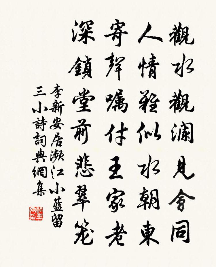 詩詞名句歷史字典書法欣賞書法字典國語詞典說文解字康熙字典古漢語字典標 題 作 者 詩 句 安居瀕江小藍留三小詩作者:李新 朝代:宋代安居瀕江小藍留三小詩原文觀水觀瀾見會同,人情難似水朝東。寄聲囑付王家老,深鎖堂前悲翠籠。詩詞問答問:安居瀕江小藍留三小詩的作者是誰?答:李新問:安居瀕江小藍留三小詩寫於哪個朝代?答:宋代李新安居瀕江小藍留三小詩書法欣賞安居瀕江小藍留三小詩書法作品詩詞推薦楓橋湯仲友〔宋代〕出城才七里,地僻罕曾守。孤塔臨官路,三門背運河。鐘鳴驚宿鳥,牆矮入漁歌。醉里看題壁,如今張繼多。喜遷鶯(叔父生日)史浩〔宋代〕朱旂鳳闕展,弄罷五弦,南薰敲竹。雨糝桃蹊,錢浮荷沼,一瞬染成新綠。玉皇香案吏,曾是時、鶴飛江國。對此謝饋藥宋自適〔宋代〕投老如僧不出家,羸軀無奈病相加。頭旋似倚當風柳,目眩如看隔霧花。高束詩書參素問,盡拋琴劍學丹砂。舊時送簡賀州五首舒邦佐〔宋代〕朔風撼木落,莫驚客店霜。桂林雪片深,成都碧雞坊。西南幕中去,尚趣萬里裝。今乘刺史車,何嫌驛路長。山中秋曉蒲壽宬〔宋代〕命策空山風露冷,野花無數不知名。林叢深處無人問,時吐秋芬一樣清。偈頌二十一首釋普寧〔宋代〕拄杖頭邊,草鞋跟底。隨緣放曠,隱遁過時。豈謂業債難逃,復落他家綣繢,扶病拖泥帶水。只得豎四橫三,乘時冬夜聽雨戲作陸游〔宋代〕少年交友盡豪英,妙理時時得細評。老去同參惟夜雨,焚香臥聽畫檐聲。與遊子明同過石湖范成大〔宋代〕契闊相逢一笑歡,當年森桂共驂鸞。試談舊事醒村酒,仍趁新晴暖客鞍。梅粉都皴啼宿雨,柳黃不展噤春寒。從今宗壇秋夕褚環中〔宋代〕疏綺平雲徹夜開,月明峰頂見樓台。璚璈聲里天燈近,知是三真謁帝回。得李滁州書以玉潭莊見托,因書春思,以詩代答獨孤及〔唐代〕春物行將老,懷君意詎堪。朱顏因酒強,白髮對花慚。日日思瓊樹,書書話玉潭。知同百口累,曷日辦抽簪。次韻陳春卿眇雲軒史浩〔宋代〕修竹叢中屋半楹,坐來天際數峰青。定知俗物不掛眼,只許飛雲過短欞。宣公祠李曾伯〔宋代〕雙湖真澤國,千載相公祠。中有釣魚者,問之俱不知。使院栽葦薛能〔唐代〕戛戛復差差,一叢千萬枝。格如僧住處,栽得吏閒時。筍自廳中出,根從府外移。從軍無宿例,空想夜風吹。韓耕道交八絕句韻見寄因和答之曹彥約〔宋代〕羽檄交馳駭電奔,詔書頻下想天恩。舊時懶惰如魔去,祗有書生習尚存。元日吳則禮〔宋代〕禿雪盈巾面欲黧,三間茅屋傍淮湄。北湖不道無炊米,也向衡門貼畫雞。贈王道者李中〔唐代〕混俗從教鬢似銀,世人無分得相親。槎流海上波濤闊,酒滿壺中天地春。功就不看丹灶火,性閒時拂玉琴塵。仙家庚寅乙未猶泊大雷口黃庭堅〔宋代〕廣原嘷終風,發怒土囊口。萬艘萍無根,乃知積水厚。龍鱗火熒熒,鞭笞雷霆走。公私連檣休,森如束春韭。倚筇逍遙吟邵雍〔宋代〕何事感人深,求之無處尋。兩儀長在手,萬化不關心。石里時藏玉,砂中屢得金。分明難理會,須索入沉吟。和張乖崖太學生〔宋代〕四窗滅盡讀書燈,窗外唯聞步鐸聲。辜負江山好明月,閒來此地趁虛名。雲來鵠〔唐代〕千形萬象竟還空,映水藏山片復重。無限旱苗枯欲盡,悠悠閒處作奇峰。名句推薦惠遠祠前晉溪水,翠葉銀花清見底。元好問《過晉陽故城書事》 出師未捷身先死,長使英雄淚滿襟。杜甫《蜀相》 別離在今晨,見爾當何秋。韋應物《送楊氏女》 芝蘭生於深林,不以無人而不芳,君子修道立德,不謂窮困而改節。佚名《孔子家語·在厄》 但愁敲桂棹,悲吟梁父,淚流如雨。朱敦儒《水龍吟·放船千里凌波去》 無材可去補蒼天,枉入紅塵若許年。曹雪芹《紅樓夢·第一回》 風光人不覺,已著後園梅。史青《應詔賦得除夜》 來時父母知隔生,重著衣裳如送死。王建《渡遼水》 桃花潭水深千尺,不及汪倫送我情。李白《贈汪倫》 秋菊有佳色,裛露掇其英。陶淵明《飲酒·其四》