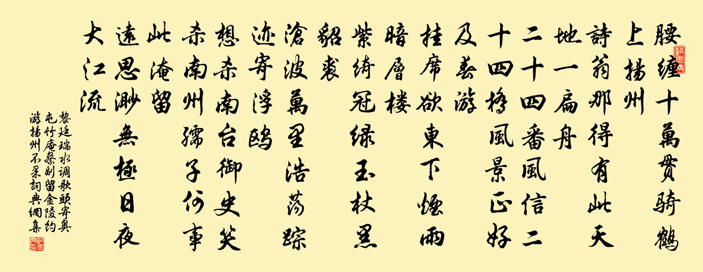 詩詞名句歷史字典書法欣賞書法字典國語詞典說文解字康熙字典古漢語字典標 題 作 者 詩 句 水調歌頭(寄奧屯竹庵察副留金陵約游揚州不果)作者:黎廷瑞 朝代:宋代原文腰纏十萬貫,騎鶴上揚州。詩翁那得有此,天地一扁舟。二十四番風信,二十四橋風景,正好及春遊。掛席欲東下,煙雨暗層樓。紫綺冠,綠玉杖,黑貂裘。滄波萬里,浩蕩蹤跡寄浮鷗。想殺南台御史,笑殺南州孺子,何事此淹留。遠思渺無極,日夜大江流。詩詞問答問:《水調歌頭(寄奧屯竹庵察副留金陵約游揚州不果)》的作者是誰?答:黎廷瑞問:該詩寫於哪個朝代?答:宋代問:該詩是什麼體裁?答:詞書法欣賞水調歌頭(寄奧屯竹庵察副留金陵約游揚州不果)書法作品詩詞推薦雁盪寶冠寺趙師秀〔宋代〕行向石欄立,清寒不可雲。流來橋下水,半是洞中雲。欲住逢年盡,因吟過夜分。盪陰當絕頂,一雁未曾聞。瑞鷓鴣王哲〔元代〕修行莫練外容紅。只要當中起赤心。從此能生木上火,自然養就水中金。瑤芳寶樹同相守,玉葉瓊枝共廝侵。休去戲答諸少年白居易〔唐代〕顧我長年頭似雪,饒君壯歲氣如雲。朱顏今日雖欺我,白髮他時不放君。官成武主簿作五首王禹偁〔宋代〕釋褐來成武,攜家別故鄉。北堂微祿及,南畝舊田荒。籬菊飛乎蝶,庭莎叫夜螿。無人慰孤寂,窗月自淒涼。和劉賓客玉蕣薛濤〔唐代〕瓊枝的皪露珊珊,欲折如披玉彩寒。閒拂朱房何所似,緣山偏映月輪殘。祝英台近·除夜立春吳文英〔宋代〕翦紅情,裁綠意,花信上釵股。殘日東風,不放歲華去。有人添燭西窗,不眠侵曉,笑聲轉、新年鶯語。舊尊俎。江神子令劉志淵〔元代〕山寒木葉暈輕黃。氣封商。露凝霜。萬物歸根,逆氣送荒涼。唯有東籬 * 綻,噴冰艷,吐清香。分明圓相顯重陽滿江紅 玉簪次班彥功韻張雨〔元代〕玉導纖長,頓化作、雲英香莢。風弄影、錄鬟撩亂,搔頭斜插。璞小還思釵燕並,叢幽略比蕉心狹。看柔須、點綴沁園春李道純〔元代〕身處玄門,不遇真師,徒爾勞辛。若絕學無為,爭知闔癖,多聞博學,寧脫根塵。固守自然,終成斷滅,著有著無春日二絕王炎〔宋代〕柳影人家燕子飛,東風落絮罥遊絲。欲題崔護桃花句,惆悵春深子滿枝。次桐廬鄭剛中〔宋代〕回舟逆水甚徐徐,尚距桐江百里餘。只有夢魂無阻礙,夜來先已到吾廬。水調歌頭林淳〔宋代〕瀟灑東湖上,夜雨洗清秋。朝來塵霽,凝望千里興悠悠。山色揉藍深染,波影青銅新鑄,□冷翠光浮。蓑笠真吾事慶元二年恭上太皇太后皇太后太上皇帝太上皇佚名〔宋代〕曾孫致養,五福駢臻。太極所運,兩備三辰。輝光日新,盧佑後人。永翼瑤圖,億萬堯春。早春即事白居易〔唐代〕眼重朝眠足,頭輕宿酒醒。陽光滿前戶,雪水半中庭。物變隨天氣,春生逐地形。北檐梅晚白,東岸柳先青。蔥壟有懷獨孤景略陸游〔宋代〕富貴世間元不乏,此君才大獨難成。喑嗚意氣千人廢,嫻雅風流一座傾。韜略豈勞平大敵,文章亦足主齊盟。荒山偈頌二百零五首釋正覺〔宋代〕泥泥水水一年農,收拾將來碓下舂。炊軟香分千缽飯,肚皮參飽放頹慵。被恩出使鄭獬〔宋代〕鏡湖清淺越山寒,好倚秋雲刮眼看。萬里塵沙卷飛雪,卻持漢節使呼韓。晚宿劉子翬〔宋代〕石瀨分流小,霜林間樹紅。暮橋橫隱約,寒鍛響丁東。賈佩蘭歌文同〔宋代〕綠髮憶新梳,君前侍玉壺。相隨五色鳳,飛止帝宮梧。鳳時入紫煙,一舉萬羽趨。乘風恣敖盪,眾首傾雲衢。帝既王察院輓詞二首陳師道〔宋代〕施報終何在,窮通共一空。兩言成益友,百代仰高風。終始無遺恨,恩榮托至公。不應埋直氣,會見吐長虹。名句推薦何當金絡腦,快走踏清秋。李賀《馬詩二十三首》 我愛山中夏,空冥花雨下。元鵬《山中四詠》 日射人間五色芝,鴛鴦宮瓦碧參差。元好問《浣溪沙·日射人間五色芝》 三更月。中庭恰照梨花雪。賀鑄《子夜歌·三更月》 翰林風月三千首,寄與吳姬忍淚看。劉著《鷓鴣天·雪照山城玉指寒》 戰戰慄栗,日慎一日,苟慎其道,天下可有。韓非及後人《韓非子·初見秦》 窮愁千萬端,美酒三百杯。李白《月下獨酌四首》 漸老念鄉國,先歸獨羨君。簡長《送僧南歸》 人稟七情,應物斯感,感物吟志,莫非自然。劉勰《文心雕龍·明詩》 自是荷花開較晚,孤負東風。幼卿《浪淘沙·極目楚天空》