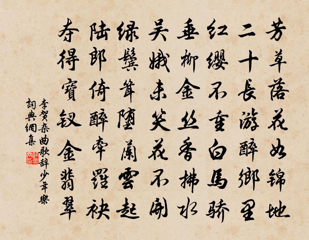 芳草落花如錦地,二十長游醉鄉里。紅纓不重白馬驕,垂柳金絲香拂水。