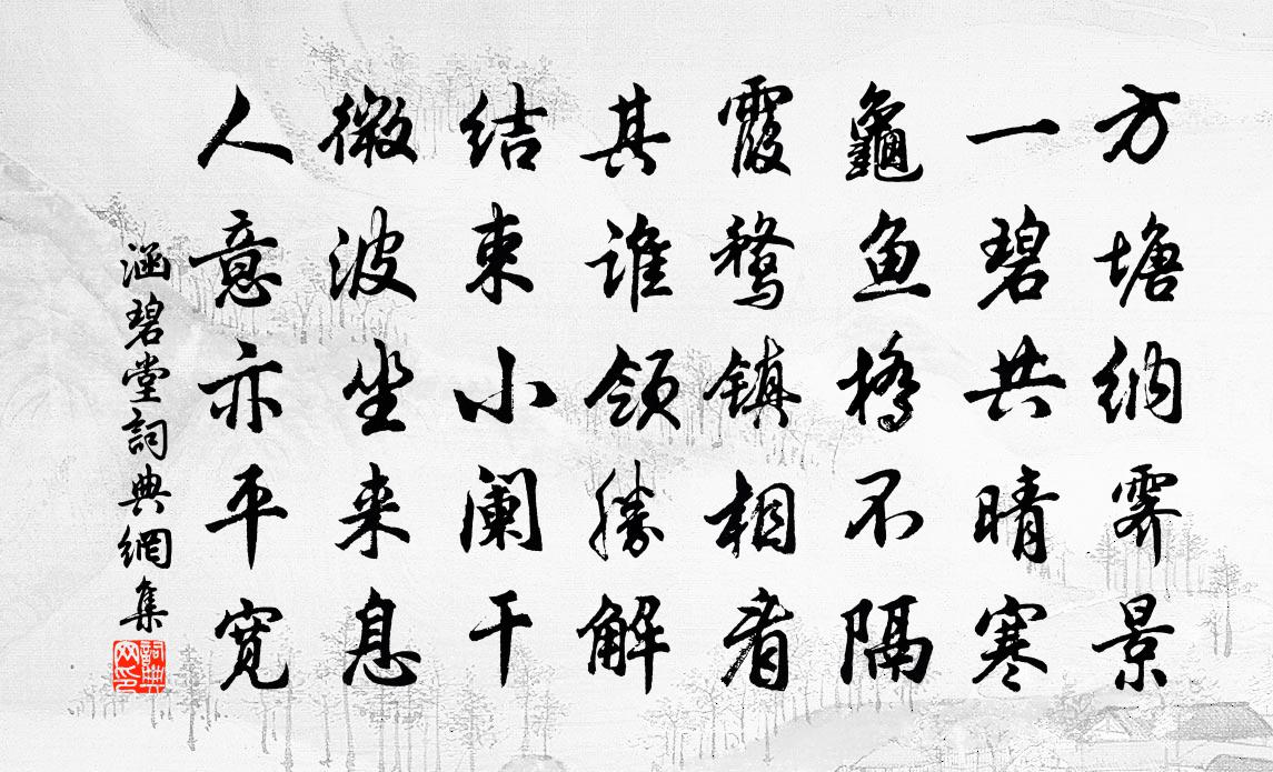 方塘納霽景,一碧共晴寒。龜魚橋不隔,霞鶩鎮相看。