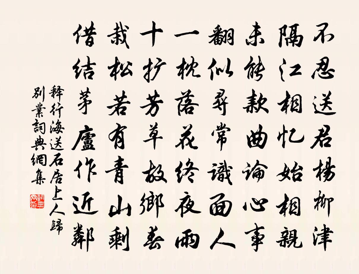 詩詞名句歷史字典書法欣賞書法字典國語詞典說文解字康熙字典古漢語字典標 題 作 者 詩 句 送石居上人歸別業作者:釋行海 朝代:宋代送石居上人歸別業原文不忍送君楊柳津,隔江相憶始相親。未能款曲論心事,翻似尋常識面人。一枕落花終夜雨,十擴芳草故鄉春。栽松若有青山剩,借結茅廬作近鄰。詩詞問答問:送石居上人歸別業的作者是誰?答:釋行海問:送石居上人歸別業寫於哪個朝代?答:宋代釋行海送石居上人歸別業書法欣賞送石居上人歸別業書法作品詩詞推薦游徑山蘇軾〔宋代〕眾峰來自天目山,勢若駿馬奔平川。中途勒破千里足,金鞭玉登相迴旋。人言山住水亦住,下有萬古蛟龍淵。道讀罪已詔楊萬里〔宋代〕亂起吾降日,吾將強仕年。中原仍夢裡,南紀且愁邊。陛下非常主,群公莫自賢。金台尚未築,乃至羨強燕。早春宋祁〔宋代〕春來人暗知,何物驗來時。林暖樹改色,山晴雲弄姿。歸鴻高的的,生浪細差差。老帥非行樂,劭農一駐旂。三月十四日陪同年十有六人游淨慈遂飲於水月喻良能〔宋代〕崇桃穠李亦不惡,一笑海棠尤可人。徐熙趙昌俱骨朽,翠袖卷綃誰寫真。台城路(餞乾壽道應舉)張炎〔宋代〕幾年槐市槐花冷,天風又還吹起。故篋重尋,閒書再整,猶記燈窗滋味。渾如夢裡。見說道如今,早催行李。快買鷓鴣天·送歐陽國瑞入吳中辛棄疾〔宋代〕莫避春陰上馬遲。春來未有不陰時。人情展轉閒中看,客路崎嶇倦後知。梅似雪,柳如絲。試聽別語慰相思。短篷辛丑歲七月赴假還江陵夜行塗口陶淵明〔魏晉〕閒居三十載,遂與塵事冥。詩書敦夙好,園林無世情。如何舍此去,遙遙至西荊!叩栧新秋月,臨流別友生。涼風浴佛釋悟本〔宋代〕今日當年佛降生,當年今日不多爭。若言八十還歸滅,有眼分明特地盲。初春夙興宋庠〔宋代〕戍城官柝應營笳,愁枕無眠感曙鴉。料峭風頭猶助凍,蒼涼天角欲成霞。離離弈局殘星墜,脈脈刀環片月斜。尚喜同州端午殷堯藩〔唐代〕鶴髮垂肩尺許長,離家三十五端陽。兒童見說深驚訝,卻問何方是故鄉。重陽日至峽道張籍〔唐代〕無限青山行已盡,回看忽覺遠離家。逢高欲飲重陽酒,山菊今朝未有花。昌年宮之作豆盧復〔唐代〕但有離宮處,君王每不居。旗門芳草合,輦路小槐疏。殿閉山煙滿,窗凝野靄虛。豐年多望幸,春色待鑾輿。石州慢 寄題龍首峰安熙〔元代〕龍蟠虎踞,朝楚暮秦,世路艱蹇。夕陽淡淡餘暉,閶闔九重天遠。千秋萬古,先天消長圖深,何人解識興亡本。夜鷺徐集孫〔宋代〕素狎沙鷗水國盟,一生蹤跡任飄零。漫夸霜雪精神別,難洗蝦魚氣習腥。點破青山成曉畫,飛來紅蓼稱秋汀。江湖壽母生朝四首項安世〔宋代〕兒孫遙指菊花辰,自訟庵中慶誕人。也向此旬同此日,八千秋對八千春。詠月佚名〔唐代〕天使下西樓,光含萬里秋。台前疑掛鏡,簾外似懸鉤。張尹將眉學,班姬取扇儔。佳期應借問,為報在刀頭。百四從妹輓詞樓鑰〔宋代〕去歲桐川弟,新從姊處歸。備言家慶事,猶著嫁時衣。尚欲尋松社,寧堪哭素幃。人生真一夢,回首事皆非。如夢令譚處端〔元代〕竹笠竹冠竹碗。與 * 常為伴。坐臥去來空,便是清涼彼岸。風漢。風漢。日月輪催不管。記三月十日西湖之游呂留卿主人孟君複方萬里方回〔宋代〕丙申上巳七日後,一主二賓夫豈偶。遣車卻騎錢塘門,主人滿船富餚酒。別喚輕船載僕從,大船品字著三友。旁觀乙亥老人生旦陳文蔚〔宋代〕兒願歲歲登斯堂,再拜為親扶壽觴。近思去歲生日時,膝下羅列兒孫行。更願明年似今日,酒面菊花如意黃。人間名句推薦鵲辭穿線月,花入曝衣樓。李賀《七夕》 壯歲從戎,曾是氣吞殘虜。陸游《謝池春·壯歲從戎》 明朝事與孤煙冷,做滿湖、風雨愁人。吳文英《渡江雲三犯·西湖清明》 剪不斷,理還亂,是離愁。別是一般滋味在心頭。李煜《相見歡·無言獨上西樓》 山中夜來月,到曉不曾看。元好問《倪莊中秋》 屏卻相思,近來知道都無益。王國維《點絳唇·屏卻相思》 君家玉女從小見,聞道如今畫不成。黃庭堅《謝張仲謀端午送巧作》 既生瑜,何生亮!羅貫中《三國演義·第五十七回》 土膏欲動雨頻催,萬草千花一餉開;范成大《春日田園雜興》 相識滿天下,知心能幾人?佚名《增廣賢文·上集》