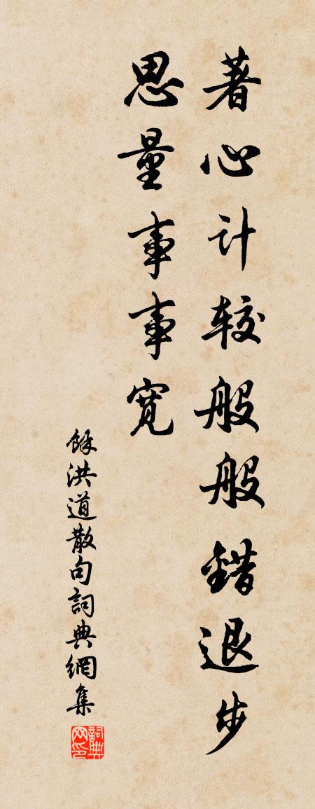 詩詞名句歷史字典書法欣賞書法字典國語詞典說文解字康熙字典古漢語字典標 題 作 者 詩 句 句作者:余洪道 朝代:宋代句原文著心計較般般錯,退步思量事事寬。詩詞問答問:句的作者是誰?答:余洪道問:句寫於哪個朝代?答:宋代余洪道句書法欣賞句書法作品詩詞推薦賀趙及卿黃定甫主賓聯名登第陳文蔚〔宋代〕人傑須知本地靈,鵝峰挺拔湛溪清。新添九桂叢芳茂,帝發一枝花更榮。文社只今傳盛事,宦途從此展修程。歸耕滿江紅 寄何繼先御史魏初〔元代〕落日何山,人好在、鳳凰城闕。還記否、長安城下,一杯離別。芳草連空春欲暮,落紅千片飄香雪。憶使君、昨日孟子生憂患死安樂陳普〔宋代〕路同平夷多折軸,或因危阻遂安全。吉凶豈必皆由命,畏玩之中各有天。部兵之秋丘道中懷寄彭城社友賀鑄〔宋代〕駕馬出北門,徒御何遲遲。日氣方洶湧,霜陰亦紛披。役夫前驅行,少婦痛不隨。分攜仰天哭,聲盡有餘悲。雖非偈三首釋祖元〔宋代〕雁山枯木實頭禪,不在尖新語句邊。背手忽然摸著著,長鯨吞月浪滔天。碁山院董淵〔宋代〕風際有雲多世態,海中無底是人心。可堪更問碁山話,一局閒爭古到今。讀齊己上人集(一作尚顏詩)尚顏〔唐代〕詩為儒者禪,此格的惟仙。古雅如周頌,清和甚舜弦。冰生聽瀑句,香發早梅篇。想得吟成夜,文星照楚天。偈頌二百零五首釋正覺〔宋代〕皓然雪月淨無埃,一色功中更放開。喚起牧童蓑底夢,白牛鼻孔拽教回。太上皇帝靈駕發引輓歌詞六首范成大〔宋代〕自將吳津騎,誰嬰泰一鋒。旄頭連夜落,京觀隔江封。舞武三成備,書文九譯重。修攘遺策在,嗣聖續車攻。送房元直赴北京嚴維〔唐代〕猶道樓蘭十萬師,書生匹馬去何之。臨岐未斷歸家目,望月空吟出塞詩。常欲激昂論上策,不應憔悴老明時。遙知答惠牡丹方岳〔宋代〕不識桃花過一年,已甘無分牡丹邊。開園肯剪夜欄雨,抱瓮亟分山澗泉。書室乍驚春富貴,草廬誰結酒因緣。如聞代張元老上許漕李新〔宋代〕文章摛錦已堆胸,直指威聲府仰中。蜀部星高千幛靜,平輿龍起一淵空。閱人妙學函明鏡,飛鏑清心本素風。垂手送司馬池歸夏台魏野〔宋代〕芳草垂楊弄色初,山中好酒想躊踟。他時駟馬乘如祖,莫忘今朝跨蹇驢。孟子井未及泉陳普〔宋代〕井深九仞已勞功。未及於泉等是空。學問垂成還自棄,有為何異不為同。初到郡齋三首宋祁〔宋代〕我里誠雲樂,公今況釋勞。秋蒪不下豉,霜蟹恣持螯。林靜來晨燎,江喧入夜濤。功成奮嘉藻,寧欲傍離騷。寄內兄和州崔員外十二韻杜牧〔唐代〕歷陽崔太守,何日不含情。恩義同鍾李,塤篪實弟兄。光塵能混合,擘畫最分明。台閣仁賢譽,閨門孝友聲。西方思歸宋祁〔宋代〕刻意傷春屬暮樓,江皋歸棹悵夷猶。青蘿怨鶴英山曉,疏笛吟龍臥塢秋。掩泣泥陽思祖廟,長懷彭澤廢先疇。裂繻游壽安山示二子熙顥程珦〔宋代〕藏拙歸來已十年,身心世事不相關。洛陽山水尋須遍,更有何人似我閒。西齋遣興陸游〔宋代〕桐葉秋先霣,菊花寒更香。酒邊聊兀兀,身外本茫茫。小憩元非睡,長吟偶似狂。忽然思把卷,一笑就窗光。晚望曾鞏〔宋代〕蠻荊人事幾推移,舊國興亡欲問誰。鄭袖風流今已盡,屈原辭賦世空悲。深山大澤成千古,暮雨朝雲又一時。落日名句推薦山遠翠眉長。高處淒涼。菊花清瘦杜秋娘。吳文英《浪淘沙·九日從吳見山覓酒》 守分安命,順時聽天。朱柏廬《朱子家訓·全文》 夜寒驚被薄,淚與燈花落納蘭性德《菩薩蠻·蕭蕭幾葉風兼雨》 西湖春色歸,春水綠於染歐陽修《春日西湖寄謝法曹歌》 睡里消魂無說處。覺來惆悵消魂誤。晏幾道《蝶戀花·夢入江南煙水路》 正身直行,眾邪自息。劉安及其門客《淮南子·繆稱訓》 鎮日思歸歸未得,孤負殷勤杜宇。王瀾《念奴嬌·避地溢江書於新亭》 應難奈,故人天際,望徹淮山,相思無雁足。史達祖《八歸·秋江帶雨》 又說今夕天津,西畔重歡遇。吳文英《荔枝香近·七夕》 書劍時將晚,丘園日已暮。孟浩然《田園作》
