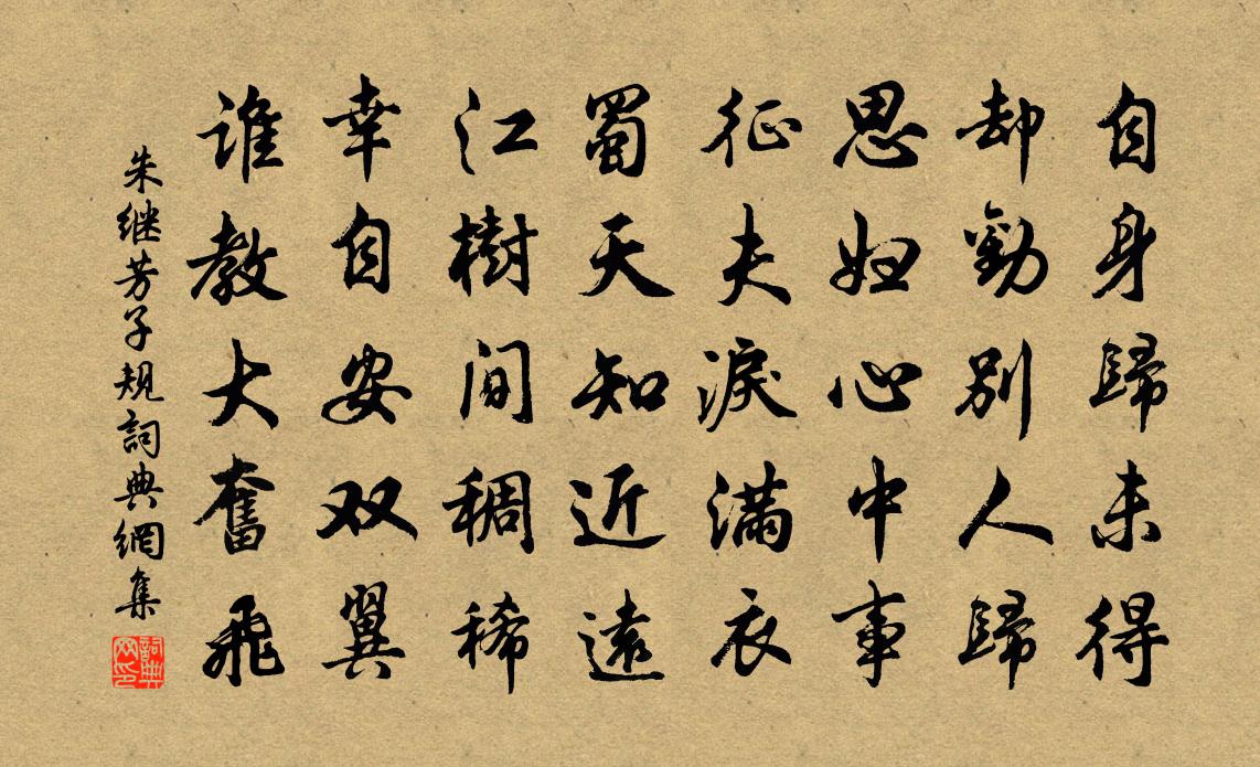 詩詞名句歷史字典書法欣賞書法字典國語詞典說文解字康熙字典古漢語字典標 題 作 者 詩 句 子規作者:朱繼芳 朝代:宋代子規原文自身歸未得,卻勸別人歸。思婦心中事,征夫淚滿衣。蜀天知近遠,江樹間稠稀。幸自安雙翼,誰教大奮飛。詩詞問答問:子規的作者是誰?答:朱繼芳問:子規寫於哪個朝代?答:宋代朱繼芳子規書法欣賞子規書法作品詩詞推薦別表兄軍倅許渾〔唐代〕盧橘花香拂釣磯,佳人猶舞越羅衣。三洲水淺魚來少,五嶺山高雁到稀。客路晚依紅樹宿,鄉關朝望白雲歸。交親普天樂·浙江秋姚燧〔元代〕浙江秋,吳山夜。愁隨潮去,恨與山疊。寒雁來,芙蓉謝。冷雨青燈讀書舍,怕離別又早離別。今宵醉也,明朝去再答明略二首黃庭堅〔宋代〕挾策讀書計餬口,故人南箕與北斗。江南江北萬重山,千里寄書聲不還。當時朱弦寫心曲,果在高山深水間。沽桐湖西雜感詩釋智圓〔宋代〕鳳為時瑞世傳名,及現郊村眾盡驚。喚作怪禽宜彈殺,始知流俗重虛聲。夏日覽物思古人三首陶潛韓維〔宋代〕眾鳥依嘉樹,想像先生居。日喔高簡篇,濁酒自為娛。世事不掛口,方且愛吾廬。頌古四首釋行機〔宋代〕葉落崗頭一望長,幾莖喬木倚斜陽。曾經巴峻猿啼處,鐵打心肝寸斷腸。滿庭芳佚名〔宋代〕 * 正飄香。郡中言懷寄西川蕭員外羊士諤〔唐代〕功名無力愧勤王,已近終南得草堂。身外盡歸天竺偈,腰間唯有會稽章。何時臘酒逢山客,可惜梅枝亞石床。歲晚句石姥寄客〔宋代〕水暖眠秧珥,風香豎茗旗。長信宮 [一作孟遲詩]趙嘏〔唐代〕君恩已盡欲何歸,猶有殘香在舞衣。自恨身輕不如燕,春來長繞御簾飛。滿江紅(甲申春侍親來利州道間)李曾伯〔宋代〕袞袞青春,都只恁、堂堂過了。才解得,一分春思,一分春惱。兒態尚眠庭院柳,夢魂已入池塘草。問不知、春意李修伯山居真山民〔宋代〕寒燈幾撥盡,借問夜何其。舊夢青燈在,新愁白髮知。昔為三繞鵲,今作五藏龜。多謝梅梢月,留人得睡遲。怡齋陸游〔宋代〕東湖仲夏草樹荒,屋古無人亭午涼。萱房微呀不見日,筍籜自解時吹香。野藤蟠屈入窗罅,濕菌扶疏生屋樑。跨溝寄題張著作頌堂司馬光〔宋代〕玉壘老先生,逍遙樂太平。門闌百客盛,冠蓋一鄉榮。國族如邀近,堂皇指顧我。江山對平遠,圖史散縱橫。止水早春憶蘇州寄夢得白居易〔唐代〕吳苑四時風景好,就中偏好是春天。霞光曙後殷於火,水色晴來嫩似煙。士女笙歌宜月下,使君金紫稱花前。誠知八月十一夜風月可愛自前屋覓酒不得而歸小詩杜范〔宋代〕晚煙輕拂亂山橫,落日才收月已明。萬頃孤光低闊野,一天寒色帶疎星。交情要與秋容淡,攜手難禁夜氣清。慣識從歐陽全真借觀陳擇之蜀中詩題其後趙蕃〔宋代〕書去方懷蜀道長,寄憶未達忽傳亡。那知今夕辰陽郡,灑淚殘詩十數章。偈頌一百零九首釋可湘〔宋代〕瞿曇出母胎,膽志大如斗。方學小兒行,便作獅子吼。水在湖,杓慶手,乘時盪向無何有。也勝雲門老古錐,藥囊偈六十三首釋道寧〔宋代〕門外春將暮,園林華木殘。靈雲訊息在,遊子莫{滿氵換頁}頇。雲舒四野,雨瀉長空。花落花開,春來春去。往丁巳啟建二首劉克莊〔宋代〕有意祝靈椿,無堪獻野芹。玉杯真繆巧,金鏡最忠勤。名句推薦不怨天,不尤人。孔子弟子《論語·憲問篇》 教婦初來,教兒嬰孩。顏之推《顏氏家訓·教子篇》 強本而節用,則天不能貧。荀子《荀子·天論》 世所相信,在能行,不在能言。王永彬《圍爐夜話·第九九則》 兒女紛紛夸結束,新樣釵符艾虎。劉克莊《賀新郎·端午》 長江春水綠堪染,蓮葉出水大如錢。張籍《春別曲》 年年送客橫塘路,細雨垂楊系畫船。范成大《橫塘·南浦春來綠一川》 洞庭一夜無窮雁,不待天明盡北飛。李益《春夜聞笛》 欲黃昏。雨打梨花深閉門。李重元《憶王孫·春詞》 漸老多憂百事忙,天寒日短更心傷。李覯《秋晚悲懷》