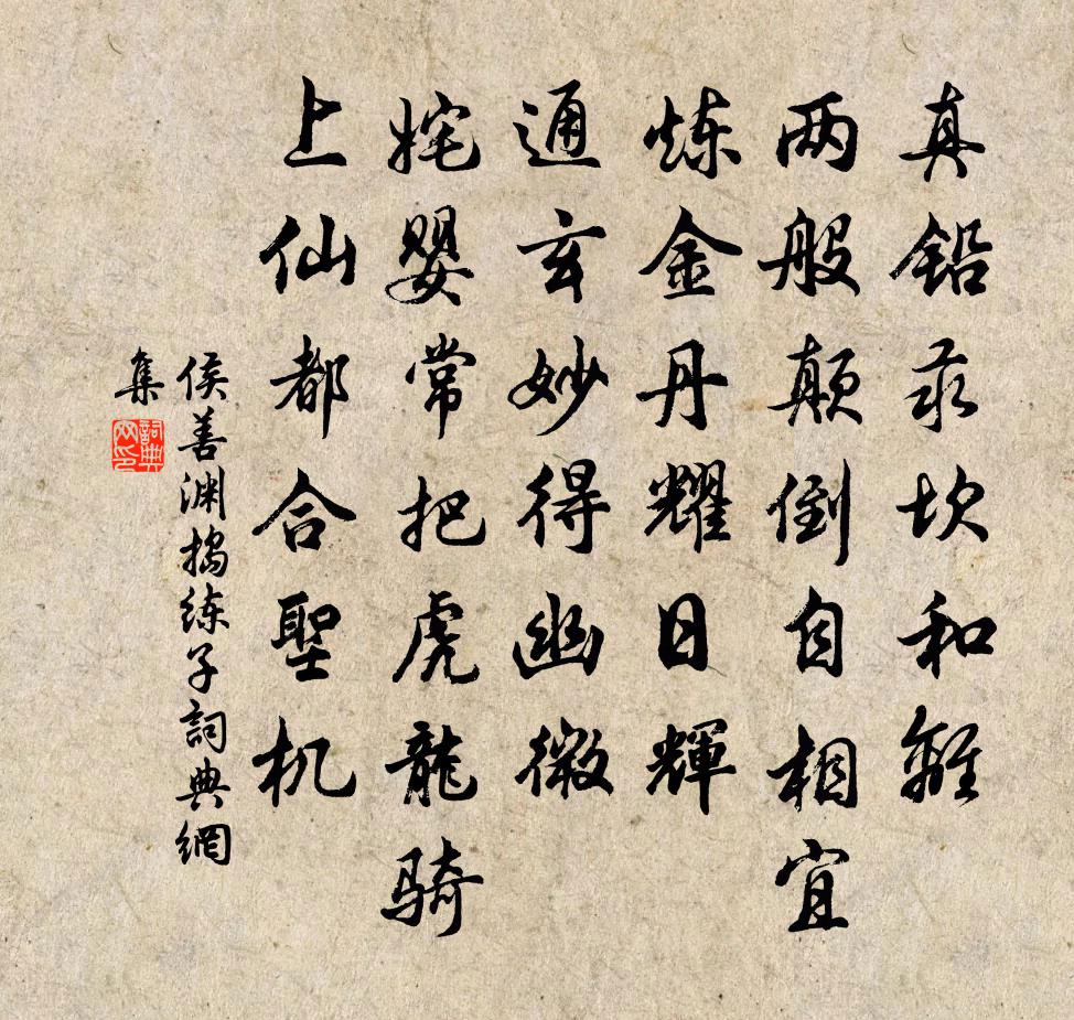 詩詞名句歷史字典書法欣賞書法字典國語詞典說文解字康熙字典古漢語字典標 題 作 者 詩 句 搗練子作者:侯善淵 朝代:元代搗練子原文真鉛汞,坎和離。兩般顛倒自相宜。鍊金丹,耀日輝。通玄妙,得幽微。奼嬰常把虎龍騎。上仙都,合聖機。詩詞問答問:搗練子的作者是誰?答:侯善淵問:搗練子寫於哪個朝代?答:元代問:搗練子是什麼體裁?答:詞侯善淵搗練子書法欣賞搗練子書法作品詩詞推薦送鄔文伯歸侍臨川二首史彌寧〔宋代〕易學寥寥一線然,誰人口裡說先天。近來惟有朴齋老,白首焚薌尚草玄。逍遙詠宋太宗〔宋代〕虛無入有何蹤跡,非是神光化金液。廓落方圓在杳冥,南來北去斷訊息。次韻陸務觀編修新津遇雨,不得登修覺山,徑范成大〔宋代〕離合紛紛怕遠遊,遠遊仍怕賦登樓。何須一望三千里,望盡西州轉更愁。秋日江郎道中柴元彪〔宋代〕豆花疏雨浥輕埃,野店新涼入酒杯。草帶淡煙棲古道,樹含斷靄翳荒台。湖光隱見萍分合,山色有無雲去來。滿眼苦雨陸游〔宋代〕煙水茫無際,空階滴不休。一窗閒隱几,四月澹如秋。箔冷蠶遲績,泥深麥未收。家貧村酒薄,曷解老農憂?豫讓論方孝孺〔明代〕士君子立身事主,既名知己,則當竭盡智謀,忠告善道,銷患於未形,保治於未然,俾身全而主安。生為名臣,死小溪至新田四首楊萬里〔宋代〕懊惱春光欲斷腸,來時長緩去時忙。落紅滿路無人惜,蹈作花泥透腳香。醉游平泉白居易〔唐代〕狂歌箕踞酒尊前,眼不看人面向天。洛客最閒唯有我,一年四度到平泉。謁金門辛棄疾〔宋代〕山吐月。畫燭從教風滅。一曲瑤琴才聽徹。金蕉三兩葉。驟雨微涼還熱。似欠舞瓊歌雪。近日醉鄉音問絕。有時清河陽秋思六首宋庠〔宋代〕芳序雖雲晚,華顛亦已新。蛩鳴偏傍耳,燕去不辭人。山隱棲岩路,朝嬰佩玉身。故溪應更好,前夜夢垂綸。初築南齋蘇轍〔宋代〕我老不自量,築室盈百間。舊屋收半料,新材伐他山。盎中粟將盡,橐中金亦殫。涼風八月高,扶架起南邊。首成龍井十題坤泉釋元淨〔宋代〕物外老餘生,泉發幽岩里。自可給瓶盂,不羨滄溟水。頌古二十六首釋嗣宗〔宋代〕不是心兮不是物,那吒夜入蒼龍窟。鐵鞭擊碎明月珠,從教大地如翻墨。秋懷三首周麟之〔宋代〕燕雲簾帷靜,蛩鳴機杼忙。淒風萬籟息,夜月一奩光。自喜襟懷豁,寧為景物傷。幽窗有佳致,坐挹桂花香。彭心齋諱逢源自作頌呈師師於一句下加三句釋印肅〔宋代〕左右逢源,大目犍連。猿抱子歸青嶂裹,鳥銜花落碧岩前。再用韻和葦航蒲壽宬〔宋代〕長江不直一杯寬,自笑狂生筆力慳。有酒何須夸戲馬,繞籬豈必強登山。世無劉表誰知己,人說淵明我厚顏。風雨元日吳錫疇〔宋代〕寂寞柴門賀客疏,已輸漸後飲屠蘇。花情柳思開新歲,竹簡 * 只故吾。獻楚有誰能辨玉,求齊正自不工竽。朝來橫山寺楞伽塔詩周南〔宋代〕白傳遊春得幾回,寺門還對海門開。行人莫部橫山塔,曾見開皇混一來。嘲蛩葛紹體〔宋代〕浮沙籬落亂鳴蛩,永夜相尋客夢中。儘是秋風借餘力,聲聲卻似怨秋風。感塞薛逢〔唐代〕滿塞旌旗鎮上游,各分天子一方憂。無因得見歌舒翰,可惜西山十八州。名句推薦小桃無主自開花,菸草茫茫帶曉鴉。戴復古《淮村兵後》 西風潑眼山如畫,有黃花休恨無錢。張可久《風入松·九日》 望千門如晝,嬉笑遊冶。周邦彥《解語花·上元》 禁里疏鍾官舍晚,省中啼鳥吏人稀。王維《酬郭給事 / 贈郭給事》 不言之教,無為之益,天下希及之。老子《老子·德經·第四十三章》 自從明宰投巫後,直至如今鬼不神汪遵《西河》 反者道之動;弱者道之用。老子《老子·德經·第四十章》 野火燒不盡,春風吹又生。白居易《草 / 賦得古原草送別》 故聖人為法,必使之明白易知,名正,愚知遍能知之商鞅《商君書·定分》 不堪腸斷思鄉處,紅槿花中越鳥啼。李德裕《謫嶺南道中作》