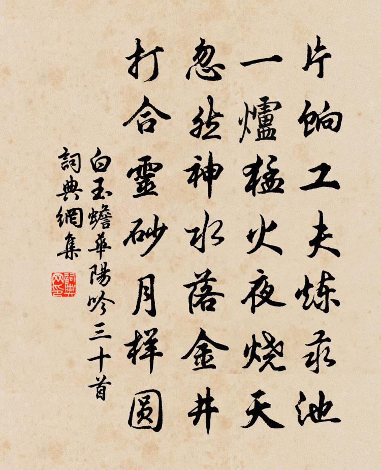 詩詞名句歷史字典書法欣賞書法字典國語詞典說文解字康熙字典古漢語字典標 題 作 者 詩 句 華陽吟三十首作者:白玉蟾 朝代:宋代華陽吟三十首原文片餉工夫鍊汞池,一爐猛火夜燒天。忽然神水落金井,打合靈砂月樣圓。詩詞問答問:華陽吟三十首的作者是誰?答:白玉蟾問:華陽吟三十首寫於哪個朝代?答:宋代問:華陽吟三十首是什麼體裁?答:七絕白玉蟾華陽吟三十首書法欣賞華陽吟三十首書法作品詩詞推薦南朝劉筠〔宋代〕華林酒滿勸長星,青漆樓高未稱情。麝壁燈回偏照晝,雀航波漲欲浮城。鐘聲但恐嚴妝晚,衣帶那知敵國輕。千古餘明遠訂游廬山董嗣杲〔宋代〕清談得子夜已中,彼此歷敘平生窮。知子曾為四明客,亦曾獻賦明光宮。萬人海里不相逢,狂游卻向江城同。尋盟六絕句呈趙帥兼簡鄭機宜陳造〔宋代〕玉筍班中第一流,冰花影里釂瓊舟。來遲輸與花前客,袖手看公筆不休。雜詠一百首曹騰劉克莊〔宋代〕費亭侯在日,亂已有萌芽。養得螟蛉種,猶能覆漢家。和餘子美即事二首黃公度〔宋代〕黌堂歸去葛衣輕,怪底形容太瘦生。抖擻慳囊償酒債,安排嶮韻主詩盟。妖韶梅老自餘態,滋味韓休薄大羹。強策苗而秀/採桑子賀鑄〔宋代〕吳都佳麗苗而秀。燕樣腰身。按舞華茵。促遍涼州、羅襪未生塵。□□□□□□透。歌怨眉顰。張燕宜頻。□□□琴鶴二詩送賈治安同知 其一王冕〔元代〕猗猗綠綺琴,中秘雲和音。一彈動鳴玉,再彈鏘南金。翩翩玄鶴舞,幽幽孤鳳鳴。嗟哉塵俗耳,折揚聽哇淫。淳源阿奇晬日戴復古〔宋代〕窮居少生涯,養子如種穀。寸苗方在手,想像秋禾熟。吾兒天所惠,骨相頗豐碩。娟娟懷抱中,一歲至週日。願汝白澤荷花李大同〔宋代〕故老相傅白澤湖,旌陽一濯潔難污。只今尚見荷花在,未識神仙更有無。獨宿山中薛嵎〔宋代〕澗水松風聲不斷,白雲飛上屋頭棲。山中昨夜孤吟客,只把無眠便作題。憑欄人姚燧〔元代〕欲寄君衣君不還,不寄君衣君又寒。寄與不寄間,妾身千萬難。釋奠齋宿袁說友〔宋代〕雲高天白夜沉沉,牆外誰家送遠砧。有月林梢鳴翠羽,無風窗下落黃金。百年已老安仁鬢,三徑空懷靖節心。病眼又和金克家送春吳芾〔宋代〕春來縱使日銜杯,老去逢春能幾回。幸有良朋同雅集,不妨爛醉罄余罍。羞看落絮愁盈抱,強對殘花淚滿腮。惆悵送吳航楊億〔宋代〕井臼荒涼旅鬢斑,經年索米住長安。囊中賣賦金都盡,衣上悲秋淚不乾。客路飄蓬殊未定,侯門置醴豈成歡。擔簦和文潛二首晁補之〔宋代〕阮籍空貪步兵酒,陽城猶戀集賢書。飽知世事非人力,可是因玄更泊如。謁金門張樞〔宋代〕春夢怯。人靜玉閨平帖。睡起眉心端正貼。綽枝雙杏葉。重整金泥蹀躞。紅皺石榴裙褶。款步花陰尋蛺蝶。玉纖和送祠部劉儀文知潁州孔武仲〔宋代〕厭逐京師車馬塵,乞為林下水邊人。江湖入夢歸心壯,道路生輝使節新。豈弟宜民推善政,清閒無訟稱天真。如聞用餘子畏韻其詩有警句雲若知瓦礫真成道便覺陳藻〔宋代〕少長城闉老一村,平生好語不曾聞。百年馬鬣空埋我,三載鰲頭更祝君。幸有鄰僧分隙地,豈無座主識雄文。須臾塞翁吟陳坦之〔宋代〕遠碧秋痕瘦,楚玉恨賦淒涼。荷雨碎,泣殘妝。系愁在垂陽。秋衣拂疊仙梔露,裁雲刀尺猶香。詩錦字,獻明璫。寄李十四員外布十二韻杜甫〔唐代〕名參漢望苑,職述景題輿。巫峽將之郡,荊門好附書。遠行無自苦,內熱比何如。正是炎天闊,那堪野館疏。黃牛名句推薦此時相望不相聞,願逐月華流照君。張若虛《春江花月夜》 舉大事,必慎其終始戴聖《禮記·文王世子》 客子光陰詩卷里,杏花訊息雨聲中。陳與義《懷天經智老因訪之》 草木也知愁,韶華竟白頭。曹雪芹《唐多令·柳絮》 今夜故人來不來,教人立盡梧桐影。呂岩《梧桐影·落日斜》 黃霧漲天雪晦冥,黑雲拂地風膻腥沈約《昭君辭》 將在外,君命有所不受畢沅《續資治通鑑·元紀·元紀三十》 文章本天成,妙手偶得之。陸游《文章》 舊遊無處不堪尋。無尋處,惟有少年心。章良能《小重山·柳暗花明春事深》 至道深微,惟人是弘李大師、李延壽《南史·本紀·卷四》