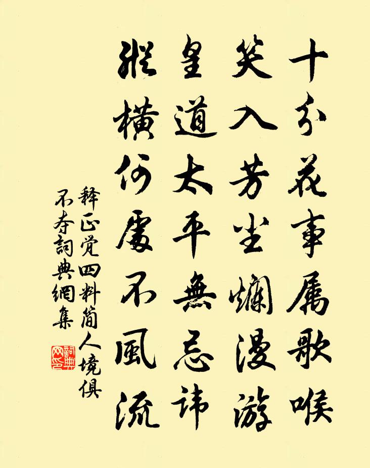 詩詞名句歷史字典書法欣賞書法字典國語詞典說文解字康熙字典古漢語字典標 題 作 者 詩 句 四料簡人境俱不奪作者:釋正覺 朝代:宋代四料簡人境俱不奪原文十分花事屬歌喉,笑入芳塵爛漫遊。皇道太平無忌諱,縱橫何處不風流。詩詞問答問:四料簡人境俱不奪的作者是誰?答:釋正覺問:四料簡人境俱不奪寫於哪個朝代?答:宋代釋正覺四料簡人境俱不奪書法欣賞四料簡人境俱不奪書法作品詩詞推薦偈頌三十四首釋如淨〔宋代〕雲開山嶽露,雨過色新鮮。翟曇不出世,敗闕未生前。天上天下,賊是小人。三拜起來澆惡水,謾將掩彩當殷勤。代門生作立春書門貼子詩四首范成大〔宋代〕有喜何須藥,無塵即是仙。壺中春日月,聊數八千年。蕭灑桐廬郡十絕范仲淹〔宋代〕蕭灑桐廬郡,全家長道情。不聞歌舞事,繞舍石泉聲。贈寶勝主僧李處權〔宋代〕木落山重重,溪長雨霏霏。雲慘傷客容,風饕裂征衣。我行已千里,恨無羽翰飛。倒帆近古寺,煙鍾深翠微。明軒送正言楊學士之任縉雲王禹偁〔宋代〕弱冠珥朝簪,才堪入翰林。重違君厚遇,聊奉母懽心。筆削留惇史,囊裝貯賜金。帆張淛河闊,山對括蒼深。暫歇題安流亭衛博〔宋代〕劍潭百尺深,中有神物蟠。東注駢山腳,鑿鑿穿巑屼。廣擬一葦航,聲戰兩耳寒。異哉黃頭郎,放棹隨飛湍。勢若題永慶壁有雱遺墨數行王安石〔宋代〕永慶招提墨數行,歲時風露每淒傷。殘骸豈久人間世,故有情鍾未可忘。次韻郭刪定觀潮四絕喻良能〔宋代〕白浪初看雲出門,驚濤旋見大江奔。不因江海雷霆斗,安識蛟龍窟宅尊。劉遜子架閣餉江茶方岳〔宋代〕琵琶亭下春寒夜,濕盡青衫竟為誰。江草江花恨何極,雪甌如此卻無詩。尚書郎上直聞春漏周徹〔唐代〕建禮通華省,含香直紫宸。靜聞銅史漏,暗識桂宮春。滴瀝疑將絕,清泠發更新。寒聲臨雁沼,疏韻應雞人。迥入掃花游(贈芸隱)吳文英〔宋代〕草生夢碧,正燕子簾幃,影遲春午。倦茶薦乳。看風簽亂葉,老沙昏雨。古簡蟫篇,種得雲根療蠹。最清楚。帶明題永康縣山光閣李新〔宋代〕吹鬢東風可但寒,倦飛孤鶴已知還。花光弄暖翻承雪,雲翼回陰卻見山。野水曲行林下綠,春禽喚出夢中閒。欲營金潤玉隱廢寺間居黃庚〔宋代〕梵剎當年聚眾僧,叢林深處著禪扃。金沙布地階無土,玉軸堆函藏有經。雲樹千尋張翠蓋,煙蘿一片殿青屏。星移相和歌辭飛來雙白鶴虞世南〔唐代〕飛來雙白鶴,奮翼遠凌煙。雙棲集紫蓋,一舉背青田。颺影過伊洛,流聲入管弦。鳴群倒景外,刷羽閬風前。映海滿江紅佚名〔宋代〕今日明朝,三月旦、又將來了。欣岳降、寶香薰夜,玉麟頒曉。一面久勞公鎮撫,三年活卻人多少。幸借留、重許次韻杜監簿方岳〔宋代〕不須把淺不防秋,底事山樵亦過憂。說與諸公那解此,但知兩角戰蝸牛。仙人李賀〔唐代〕彈琴石壁上,翻翻一仙人。手持白鸞尾,夜掃南山雲。鹿飲寒澗下,魚歸清海濱。當時漢武帝,書報桃花春。峻極上院晁說之〔宋代〕山下青青春已歸,百花山上正芳菲。人間顏色易零落,百萬千年雲錦衣。筍絕句陸游〔宋代〕列仙閱世獨清臞,雪谷冰溪老不枯。輸與錦繃孩子輩,千金一束入天廚。再和項安世〔宋代〕嘆息五陵翁仲,春來草路長堙。鉅鹿空懷故將,海山空著詩人。名句推薦酒債尋常行處有,人生七十古來稀。杜甫《曲江二首》 好風朧月清明夜,碧砌紅軒刺史家。白居易《清明夜》 願隨孤月影,流照伏波營。沈如筠《閨怨二首·其一》 後庭花一曲,幽怨不堪聽。劉禹錫《金陵懷古》 相逢不飲空歸去,洞口桃花也笑人。佚名《增廣賢文·上集》 嘆年光過盡,功名未立,書生老去,機會方來。劉克莊《沁園春·夢孚若》 低頭弄蓮子,蓮子清如水佚名《雜曲歌辭·西洲曲》 深村時節好,應為去年豐。范成大《寒食郊行書事》 昔年多病厭芳尊,今日芳尊惟恐淺。錢惟演《木蘭花·城上風光鶯語亂》 山河破碎風飄絮,身世浮沉雨打萍。文天祥《過零丁洋》