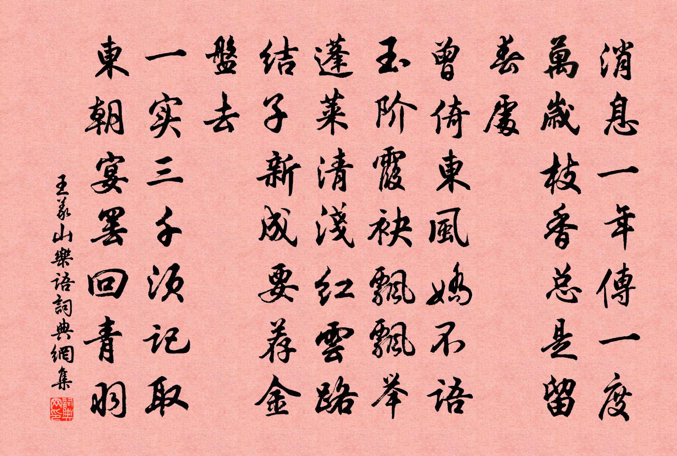 詩詞名句歷史字典書法欣賞書法字典國語詞典說文解字康熙字典古漢語字典標 題 作 者 詩 句 樂語作者:王義山 朝代:宋代樂語原文訊息一年傳一度。萬歲枝香,總是留春處。曾倚東風嬌不語。玉階霞袂飄飄舉。蓬萊清淺紅雲路。結子新成,要薦金盤去。一實三千須記取。東朝宴罷回青羽。詩詞問答問:樂語的作者是誰?答:王義山問:樂語寫於哪個朝代?答:宋代問:樂語是什麼體裁?答:詞王義山樂語書法欣賞樂語書法作品詩詞推薦次韻公辟將受代書蓬萊閣秦觀〔宋代〕城連湖岸水為關,旦暮樵風自往還。龜負寶林新佛地,龍蟠使宅老仙山。平生仕宦今何得,終日登臨獨未閒。歲滿親仁里居姚合〔唐代〕三年賃舍親仁里,寂寞何曾似在城。飲酒自緣防冷病,尋人多是為閒行。軒車無路通門巷,親友因詩道姓名。自別閣皂山道士晏時中過我南浦久之告歸三首曾豐〔宋代〕忘家未足更忘形,散客孤雲跡不停。三楚江山心未飽,七閩泉石眼初醒。連山王開詩試子午花四首陳著〔宋代〕嫩綠扶疏紅倒垂,紅閒黃染數莖絲。牢存本色心為主,懶競時妝面向誰。受二氣中開止晝,當三伏里傲炎曦。陰崖再用韻十首楊公遠〔宋代〕骨相寒如許,那封萬戶侯。紅顏非藉酒,白雪未蒙頭。事少渾無夢,身閒豈有愁。老天能覆我,飽暖四宜休。挽吳春卿舍人喻良能〔宋代〕出處平生似昔賢,高風勁節凜朝端。回天議論心無歉,脫腕文章世所難。斫鐵叫天蠻獠服,調羹滿缽里閭歡。定應偈六十九首釋道寧〔宋代〕宗門奧旨,造者還稀。體用無私,隨流得妙。有時互為生,伴敲唱玄風。有時對面藏,身難窺影跡。要津把斷,凡憶秦娥·季溫老友歸樵陽人來閒書因以為寄孫道絢〔宋代〕秋寂寞。秋風夜雨傷離索。傷離索。老懷無奈,淚珠零落。故人一去無期約。遲書忽寄西飛鶴。西飛鶴。故人何在怨王孫/憶王孫佚名〔宋代〕夢斷漏悄。愁濃酒惱。寶枕生寒,翠屏向曉。門外誰掃殘紅。夜來風。玉簫聲斷人何處。春又去。忍把歸期負。此送王敦素鄧深〔宋代〕龍蟠山色引衡廬,霜落江清影碧虛。鼓枻厭騎沙苑馬,行廚飫食武昌魚。緩歌玉樹翻新曲,趣入金鑾續舊書。官達樂府雜曲。鼓吹曲辭。戰城南二首貫休〔唐代〕萬里桑乾傍,茫茫古蕃壤。將軍貌憔悴,撫劍悲年長。胡兵尚陵逼,久住亦非強。邯鄲少年輩,個個有伎倆。拖槍暮春陳德永〔元代〕山館青春老,溪扉白露斜。微風起新絮,小雨落余花。蜜滿蜂登課,泥香燕作家。物情猶好在,人事益紛拏。次韻許志仁王之道〔宋代〕我技類族庖,用刀常月更。君才妙天下,遊刃得我驚。前年獲相值,因憶吳中行。一別忽兩載,依然舊交情。新詩送張少卿赴召十首李新〔宋代〕張公論事力回天,明日延英席自前。秦甸江西勞馬策,此回不計地流錢。望蓬萊 道友修庵馬鈺〔元代〕丘與馬,入道絕貪求。欲報師恩常念念,三年守服豈能休。何處好藏頭。舊居址,深謝許同修。但願我公同我志,送人南遊施肩吾〔唐代〕見說南行偏不易,中途莫忘寄書頻。凌空瘴氣墮飛鳥,解語山魈惱病人。閩縣綠娥能引客,泉州烏藥好防身。異花沙苑南渡頭王昌齡〔唐代〕秋霧連雲白,歸心浦漵懸。津人空守纜,村館復臨川。篷隔蒼茫雨,波連演漾田。孤舟未得濟,入夢在何年?寒食夜白居易〔唐代〕無月無燈寒食夜,夜深猶立暗花前。忽因時節驚年幾,四十如今欠一年。長相思(題甘樓)胡翼龍〔宋代〕南山鍾。北山鍾。一聲鐘聲百念空。古今昏曉中。望秋風。數秋風。等得秋來等過鴻。燈前書一封。母氏生日陰晴晏溫夜後雖小雨或作或止而帖然孫應時〔宋代〕草草稱觴壽我親,每慚天意俯從人。連宵又似去的雨,淑景偏回此日春。富貴何如長得健,詩書元自不羞貧。秫田名句推薦疏影橫斜水清淺,暗香浮動月黃昏。林逋《山園小梅·其一》 明月淨松林,千峰同一色。歐陽修《自菩提步月歸廣化寺》 慘慘時節盡,蘭葉復凋零。徐幹《室思》 日日望鄉國,空歌白薴詞。張籍《薊北旅思 / 送遠人》 涼月如眉掛柳灣,越中山色鏡中看。戴叔倫《蘭溪棹歌》 故知之始己,自知而後知人也。王詡《鬼谷子·反應》 籌邊獨坐,豈欲登覽快雙眸。戴復古《水調歌頭·題李季允侍郎鄂州吞雲樓》 不信樓頭楊柳月,玉人歌舞未曾歸。謝枋得《蠶婦吟》 借得山東煙水寨,來買鳳城春色施耐庵《念奴嬌·天南地北》 殘月臉邊明,別淚臨清曉牛希濟《生查子·春山煙欲收》