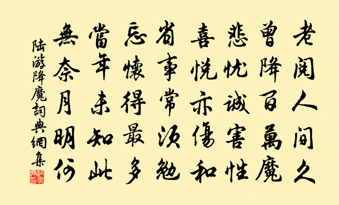 詩詞名句歷史字典書法欣賞書法字典國語詞典說文解字康熙字典古漢語字典標 題 作 者 詩 句 降魔作者:陸游 朝代:宋代降魔原文老閱人間久,曾降百萬魔。悲憂誠害性,喜悅亦傷和。省事常須勉,忘懷得最多。當年未知此,無奈月明何!詩詞問答問:降魔的作者是誰?答:陸游問:降魔寫於哪個朝代?答:宋代問:陸游的名句有哪些?答:陸游名句大全陸游降魔書法欣賞降魔書法作品詩詞推薦西園獨步二首孔武仲〔宋代〕茂林新幄翠重重,猶有殘花掩映紅。庭館漸虛容散涉,時攀園果作狙公。次韻李明甫追和蘇黃門垧鸂鶒池汪晫〔宋代〕無穢水常寺,忘機鳥自馴。重來圓宿夢,因省是前身。尤物遺靈在,珍毛薦瑞頻。何當還抱子,池上啄游鱗。歲寒雜詠錢時〔宋代〕筍入欄乾曲透茅,青琅玕脫紫文苞。晚來拆草驗生意,一夜能添二尺高。憶秦娥朱熹〔宋代〕梅花發。寒梢掛著瑤台月。瑤台月。和羹心事,履霜時節。野橋流水聲嗚咽。行人立馬空愁絕。空愁絕。為誰凝佇反舌釋文珦〔宋代〕毛羽誠無取,禽中號善鳴。能將一片舌,巧作百般聲。元是因風氣,曾非出性情。君看五月後,瘖默愧流鶯。故武衛將軍輓歌三首杜甫〔唐代〕嚴警當寒夜,前軍落大星。壯夫思感決,哀詔惜精靈。王者今無戰,書生已勒銘。封侯意疏闊,編簡為誰青。舞劍挽太學正節先生徐應鑣何夢桂〔宋代〕國破君亡一死宜,絕憐兒女死如飴。龍池久負媧皇誓,蛙坎空遺烈士悲。洗骨不污唐門館,瀝心無愧趙孤兒。北行登會稽蓬萊閣讀唐宋士大夫詩曾豐〔宋代〕盤盤矯矯臥龍峰,傑閣崢嶸龍腹中。柱腳下懸危踏軟,檐牙高豁巧銜空。江山互以青相繞,雲霧時翻黑自蒙。物態春日雜興陸游〔宋代〕四十餘年學養生,誰知所得亦平平。體孱不犯寒時出,路濕常尋乾處行。送外甥范勉赴任常州長史兼覲省錢起〔唐代〕憐君展驥去,能解倚門愁。就養仍榮祿,還鄉即晝游。橘花低客舍,蓴菜繞歸舟。與報垂綸叟,知吾世網留。失題張先〔宋代〕花落春禽啼晚枝,有時香蒂點人衣。多情盡不如蝴蝶,欲起遺紅貼地飛。紹興聖孝感通詩張嵲〔宋代〕宋有天下,逮乎八世。猛敵橫生,侵欲不忌。堯湯水旱,文景菑異。數則使然,豈人攸墍。皇帝承統,甚武且仁。別陳藥院王令〔宋代〕客居平日有誰親,一別三年百病身。為道難言輕感慨,羨君無病更醫人。寄李侍御劉長卿〔唐代〕舊國人未歸,芳洲草還碧。年年湖上亭,悵望江南客。驄馬入關西,白雲獨何適。相思煙水外,唯有心不隔。梅香李龍高〔宋代〕忍飢抱凍老窮崖,一點檀心未肯灰。夷甫彥回空似玉,卻曾遺臭汗青來。浪淘沙(示吳應奎)陳著〔宋代〕遲飯甑炊紅。青翦蔬叢。雞聲鄰里狎田翁。兵後故人能有幾,歲晚江空。誰信淡交中。依舊情濃。白頭青眼轉惺憁紀夢塗楷〔宋代〕拜伏庭前又一番,天書雖捧未容看。南陽久作蟠龍臥,應為蒼生起謝安。跋澹庵先生繳張欽夫賜章服答詔二首楊萬里〔宋代〕平生師友兩相知,苦為君王惜一衣。剌口爭來爭不得,青蠅猶傍太陽飛。道謁朱晦庵先生鄒輗〔宋代〕野意淒涼遠俗情,出門一笑亂山青。痴兒白晝猶鼾睡,查是無人會喚醒。聞寺中曉鼓劉學箕〔宋代〕靈鼉一鼓振潮音,征夢迢遙枕畔聞。語斷頻伽天正曉,送風吹散滿天雲。名句推薦稱是秦時避世人,勸酒相歡不知老。李白《山人勸酒》 為學不外靜敬二字,教人先去驕惰二字。王永彬《圍爐夜話·第一四八則》 華表月明歸夜鶴,嘆當時、花竹今如此吳文英《金縷歌·陪履齋先生滄浪看梅》 上有愁思婦,悲嘆有餘哀。曹植《明月上高樓》 溪雲初起日沉閣,山雨欲來風滿樓。許渾《鹹陽城東樓 / 鹹陽城西樓晚眺 / 西門》 銅盤燭淚已流盡,霏霏涼露沾衣周邦彥《夜飛鵲·河橋送人處》 道傍榆莢仍似錢,摘來沽酒君肯否。岑參《戲問花門酒家翁》 午醉未醒紅日晚,黃昏簾幕無人卷。蘇軾《蝶戀花·蝶懶鶯慵春過半》 主貴多變,國貴少變。國多物,削;主少物,強。商鞅《商君書·去強》 不畏浮雲遮望眼,只緣身在最高層王安石《登飛來峰》