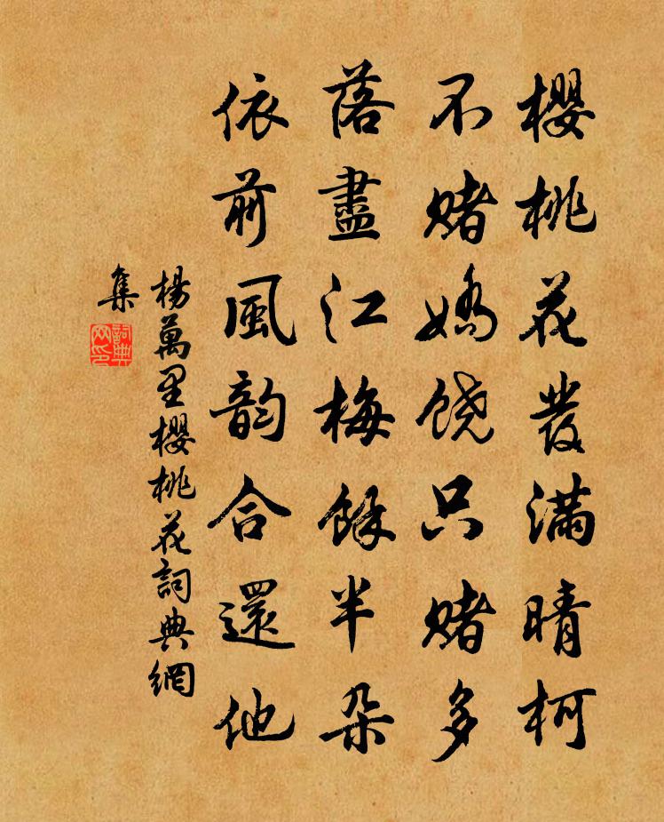 詩詞名句歷史字典書法欣賞書法字典國語詞典說文解字康熙字典古漢語字典標 題 作 者 詩 句 櫻桃花作者:楊萬里 朝代:宋代櫻桃花原文櫻桃花發滿晴柯,不賭嬌饒只賭多。落盡江梅余半朵,依前風韻合還他。詩詞問答問:櫻桃花的作者是誰?答:楊萬里問:櫻桃花寫於哪個朝代?答:宋代問:楊萬里的名句有哪些?答:楊萬里名句大全楊萬里櫻桃花書法欣賞櫻桃花書法作品詩詞推薦同於秘丞賦瀑泉釋延壽〔宋代〕大禹大知鑿,來源變自成。色應憐眾白,聲合讓孤清。遠勢曾吞海,飛流欲噴鯨。靈槎如可泛,天際問歸程。至日有感二首張耒〔宋代〕一臥孤村兩見冬,獨搔華發思無窮。荒山極目漫汗雪,老樹當庭晝夜風。佳節妻兒具樽酒,茅齋斟酌慰愁翁。未央鸚鵡白居易〔唐代〕竟日文還默,中宵棲復驚。身囚緣彩翠,心苦為分明。暮起歸巢思,春多憶侶聲。誰能拆籠破,從放快飛鳴。九歌·湘君屈原〔先秦〕君不行兮夷猶,蹇誰留兮中洲;美要眇兮宜修,沛吾乘兮桂舟;令沅湘兮無波,使江水兮安流;望夫君兮未來,吹雜劇·小尉遲將斗將認父歸朝佚名〔元代〕第一折(沖末扮劉季真領番卒上,詩云)帥鼓銅鑼一兩敲,轅門裡外列英豪。三軍報罷平安喏,緊卷旗幡再不搖。柳州城西北隅種柑樹柳宗元〔唐代〕手種黃柑二百株,春來新葉遍城隅。方同楚客憐皇樹,不學荊州利木奴。幾歲開花聞噴雪,何人摘實見垂珠。若教挽林給事中母柳夫人詞三首王之望〔宋代〕聯德成偕老,和鳴六十春。休聲傳孝婦,餘慶產名臣。人去虛韋幔,哀深泣孟鄰。千年憑直筆,圖史播芳塵。對雪二首毛滂〔宋代〕玉京咫尺不應疑,龍鳳交橫舞屢僛。素色可能粧粉並,真香直到齒牙知。珠樓先曉月未落,瑤草自春天亦私。千里賣花聲 和黃子常韻 詞品卷六喬吉〔元代〕侵曉園丁,報導嬌紅嫩紫。巧工夫、攢枝*蕊。行歌佇立,灑洗妝新水。卷香風、看街簾起。深深巷曲,有個重門偈五首釋彌光〔宋代〕一九與二九,相逢不出手。凍得鴟吻頭,面南看北斗。諸禪人,曉不曉,地爐火冷莫嫌寒,更有樵夫赤腳走。木蘭花/玉樓春賀鑄〔宋代〕佩環聲認腰肢軟。風裡麝熏知近遠。此身常羨玉妝檯,得見曉來梳畫面。迴廊幾步通深院。一桁繡衣簾不捲。酒闌依韻吳樞密正月二日留題曾侍中齋閣王珪〔唐代〕昨日春風變舊年,連珂來訪紫芝仙。三朝元仗鴻鈞手,萬里今同不擊船。壽酒一傾人共醉,賜書千軸子多賢。從前宿梅下李曾伯〔宋代〕春事已十一,梅花才兩三。青煙回野燒,翠靄護晴嵐。風暖雁將北,日遲人漸南。病餘宜緩轡,勿用客程貪。銅雀台王建〔唐代〕嬌愛花更何日,花高台空數花層。含啼映雙袖,不忍看西陵。漳水東流無復來,百花輦路為蒼苔。青樓月夜長寂寞再思韓偓〔唐代〕暴殄猶來是片時,無人向此略遲疑。流金鑠石玉長潤,敗柳凋花松不知。但保行藏天是證,莫矜纖巧鬼難欺。近來望凌煙閣劉公興〔唐代〕畫閣凌虛構,遙瞻在九天。丹楹崇壯麗,素壁繪勛賢。靄靄浮元氣,亭亭出瑞煙。近看分百辟,遠揖誤群仙。圖列訪李國器於包山同登寺後山庵樓鑰〔宋代〕訪客包家山,相與登層顛。嶙峋巨石中,屈曲扶欄乾。夜來雨初過,石罅時涓涓。輕輿到岡頭,大江橫吾前。亭午少年見青春王安石〔宋代〕少年見青春,萬物皆嫵媚。身雖不飲酒,樂與賓客醉。一從鬢上白,百不見可喜。心腸非故時,更覺日月駛。聞歡竹溪直院盛稱起予草堂詩之善暇日覽之多有可劉克莊〔宋代〕不為劉郎屈,蕭然釣遠汀。當時無此客,其象見於星。龍袞思同學,羊裘謁廣庭。九行仰黃道,一曜動青冥。帝座陶淵明王柏〔宋代〕義熙鼎向寄奴輕,歸去來兮絕宦情。特筆誰書晉處士,千年心事一朝明。名句推薦時雨降矣,而猶浸灌,其於澤也,不亦勞乎!莊子《莊子·內篇·逍遙遊》 久廢山行疲犖确,尚能村醉舞淋浪。蘇軾《捕蝗至浮雲嶺山行疲苶有懷子由弟二首·其二》 百歲落半途,前期浩漫漫。李白《登敬亭山南望懷古贈竇主簿》 玉露凋傷楓樹林,巫山巫峽氣蕭森杜甫《秋興八首·其一》 雨雪自飛千嶂外,榆林只隔數峰西。朱彝尊《出居庸關》 越王好勇而民多輕死;楚靈王好細腰而國中多餓人韓非及後人《韓非子·二柄》 辛苦遭逢起一經,干戈寥落四周星。文天祥《過零丁洋》 風鳴兩岸葉,月照一孤舟。孟浩然《宿桐廬江寄廣陵舊遊》 春種一粒粟,秋收萬顆子。李紳《古風二首 / 憫農二首》 煙水初銷見萬家,東風吹柳萬條斜。竇鞏《襄陽寒食寄宇文籍》