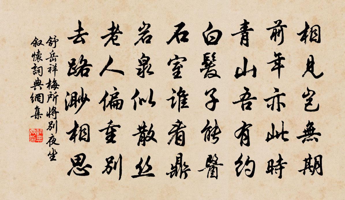 詩詞名句歷史字典書法欣賞書法字典國語詞典說文解字康熙字典古漢語字典標 題 作 者 詩 句 梅所將別夜坐敘懷作者:舒岳祥 朝代:宋代梅所將別夜坐敘懷原文相見豈無期,前年亦此時。青山吾有約,白髮子能醫。石室誰看鼎,岩泉似散絲。老人偏重別,去路渺相思。詩詞問答問:梅所將別夜坐敘懷的作者是誰?答:舒岳祥問:梅所將別夜坐敘懷寫於哪個朝代?答:宋代舒岳祥梅所將別夜坐敘懷書法欣賞梅所將別夜坐敘懷書法作品詩詞推薦吊賈島李克恭〔唐代〕一一玄微縹緲成,盡吟方便爽神情。宣宗謫去為閒事,韓愈知來已振名。海底也應搜得淨,月輪常被玩教傾。如何夜飲二首楊萬里〔宋代〕飲酒無奇訣,且斟三四分。初頭只嫌淺,忽地有餘春。身外多少事,燈前子細論。絕憐青女老,忍冷撒瓊塵。和邢子友胡寅〔宋代〕中憐牒訟汩華年,賴有神交肯惠然。萬石同登高柳外,一尊相屬晚花前。浮雲空解遮人境,止水何曾染世緣。安得錦堂春/錦堂春慢黃裳〔宋代〕天女多情,梨花碎翦,人間贈與多才。漸瑤池瀲灩,粉翹徘徊。面不禁風力,背人飛去還來。最清虛好處,遙度幽朱潭周弼〔宋代〕消散羈愁益坦然,況當初暖欲晴夫。清溪苔滑重抄紙,淺屋柴香正煮綿。隔水殺雞祠杜土,過橋嘶馬入人煙。今朝贈高處士許渾〔唐代〕宅前雲水滿,高興一書生。垂釣有深意,望山多遠情。夜棋留客宿,春酒勸僧傾。未作乾時計,何人問姓名。題九天使者廟(又見讖記卷)孫鹹〔唐代〕獨入玄宮禮至真,焚香不為賤貧身。秦淮兩岸沙埋骨,湓浦千家血染塵。廬阜煙霞誰是主,虎溪風月屬何人。九江山墅方岳〔宋代〕且莫嫌窮僻,山居儘自奇。候樵分玉蕈,熏穴得香貍。杯雋明冰片,崖寒孕雪芝。不遺吾一美,慚爾野人為。至伏以時雪普沾天顏兌悅特就圖書之府廣延儒李至〔宋代〕盡日霏霏灑禁闈,蓬山高會各增輝。數行御札鸞凰舞,一幅天歌錦繡飛。席上共驚飄粉絮,筆頭爭看落珠璣。蘭台竹香子(同郭季端訪舊不遇,有作)劉過〔宋代〕一瑣窗兒明快。料想那人不在。熏籠脫下舊衣裳,件件香難賽。匆匆去得忒煞。這鏡兒、也不曾蓋。千朝百日不曾野望杜甫〔唐代〕西山白雪三奇戍,南浦清江萬里橋。海內風塵諸弟隔,天涯涕淚一身遙。唯將遲暮供多病,未有涓埃答聖朝。跨馬蒙知府寵示秋日郡圃佳制遂侍杖屨逍遙林水間陳與義〔宋代〕竹際笙簧起,回聽眾籟微。時陪物外賞,肯念日斜陽。草色違秋意,池光淨客衣。吟公清絕句,政爾不能肥。游黃山寺葛起文〔宋代〕偶為尋幽出,扶筇亦懶拈。鸛巢依古塔,燕語入虛欄。筆下詩初就,樽中酒屢添。此游堪喜膝,上一去掀髯。次韻李漢老詩劉子翬〔宋代〕蒙莊嘆隙駒,孔聖悲逝川。百年生有涯,萬感情無邊。賢愚真唯阿,繫心同一緣。內熱蠱其中,伊誰肯求痊。樂哉鷓鴣天晁端禮〔宋代〕聖澤昭天下漏泉。君王慈孝自天然。四民有養躋仁壽,九族鹹親邁古先。歌舜日,詠堯年。競翻玉管播朱弦。須知題真空閣李熙輔〔宋代〕括蒼山上雲,山好雲亦好。可憐山下僧,看雲不知老。和張記室源傷往詩江總〔隋代〕小婦當壚夜。夫壻凱歸年。正歌千里曲。翻入九重泉。機中未斷素。瑟上本留弦。空帳臨牕掩。孤燈向壁燃。還悲贈眼醫婆羅門僧劉禹錫〔唐代〕三秋傷望眼,終日哭途窮。兩目今先暗,中年似老翁。看朱漸成碧,羞日不禁風。師有金篦術,如何為發蒙。即事蘇泂〔宋代〕群雞紛啄粟,收斂逼深秋。巷內黃葉落,門前清水流。年飢人菜色,家弊仆蓬頭。兼善平生志,淒涼出謬悠。臨江仙(和元遺山題揚州平山堂)王奕〔宋代〕二十四橋明月好,暮年方到揚州。鶴飛仙去總成休。襄陽風笛急,何事付悠悠。幾闋平山堂上酒,夕陽還照邊樓。名句推薦問別來、解相思否。吳文英《惜秋華·七夕前一日送人歸鹽官》 美人結長想,對此心悽然。李白《折楊柳》 天下無事,不可廢武佚名《百戰奇略·第十卷·忘戰》 雨雪雰雰,益之以霢霂。佚名《信南山》 守職而不廢,處義而不回。黃石公《素書·正道》 非知之難也,處知則難也。韓非及後人《韓非子·說難》 芳菲歇去何須恨,夏木陰陰正可人。秦觀《三月晦日偶題》 青蒲銜紫茸,長葉復從風。佚名《拔蒲二首》 不痴不聾,不作家翁。司馬光《資治通鑑·唐紀四十》 每圓處即良宵,甚此夕偏饒,對歌臨怨。吳文英《玉漏遲·瓜涇度中秋夕賦》