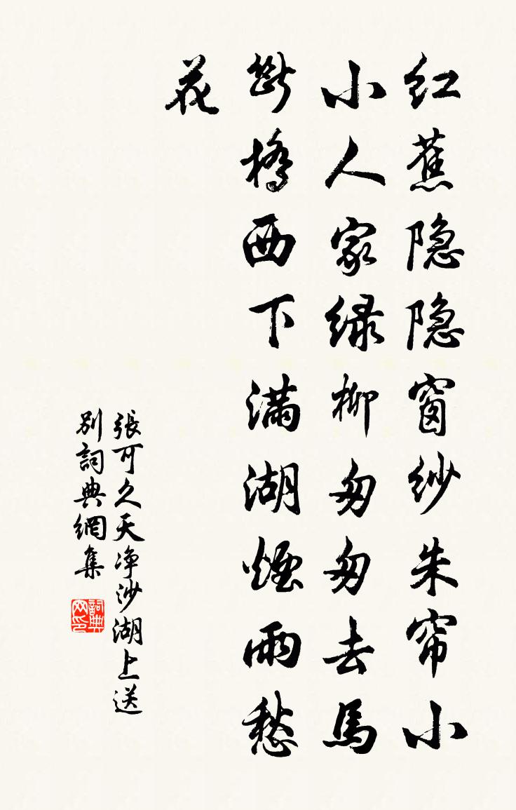 紅蕉隱隱窗紗,朱簾小小人家,綠柳匆匆去馬。斷橋西下,滿湖煙雨愁花。