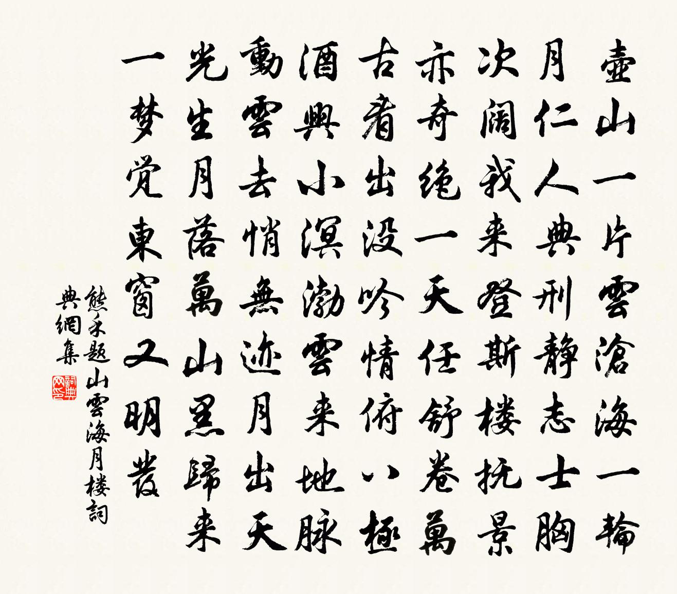 詩詞名句歷史字典書法欣賞書法字典國語詞典說文解字康熙字典古漢語字典標 題 作 者 詩 句 題山雲海月樓作者:熊禾 朝代:宋代題山雲海月樓原文壺山一片雲,滄海一輪月。仁人典刑靜,志士胸次闊。我來登斯樓,撫景亦奇絕。一天任舒捲,萬古看出沒。吟情俯八極,酒興小溟渤。雲來地脈動,雲去悄無跡。月出天光生,月落萬山黑。歸來一夢覺,東窗又明發。詩詞問答問:題山雲海月樓的作者是誰?答:熊禾問:題山雲海月樓寫於哪個朝代?答:宋代熊禾題山雲海月樓書法欣賞題山雲海月樓書法作品詩詞推薦十月二十日,恭聞太皇太后升遐,以軾罪人,蘇軾〔宋代〕未報山陵國士知,遶林松柏已猗猗。一聲慟哭猶無所,萬死酬恩更有時。夢裡天衢隘雲仗,人間雨淚變彤帷。關雎宮詞王仲修〔宋代〕雪消宮殿苑梅芳,曉漏聳遲下建章。天氣清寒當臘日,沈香甲煎賜諸房。次韻曹輔寄壑源試焙新芽蘇軾〔宋代〕仙山靈雨濕行雲,洗遍香肌粉未勻。明月來投玉川子,清風吹破武林春。要知玉雪心腸好,不是膏油首面新。戲作詠制置李公芾鄭思肖〔宋代〕舉家 * 盡忠臣,仰面青天哭斷雲。聽得北人歌里唱,潭州城是鐵州城。寄韓澗泉三首王汶〔宋代〕在困多促促,長懷特棲者。崔嵬玉山岑,今誰秣余馬。朝隨澗雲浮,暮逐澗泉瀉。光儀儼神交,晤言寄心寫。食魚和叔崇清明後四絕王柏〔宋代〕把酒留春尚肯留,幾多生意聚詩眸。可憐桃李無涵養,只有桑麻自進修。太湖書懷劉學箕〔宋代〕清風起平湖,白雲生潤陰。佳時慘不樂,羈思苦難任。客子熱中腸,浩然懷故林。仲夏倏已過,草木郁蕭森。萬物追和東坡題李亮功歸來圖黃庭堅〔宋代〕今人常恨古人少,今得見之誰謂無。欲學淵明歸作賦,先煩摩詰畫成圖。小池已築魚千里,隙地仍栽芋百區。朝市遣心四首蘇泂〔宋代〕眼看飛蝗亂似蚊,傷禾害稼不堪聞。人言所在如飛雨,恐是淮南懶戰軍。宿柳池松風亭李曾伯〔宋代〕軋軋肩輿上劍門,春和身健快於奔。風翻紅雨摧芳信,山帶青煙入燒痕。鄰略物華無好句,破除旅思有清樽。高人戲酬副使中丞見示四韻元稹〔唐代〕莫恨暫櫜鞬,交遊幾個全。眼明相見日,肺病欲秋天。五馬虛盈櫪,雙蛾浪滿船。可憐俱老大,無處用閒錢。古斷腸曲三十首周端臣〔宋代〕錦屏殘睡思忡忡,心緒無聊酒易中。柳院蘚廳慵不到,斑鳩啼暖落花風。晨起徐璣〔宋代〕晨起風吹面,朝晴野霧收。高峰多遠見,淺水少平流。世事非難了,塵勞獨未休。今年看鬢髮,已變一莖秋。有所思(一作長相思)陳陶〔唐代〕欲唱玄雲曲,知音復誰是。采掇情未來,臨池畫春水。卜隱韓偓〔唐代〕屏跡還應減是非,卻憂藍玉又光輝。桑梢出舍蠶初老,柳絮蓋溪魚正肥。世亂豈容長愜意,景清還覺易忘機。世間懷寄彭城朋好十首之一庚午九月曆陽賦。寇三賀鑄〔宋代〕元弼今安健,音塵久闊疏。早年傾蓋意,白首復何如。王通判輓詞樓鑰〔宋代〕世篤青箱學,驊騮更著鞭。半山分近派,岩壑誦新篇。竹馬迎雙舄,棠陰憶二天。黃扉伸讜論,風節尚翹然。臨刑口占邛州僧〔宋代〕宿業因緣人不知,如今啐啄與同時。今生歡喜償他了,來世分明不欠伊。夢幻色身從敗壞,閒田虛樹已生枝。休休憶宗道舊遊項安世〔宋代〕十八年前勝共饒,兩青不借一枯焦。狂挑藥澗尋瓊闕,醉踏經台問玉霄。華頂雲開千嶂露,赤城天近九霞飄。只今新荷葉趙彥端〔宋代〕欲暑還涼,如春有意重歸。春若歸來,任他鶯老花飛。輕雷澹雨,似晚風、欺得單衣。檐聲驚醉,起來新緣成圍。名句推薦君子有三患:未之聞,患弗得聞也;既聞之,患弗得學也;既學之,患弗能行也。戴聖《禮記·雜記下》 百結愁腸郁不開,此生惆悵異鄉來。秋瑾《九日感賦》 秋陰時晴漸向暝,變一庭淒冷周邦彥《關河令·秋陰時晴漸向暝》 燕語如傷舊國春,宮花一落已成塵。李益《隋宮燕》 功名富貴逐世轉移,而氣節千載一時。洪應明《菜根譚·概論》 歸時休放燭光紅,待踏馬蹄清夜月。李煜《木蘭花·曉妝初了明肌雪》 當時相候赤欄橋,今日獨尋黃葉路。周邦彥《玉樓春·桃溪不作從容住》 千里江山昨夢非,轉眼秋光如許。文徵明《念奴嬌·中秋對月》 牆裡鞦韆牆外道。牆外行人,牆裡佳人笑。蘇軾《蝶戀花·春景》 災人者,人必反 災之。莊子《莊子·內篇·人間世》