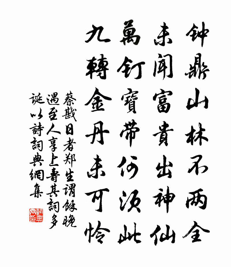 詩詞名句歷史字典書法欣賞書法字典國語詞典說文解字康熙字典古漢語字典標 題 作 者 詩 句 日者鄭生謂余晚遇至人享上壽其詞多誕以詩作者:蔡戡 朝代:宋代原文鐘鼎山林不兩全,未聞富貴出神仙。萬釘寶帶何須此,九轉金丹未可憐。詩詞問答問:《日者鄭生謂余晚遇至人享上壽其詞多誕以詩》的作者是誰?答:蔡戡問:該詩寫於哪個朝代?答:宋代問:該詩是什麼體裁?答:七絕書法欣賞日者鄭生謂余晚遇至人享上壽其詞多誕以詩書法作品詩文賞析原題:日者鄭生謂余晚遇至人享上壽其詞多誕以詩簡之詩詞推薦冬蚊秦觀〔宋代〕蚤蠆蜂虻罪一倫,未如蚊子重堪嗔。萬枝黃落風如射,猶自傳呼欲噬人。族侄孫子榮之子神童顏老不幸短命而死哭之不戴復古〔宋代〕汝祖積陰德,汝翁多讀書。汝生天報施,汝死又何如。修短有定數,賢愚莫問渠。冥官聞慟哭,還許再來無。素梅 其八王冕〔元代〕夷石心腸滿面霜,歲寒吾計未全荒。相逢休問春何處,定是調羹到玉堂。游姑婦岩汪真〔宋代〕玄武崖前啟洞天,登登轉望已超然。春工著地看如畫,水籟到山聽似弦。鳥駕高山呼飲酒,童衙平野舞鞦韆。自欣回望峽山二首楊萬里〔宋代〕英州挽不來,峽山推不去。行了一日船,依舊朝來處。和張居士釋子淳〔宋代〕默訥虛明履趣深,蟾蜍推月照天心。松風未作寒林靜,一弄無弦琴上音。姑孰道中貢師泰〔元代〕朝發慈姥山,莫宿吳公橋。日入氣猶溽,清懷厭煩囂。隔江風雨至,綠樹涼蕭蕭。鄰舟頗相好,有酒忽見招。明發人月圓 春日次韻 北曲聊樂府續集吳監張可久〔元代〕羅衣還怯東風瘦,不似少年游。匆匆塵世,看看鏡里,白了人頭。片時春夢,十年往事,一點詩愁。海棠開後,梨詠梅蔡士裕〔宋代〕風饕雪虐大江頭,苔蘚鱗鱗綰鐵虬。清絕一枝先百卉,密攢萬蕊傲千秋。本無煙火塵氛氣,洗盡鉛華脂粉羞。月夜游巴陵空寺詩陰鏗〔南北朝〕日宮朝絕磬。月殿夕無扉。網交雙樹葉。輪斷七燈輝。香盡奩猶馥。幡塵畫漸微。借問將何見。風氣動天衣。次韻李元量見贈李若水〔宋代〕先生學業自無雙,當代聞人共嘆降。文采羨君高楚夢,詩聲笑我類吳江。槐花過雨金堆砌,山色經秋碧滿窗。一幅太真蜀宮群仙〔唐代〕春夢悠揚生下界,一堪成笑一堪悲。馬嵬不是無情地,自邁蓬萊睡覺時。諸門人送至龍里道中二首王守仁〔明代〕蹊路高低入亂山,諸賢相送愧間關。溪雲壓帽兼愁重,風雪吹衣著鬢斑。花燭夜堂還共語,桂枝秋殿聽躋攀。相思送劉大著赴任益州司理魏野〔宋代〕金口親除向錦川,一般監郡最榮遷。從來才已欺鸚鵡,此去冤應雪杜鵑。迎接僧攜筇竹杖,歌謠民寫浣花箋。移風安公子晁端禮〔宋代〕帝里重陽好。又對短髮來吹帽。滿目風光還似舊,奈樽前人老。暗憶當年,伴侶同傾倒。夸俊游、爭買千金笑。到送王才元入京王崇〔宋代〕渭城楊柳已青青,強駐行人聽渭城。不問使車歸路遠,且從樽酒滿杯傾。相逢洮塞休兵後,此去秦川照眼明。若立在伯教授為考試之行不知其地漫成五詩送之趙蕃〔宋代〕峽州使君我所親,書去猶新報未聞。此士如今為第一,見之煩為致殷勤。池上白居易〔唐代〕裊裊涼風動,淒淒寒露零。蘭衰花始白,荷破葉猶青。獨立棲沙鶴,雙飛照水螢。若為寥落境,仍值酒初醒。延真觀一首王阮〔宋代〕偃月堂成竟斲棺,延真人只葬衣冠。浮雲眼見成騎虎,不似抽身穩跨鸞。春夕遣懷劉兼〔唐代〕窮通分定莫淒涼,且放歡情入醉鄉。范蠡扁舟終去相,馮唐半世只為郎。風飄玉笛梅初落,酒泛金樽月未央。休把名句推薦一點浩然氣,千里快哉風。蘇軾《水調歌頭·黃州快哉亭贈張偓佺》 更待菊黃家醞熟,共君一醉一陶然。白居易《與夢得沽酒閒飲且約後期》 殘燈孤枕夢,輕浪五更風。徐昌圖《臨江仙·飲散離亭西去》 冰肌玉骨,自清涼無汗。蘇軾《洞仙歌·冰肌玉骨》 寧為雞口,無為牛後。劉向《戰國策·韓一·蘇秦為楚合從說韓王》 日射紗窗風撼扉,香羅拭手春事違。李商隱《日射》 驪宮高處入青雲,仙樂風飄處處聞。白居易《長恨歌》 巧笑倩兮,美目盼兮,素以為絢兮。孔子弟子《論語·八佾篇》 富貴多憂,貧窮自在。佚名《增廣賢文·上集》 請君看取東流水,方識人間別意長。嚴仁《鷓鴣天·惜別》