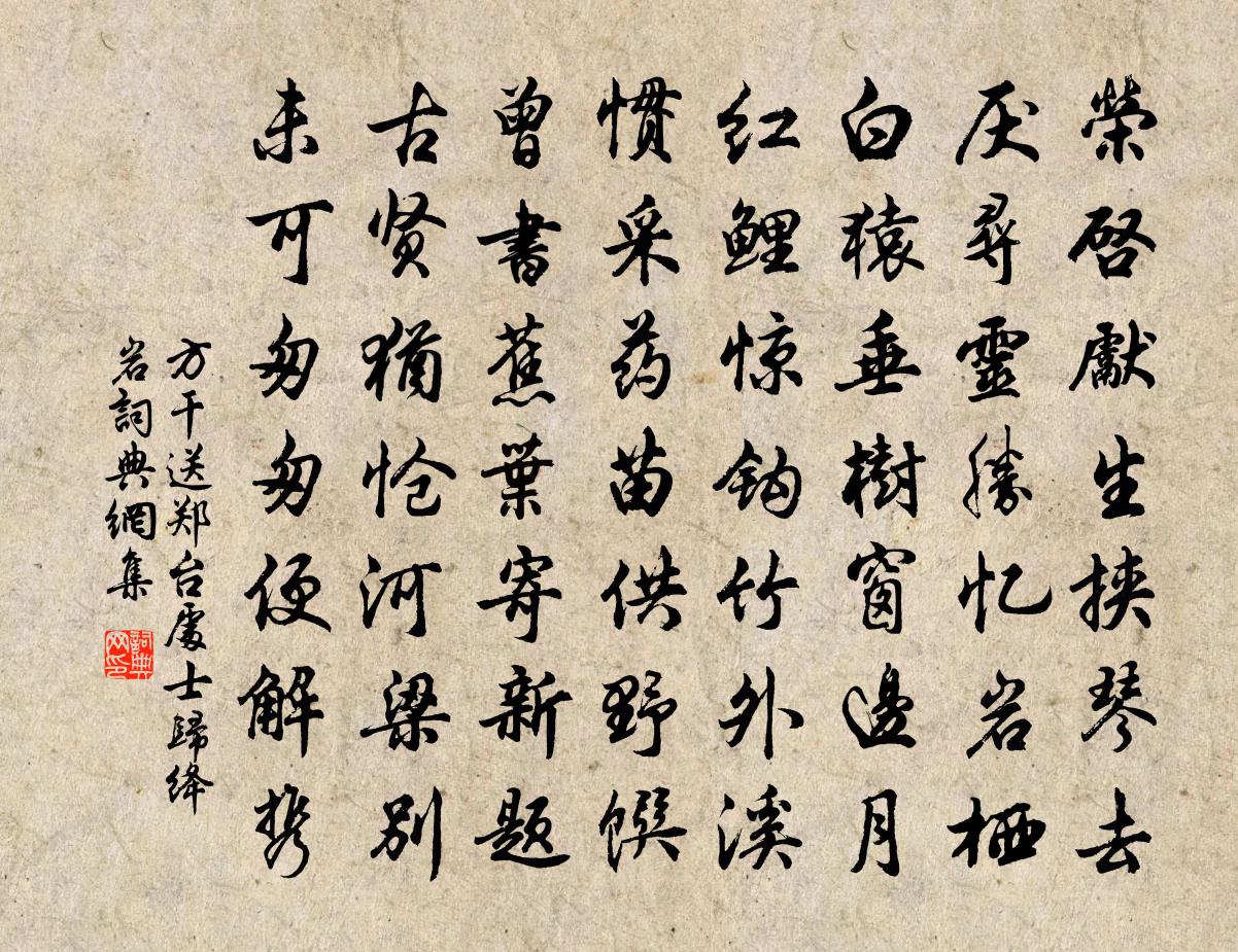 詩詞名句歷史字典書法欣賞書法字典國語詞典說文解字康熙字典古漢語字典標 題 作 者 詩 句 送鄭台處士歸絳岩作者:方乾 朝代:唐代送鄭台處士歸絳岩原文榮啟先生挾琴去,厭尋靈勝憶岩棲。白猿垂樹窗邊月,紅鯉驚鉤竹外溪。慣採藥苗供野饌,曾書蕉葉寄新題。古賢猶愴河梁別,未可匆匆便解攜。詩詞問答問:送鄭台處士歸絳岩的作者是誰?答:方乾問:送鄭台處士歸絳岩寫於哪個朝代?答:唐代問:送鄭台處士歸絳岩是什麼體裁?答:七律方乾送鄭台處士歸絳岩書法欣賞送鄭台處士歸絳岩書法作品注釋全唐詩:卷650-47詩詞推薦好事近·夏日史遽庵先生招飲即用先生喜余歸自吳閶過訪陳維崧〔清代〕分手柳花天,雪向晴窗飄落。轉眼葵肌初繡,又紅倚欄角。 別來世事一番新,只吾徒猶昨。話到英雄失路,忽涼移住西門之溪上程公許〔宋代〕罷官來就湖州住,為愛雙流貫一城。僦屋本非嫌僻靜,開窗正要納空明。魚是幸要隨宜買,饘粥何妨逐漸營。況有詩四首宋高宗〔宋代〕高居大士是龍象,草堂大人非熊羆。不逢壞衲乞香飯,唯見白頭垂釣絲。鴛鴦終日愛水鏡,菡萏晚風凋舞衣。開徑戊午在靈隱聞曹源和尚訃音兼小師舉老為開語釋道沖〔宋代〕杖藜隨處是乾坤,迦葉峰前便垛根。貧看煙巒三十二,到頭不識老曹源。漫興鄭樵〔宋代〕今古去來有數,乾坤闔辟無涯。人生行雲流水,處世運瓮搬柴。簡立之李處權〔宋代〕稅駕居鄰古寺中,高堂永日笑言同。山雲濃淡未成雨,溪竹飄蕭先得風。短髮只從今歲白,衰顏無復少時紅。君家酬崔使君寄麈尾武元衡〔唐代〕賢人嘉尚同,今制古遺風。寄我襟懷裡,辭君掌握中。金聲勞振遠,玉柄借談空。執玩馳心處,迢迢巴峽東。石佛釋了演〔宋代〕積念有年瞻石佛,今朝一見絕疑猜。都盧面目只如此,卻道三生鑿出來。挽艮岩梅府卿方回〔宋代〕庚午昔同朝,權臣狠且驕。至尊俱芥視,大物遽冰消。密勿毗廊肆,艱難駕使軺。絲毫心有愧,壽肯到今朝。城南劉克莊〔宋代〕瀕江多海物,比屋盡閩人。四野方多壘,三間欲卜鄰。一半兒查德卿〔元代〕綠窗時有唾茸粘,銀甲頻將彩線撏。繡到鳳凰心自嫌。按春纖,一半兒端相一半兒掩。奉和七夕侍宴兩儀殿應制杜審言〔唐代〕一年銜別怨,七夕始言歸。斂淚開星靨,微步動雲衣。天迥兔欲落,河曠鵲停飛。那堪盡此夜,復往弄殘機。空谷有幽蘭陳郁〔宋代〕空谷有幽蘭,取極倚白石。清晨作奇共,凡卉各跼蹐。公子偶相值,□枝置錦席。敷榮忽變倅,色不貸一夕。信知受誥口號方岳〔宋代〕歸我南山老不遭,孟亭幾夢赭黃袍。強渠枉費平生力,不直君王一字褒。治安疏海瑞〔明代〕戶部雲南清吏司主事臣海瑞謹奏;為直言天下第一事,以正君道、明臣職,求萬世治安事: 君者,天下臣民萬雙桃寄鞏經略三首姜特立〔宋代〕只說瓜蓮並蔕生,幾曾仙實見雙成。卻疑西母猶多事,戲作人間兒女情。酬李補闕紓皎然〔唐代〕不住東林寺,雲泉處處行。近臣那得識,禪客本無名。西江月蕭廷之〔宋代〕九曲江頭逆浪,霎時衝過天心。崑崙頂上水澄澄。醞就瓊漿自飲。便向此時採取,河車搬運無停。陰陽一氣自浮沈和秋房題半湖樓二首朱繼芳〔宋代〕天目飛來第幾峰,峰前著屋貯虛空。濕雲低亞鉤欄角,缺月斜窺戶牖中。一水東西添柳岸,兩山南北欠樵風。住家雪晴王珪〔唐代〕溟渤盪無垠,東嵎掛日輸。風雲始回馭,天地不飛塵。氣動千峰翠,光浮萬瓦鱗。南亭一駐馬,十里望青春。名句推薦鳥之將死,其鳴也哀;人之將死,其言也善。孔子弟子《論語·泰伯篇》 行多有病住無糧,萬里還鄉未到鄉。盧綸《逢病軍人》 谷不熟為飢,蔬不熟為饉,果不熟為荒,仍飢為薦。佚名《爾雅·釋天》 正身直行,眾邪自息。劉安及其門客《淮南子·繆稱訓》 團扇,團扇,美人病來遮面。王建《宮中調笑·團扇》 梅花雪,梨花月,總相思。張惠言《相見歡·年年負卻花期》 吳台直下,緗梅無限,未放野橋香度。吳文英《永遇樂·探梅次時齋韻》 客里相逢,籬角黃昏,無言自倚修竹。姜夔《暗香疏影》 甚時躍馬歸來,認得迎門輕笑。時彥《青門飲·寄寵人》 白雲初下天山外,浮雲直向五原間。盧思道《從軍行》