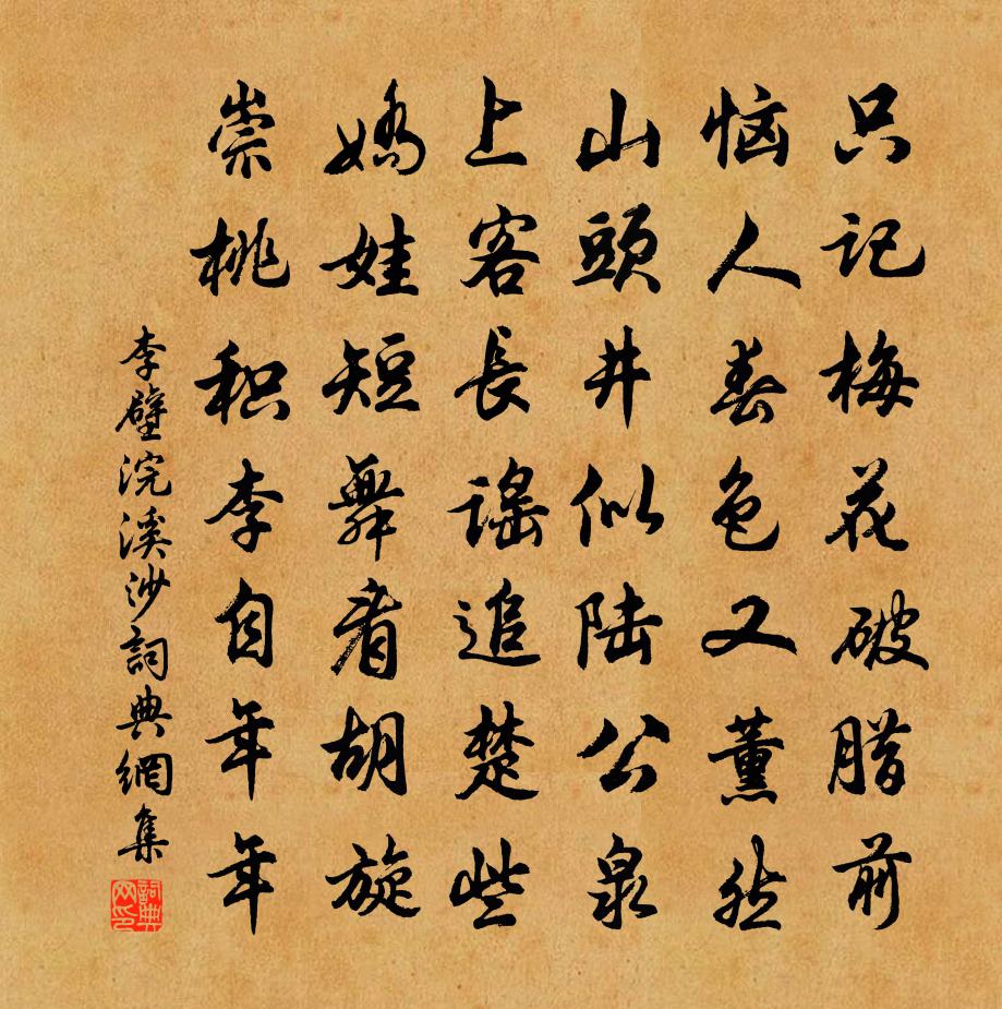 詩詞名句歷史字典書法欣賞書法字典國語詞典說文解字康熙字典古漢語字典標 題 作 者 詩 句 浣溪沙作者:李壁 朝代:宋代浣溪沙原文只記梅花破臘前。惱人春色又薰然。山頭井似陸公泉。上客長謠追楚些,嬌娃短舞看胡旋。崇桃積李自年年。詩詞問答問:浣溪沙的作者是誰?答:李壁問:浣溪沙寫於哪個朝代?答:宋代問:浣溪沙是什麼體裁?答:詞李壁浣溪沙書法欣賞浣溪沙書法作品詩詞推薦梅花二首蘇軾〔宋代〕何人把酒慰深幽?開自無聊落更愁。幸有清溪三百曲,不辭相送到黃州。毛希元隱居廬山臥龍瀑葉述〔宋代〕毛子罵吳曦,蜀山渺孤憤。五老急扣聘,延留如大賓。龍分自眠地,惠帳饒珠蠙。岩花開恨晚,谷鳥鳴先春。弔古春日山亭牟融〔唐代〕醉來重整華陽巾,搔首驚看白髮新。莫道愁多因病酒,只緣命薄不辭貧。龍魚失水難為用,龜玉蒙塵未見珍。正是再次韻四首陳造〔宋代〕犖确悍頑經數驛,醒然初挹碧嶙峋。眼明驟與真山晤,不比逃虛見似人。覽古四十二首 其十二楊維楨〔元代〕漢廷古遺直,免官歸田園。已聞御史奏,嚴李有飛言。矯制獨無罪,加冠禮終存。誰謂淮陽召,淮陽為寡恩。水調歌頭佚名〔宋代〕三徑當松竹,五畝足煙霞。箇中卜宅,蓬山佳致足君家。前有書江環繞,後有橫崗崪嵂,萬象總森羅。輸奐翬飛處彩花張耒〔宋代〕清寒帶雪未成春,可得芳菲早向人。須遣艷陽歸掌握,故教桃李及芳辰。郎官湖春日四首李祁〔宋代〕十日春陰到水亭,水邊楊柳一時青。梅花過盡桃花惡,乞取山礬入淨瓶。秋夜嘆王逢〔元代〕大星芒鬛張,小星光華開。皇天示兵象,勝地今蒿萊。河嶽氣不分,燭龍安在哉?參贊道豈謬,積陰故遲回。疏風縣齋秋夕張詠〔宋代〕才薄難勝任,空銷懶惰情。公堂群吏散,苔地秘蛩聲。隔歲鄉書絕,新寒酒病生。方今聖明代,不敢話辭榮。玉樓春(宛丘行□□□□之園見梅對雪)向子諲〔宋代〕記得江城春意動。兩行疏梅龍腦凍。佳人不用辟寒犀,踏雪穿花雲鬢重。真珠旋滴留人共。更爇沈香暖金鳳。只今贈司空拾遺佚名〔唐代〕侍臣何事辭雲陛,江上微雲見雪花。望閣未承丹鳳詔,掩門空對楚人家。陳琳草奏才還在,王粲登樓興未賒。高館柳梢青吳潛〔宋代〕斷續殘虹,翩飛去鳥,別岸孤村。傍水樓台,滿城鐘鼓,又是黃昏。悠悠歲月如奔。正目斷、邊塵塞雲。兩鬢秋風贈山房先生得宣命何昭德〔宋代〕飛鳳翩翩下九閽,先生出處重斯文。不將鐘鼎易朱紱,要老桐山守白雲。處士一生純是晉,逸民千古尚為殷。皇家飯罷登山楊萬里〔宋代〕樹遠通鸚響,花晴帶雨痕。登山偶回首,隔水見前村。澹往孤無伴,清歸笑不言。還家更遲著,松菊未應存。送王巽澤侍郎王炎〔宋代〕屈指桃溪上,差池二十年。知心寧易得,識面豈無緣。離別何須恨,平安可數傳。異時如索我,小隱翠微邊。漁村落照趙蕃〔宋代〕落日千山赤,平林一帶青。翁方賣魚去,孤檝自橫汀。江亭醉後李覯〔宋代〕平生尚倜儻,壯大苦摧折。主人能結納,佳境為鋪設。涉{左氵右皛}東江來,谽谺暮雲裂。倡女稍多藝,市酒且征婦詞十首劉克莊〔宋代〕江南絲帛貴,塞北雪霜濃。莫恨鐵衣冷,全裝可御冬。憶同尋上陽故宮路司馬光〔宋代〕上陽門外雲連草,車馬遙遙往來道。昔王游豫幾何年,今人豈識當時好。明珠翠羽已成塵,道上行人幾番老。當時名句推薦激濁揚清,嫉惡好善吳兢《貞觀政要·卷二·論任賢》 宿醉離愁慢髻鬟,六銖衣薄惹輕寒,慵紅悶翠掩青鸞韓偓《浣溪沙·宿醉離愁慢髻鬟》 無言獨上西樓,月如鉤。李煜《相見歡·無言獨上西樓》 渡江天馬南來,幾人真是經綸手。辛棄疾《水龍吟·甲辰歲壽韓南澗尚書》 觀其交遊,則其賢不肖可察也管仲《管子·權修》 罩向金籠好羽儀,分明喉舌似君稀僧定渚《詠鸚鵡》 北郭清溪一帶流,紅橋風物眼中秋,綠楊城郭是揚州。王士禎《浣溪沙·紅橋》 還卿一缽無情淚,恨不相逢未剃時。蘇曼殊《本事詩十首·選二》 惜恐鏡中春。不如花草新。張先《菩薩蠻·憶郎還上層樓曲》 曉霧將歇,猿鳥亂鳴;陶弘景《答謝中書書》