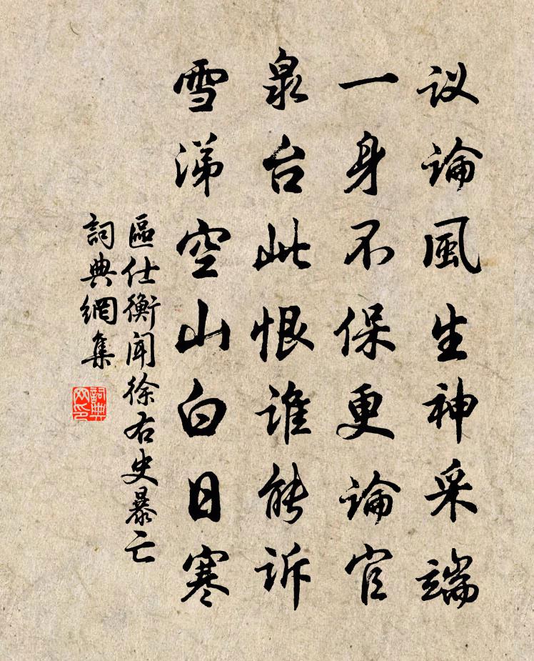 詩詞名句歷史字典書法欣賞書法字典國語詞典說文解字康熙字典古漢語字典標 題 作 者 詩 句 聞徐右史暴亡作者:區仕衡 朝代:宋代聞徐右史暴亡原文議論風生神采端,一身不保更論官。泉台此恨誰能訴,雪涕空山白日寒。詩詞問答問:聞徐右史暴亡的作者是誰?答:區仕衡問:聞徐右史暴亡寫於哪個朝代?答:宋代區仕衡聞徐右史暴亡書法欣賞聞徐右史暴亡書法作品詩詞推薦送羽衣之京牟融〔唐代〕羽衣縹緲拂塵囂,悵別河梁贈柳條。閬苑雲深孤鶴迥,蓬萊天近一身遙。香浮寶輦仙風潤,花落瑤壇絳雨消。自是樂章五曲李復〔宋代〕南山深,雲冥冥。蒼松長,寒楓陰。紫檀椒堂白玉庭,千年桂樹落子青。吉日矣辰良,浴蘭兮佩芳。穆將愉兮神君上元後漕幕同僚二十八人會飲於西湖登千佛閣王之道〔宋代〕福星台畔依紅客,厭踏紅塵穿紫陌。涌金門外泛蘭舟,兩岸融融春水拍。隔浦笙歌寄幽思,向陽花柳饒春色。六橋奉和九月九日登慈恩寺浮圖應制王景〔唐代〕玉輦移中禁,珠梯覽四禪。重階清漢接,飛竇紫霄懸。綴葉披天藻,吹花散御筵。無因鑾蹕暇,俱舞鶴林前。浮丘壇趙汝育〔宋代〕臨陽仙窟宅,遺蹟在岩扉。丹就泉如舊,壇空人已非。碧峰千古在,黃鶴幾時歸。乞我刀圭惠,從君隱翠微。次韻袁司理送行三首陳著〔宋代〕陰六陽三天者定,重逢樽酒定何時。但須別後頻相問,來往翔鴻各寄詩。送新知永州陳祕丞瞻赴任洪湛〔宋代〕零陵古郡枕湘川,太守南歸得意年。茶味欲過衡岳寺,橘香先上洞庭船。錦衣照耀維桑地,石燕翻飛欲雨天。若到曉感褚載〔唐代〕曉鼓冬冬星漢微,佩金鳴玉斗光輝。出門各自爭岐路,至老何人免是非。大道不應由曲取,浮生還要略知機。故園偈六十三首釋道寧〔宋代〕遍界不曾藏,通身無影像。相逢莫訝太愚痴,曠劫至今無伎倆。無伎倆,少人知,大體還他肌骨好,何須照鏡畫娥代賦後苑賞花釣魚宋祁〔宋代〕春豫凝蒼陸,天旋駐翠華。黃圖包漢制,靈沼象周家。風助千人唱,神移萬品花。韶音清感鳳,騶節妙論豝。宴露揚州第二十六文天祥〔宋代〕城峻隨天壁,胡來但自守。士卒終倒戟,仰望嗟嘆久。吳江鱸鄉亭陳瓘〔宋代〕中郎台榭據江鄉,雅稱詩翁賦卒章。蓴菜鱸魚好時節,秋風斜日舊煙光。一杯有味功名小,萬事無心歲月長。安得將至黃山寺細雨微雲戲作絕句呈一老禪師李彌遜〔宋代〕試將千里看山眼,來訪山中佛祖家。已識黃山真面目,主山猶放白雲遮。和句士良〔宋代〕佛土依山福遠州,春行繡騎上雲頭。補天彩石盈池在,朝海清江繞寺流。四國仰煩郇伯勞,群生翹望謝安游。早知題湯柏紀程文劉克莊〔宋代〕詔書選後宮,眾女競媒致。拂鏡濃畫眉,臨風高綰髻。朝猶東鄰居,夕已金屋貴。彼姝絕代姿,綽約乘雲氣。箴史長安春望張蠙〔唐代〕明時不敢臥煙霞,又見秦城換物華。殘雪未銷雙鳳闕,新春已發五侯家。甘貧只擬長緘酒,忍病猶期強採花。故國秋夜聽高調涼州白居易〔唐代〕樓上金風聲漸緊,月中銀字韻初調。促張弦柱吹高管,一曲涼州入泬寥。問秋光白居易〔唐代〕殷卿領北鎮,崔尹開南幕。外事信為榮,中懷未必樂。何如不才者,兀兀無所作。不引窗下琴,即舉池上酌。淡交和吳微明疏影橫斜水清淺七詠韻李呂〔宋代〕勝賞須傾竹葉青,此花元自聖之清。翻思杜老尤軀玩,野水橫吹當酒行。沁園春(西岩三澗)劉子寰〔宋代〕雲壑泉泓,小者如杯,大者如罌。更石筵平瑩,寬容數客,淙流回激,環繞飛觥。三澗交流,兩崖懸瀑,搗雪飛霜名句推薦於安思危,危則慮安。劉向《戰國策·楚四·虞卿謂春申君》 江南可採蓮,蓮葉何田田。佚名《江南》 弓背霞明劍照霜,秋風走馬出鹹陽。令狐楚《少年行四首·其三》 不興其藝,不能樂學。戴聖《禮記·學記》 海上千烽火,沙中百戰場。李頎《古塞下曲》 剩水殘山無態度,被疏梅料理成風月。辛棄疾《賀新郎·把酒長亭說》 霧冷笙簫,風輕環佩,玉鎖無人掣朱敦儒《念奴嬌·插天翠柳》 平岸小橋千嶂抱。柔藍一水縈花草。王安石《漁家傲·平岸小橋千嶂抱》 如何肯到清秋日,已帶斜陽又帶蟬。李商隱《柳》 上窗風動竹,月微明。呂渭老《小重山·七夕病中》