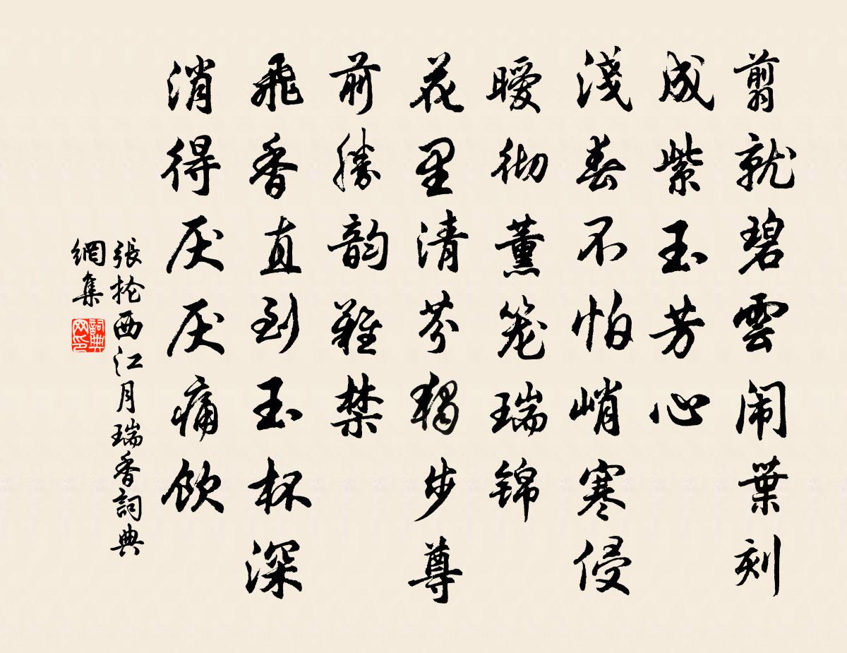詩詞名句歷史字典書法欣賞書法字典國語詞典說文解字康熙字典古漢語字典標 題 作 者 詩 句 西江月(瑞香)作者:張掄 朝代:宋代西江月(瑞香)原文翦就碧雲鬧葉,刻成紫玉芳心。淺春不怕峭寒侵。曖徹薰籠瑞錦。花里清芬獨步,尊前勝韻難禁。飛香直到玉杯深。消得厭厭痛飲。詩詞問答問:西江月(瑞香)的作者是誰?答:張掄問:西江月(瑞香)寫於哪個朝代?答:宋代問:西江月(瑞香)是什麼體裁?答:詞張掄西江月(瑞香)書法欣賞西江月(瑞香)書法作品詩詞推薦江南別友人張喬〔唐代〕勞生故白頭,頭白未應休。闕下難孤立,天涯尚旅遊。聽猿吟島寺,待月上江樓。醉別醒惆悵,雲帆滿亂流。送程子方歸蜀仇遠〔宋代〕風雪飄蕭季子裘,大江西泝過荊州。洲家無計歸蔥肆,歲晚何人付麥舟。長子應門寬後慮,輕帆入峽及春遊。明年夢上山 時足疾未平。白居易〔唐代〕夜夢上嵩山,獨攜藜杖出。千岩與萬壑,遊覽皆周畢。夢中足不病,健似少年日。既悟神返初,依然舊形質。始知和郡侯勸駕韻姚勉〔宋代〕聖朝珍重設儒科,總總英賢入禮羅。天下豈無偕計上,日邊此獨得人多。仙橋快應龍頭讖,工席忻聆燕衎歌。雅志賀陳內翰去非三首朱翌〔宋代〕放到甘泉捷,光搖建曉魁。唐家方再造,漢德已重開。太史書雲後,群公賀雪回。十行寬大詔,早晚出銀台。百花台曾鞏〔宋代〕煙波與客同樽酒,風月全家上采舟。莫問台前花遠近,試看何以武陵游。和施耕進士憶竹強至〔宋代〕夫子臥古屋,趣敵岩谷深。六籍環一身,口誦頭不簪。瘦碧久去眼,寂寞清風心。朝思蔭之醉,暮思繞以吟。秋空楊梅蘇泂〔宋代〕每勤蕨葉護筠籠,獨自還丹表里戲。留與越人共夏祭,莫教惡雨打成空。敬陪直院右史上已後一日西齋之集葉紹翁〔宋代〕清時天上詔書稀,曲水從游許布衣。插羽滿浮寒食酒,倚欄同憶故山薇。碧桃繞觀春風靜,柔櫨搖汀夕照微。慨想次韻楊褒早春蘇軾〔宋代〕窮巷淒涼苦未和,君家庭院得春多。不辭瘦馬騎沖雪,來聽佳人暗踏莎。破恨徑須煩麴糵,增年誰復怨羲娥。良辰題渡水羅漢畫龐謙孺〔宋代〕偏袒右肩赤一膊,開顏含笑不作惡。廣深莫種金蓮花,故使浮杯襯雙腳。心既忘形亦忘怖,徒使旁觀毛髮豎。本無復病三首蘇轍〔宋代〕寒作埋冰雪,熱攻投火湯。今生那有此,宿業未應亡。委順一無損,力爭徒自傷。頹然付一榻,是處得清涼。醉花陰·薄霧濃雲愁永晝李清照〔宋代〕薄霧濃雲愁永晝。瑞腦消金獸。佳節又重陽,玉枕紗廚,半夜涼初透。東籬把灑黃昏後,有暗香盈袖。莫道不消魂途中寒食白居易〔唐代〕路旁寒食行人盡,獨占春愁在路旁。馬上垂鞭愁不語,風吹百草野田香。與王子煥席大光同游廖園陳與義〔宋代〕三枝筇竹興還新,王丈席兄俱可人。僑立司州溪水上,吟詩把酒對青春。閒賦許月卿〔宋代〕老大天諳練,殷勤月往還。岩巒有奇操,泉石亦清淡。隔浦飛秋葉,開窗看夕山。天心端正月,潭水夜深參。會友王冕〔元代〕蠟屐沖寒雨,紫門啟曉雲。相忘不問訊,長久卻論文。煮茗山泉活,移花野色分。城中甚喧雜,此地寂無聞。次韻杜無逸西園獨坐九絕句傅察〔宋代〕折腰為五斗,我已愧淵明。共赴東林約,悵然懷友生。題朱四郊墅宋祁〔宋代〕菌閣平窺倚杵天,綺塍鱗隰逗春泉。誰將六國黃金印,擬換東周二頃田。春風樓況志寧〔宋代〕晴日遊絲拂畫欄,酒帘輕颺碧雲端。春風蝴蝶知何處,愁切江南曲已殘。名句推薦低頭獨長嘆,此嘆無人喻。白居易《買花 / 牡丹》 言可省時休便說,步宜留處莫胡行。馮夢龍《醒世恆言·卷十四》 清漏漸移相望久,微雲未接過來遲。李商隱《辛未七夕》 凡軍欲其眾也,心欲其一也,三軍一心則令可使無敵矣。李昉、李穆、徐鉉《太平御覽·兵部·卷二》 相思了無益,悔當初相見。朱彝尊《憶少年·飛花時節》 日暮東風怨啼鳥,落花猶似墜樓人。杜牧《金谷園》 長江如虹貫,蟠繞其下。宋濂《閱江樓記》 山川蕭條極邊土,胡騎憑陵雜風雨。高適《燕歌行》 嫁得瞿塘賈,朝朝誤妾期。李益《江南曲》 狂風落盡深紅色,綠葉成陰子滿枝。杜牧《悵詩》