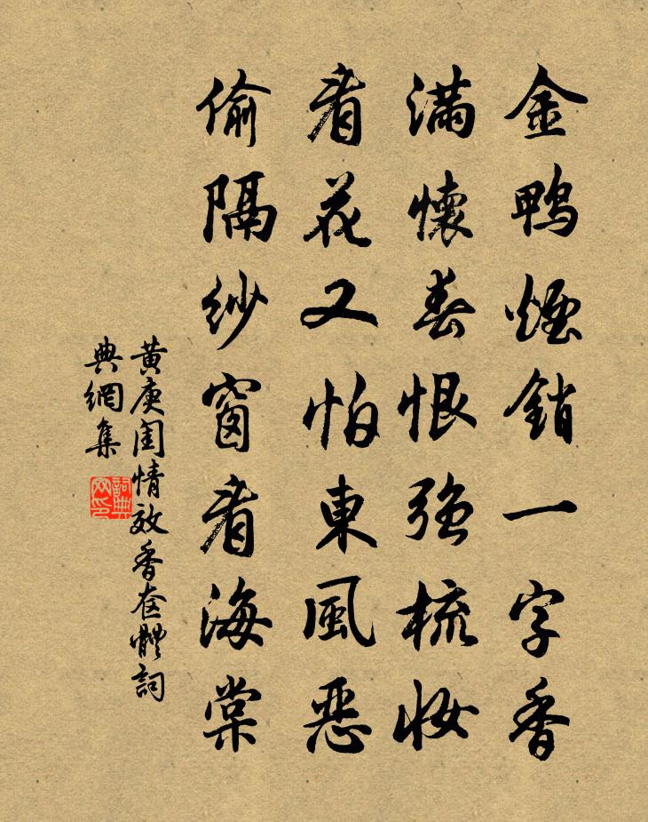 詩詞名句歷史字典書法欣賞書法字典國語詞典說文解字康熙字典古漢語字典標 題 作 者 詩 句 閨情效香奩體作者:黃庚 朝代:宋代閨情效香奩體原文金鴨煙銷一字香,滿懷春恨強梳妝。看花又怕東風惡,偷隔紗窗看海棠。詩詞問答問:閨情效香奩體的作者是誰?答:黃庚問:閨情效香奩體寫於哪個朝代?答:宋代黃庚閨情效香奩體書法欣賞閨情效香奩體書法作品詩詞推薦秋風三首張耒〔宋代〕秋風蕭蕭吹野桑,田家黍稷初登場。雉肥兔飽鷹隼健,水落沙冷魚龍藏。長淮煙波渺千里,悵望搔首山川長。二年用大東萊臨川詩韻示諸兒馬廷鸞〔宋代〕惠子五車書,彼富吾何慊。滔滔歲崢嶸,濯濯木荏苒。前榮悼虛誇,新懦就退斂。東鄰有碩師,簦篋孰雲遠。斯文上元夜效小庾體高瑾〔唐代〕初年三五夜,相知一兩人。連鑣出巷口,飛轂下池漘。燈光恰似月,人面並如春。遨遊終未已,相歡待日輪。姑蘇館陳允平〔宋代〕楚岫高低接太行,吳江渺漠下滄浪。秋城霜滿葦花白,夜館月寒莎草黃。芳苑鹿台初解佩,故宮鸞閣尚鳴璫。五湖生查子·春山煙欲收牛希濟〔唐代〕春山煙欲收,天澹星稀小。殘月臉邊明,別淚臨清曉。語已多,情未了,回首猶重道:記得綠羅裙,處處憐芳草。曆日許月卿〔宋代〕曆日從頭又一新,直饒燕雀喜新晴。梅花獻歲無邊景,喜鵲今朝第一聲。柳眼知時王幕綠,草心報國漢朝青。日晴南亭文同〔宋代〕晚衙初散吏人歸,獨立南亭著道衣。淺酒小詩聊自樂,此心渾欲外輕肥。小溪道中時己亥荒甚車若水〔宋代〕風前有地皆榆葉,秋後何人問菊花。客路一杯茅店酒,相逢僧亦話生涯。答晦步求飲李復〔宋代〕墨客高吟動碧雲,蕢桴輕笑鼓雷閽。千尋自分遺樗散,百和何堪借棗昏。按劍夜光驚暗擲,揮弦流水喜新論。久聞雜劇·摩利支飛刀對箭佚名〔元代〕第一折(沖末徐懋功領卒子上,雲)少年錦帶掛吳鉤,鐵馬西風塞草秋。全憑匣中三尺劍,坐中往往覓封侯。老夫頌古一百則釋正覺〔宋代〕切瑳琢磨,變態餚訛。葛陂化龍之杖,陶家居蟄之梭。同條生兮有數,同條死兮無多。末後句,只這是,風舟載月虞美人(寄情)王齊愈〔宋代〕黃金柳嫩搖絲軟。永日堂堂掩。捲簾飛燕未歸來。客去醉眠敧枕、殢殘杯。眉山淺拂青螺黛。整整垂雙帶。水沈香成都遨樂詩二十一首二十八日竭生祿祠游淨田況〔宋代〕千騎出重闉,岩祠淨宇鄰。映林沽酒斾,迎馬獻花人。艷日披江霧,香飈起路塵。韶華特明媚,不似遠方春。紹興祈谷三首佚名〔宋代〕三陽筆新,萬物資始。精誠祈天,其聽斯邇。顧均雨晴,田疇之喜。如坻如京,以人百禮。送李廷評知福清縣余靖〔宋代〕世閥茂儒紳,甌閩寵命新。縣圖遙盡海,鄉樹密藏春。供帳鶯將老,登車雉已馴。行聞趨召節,舊美政如神。謝都督輓歌上官儀〔唐代〕漠漠佳城幽,蒼蒼松檟暮。魯幕飄欲卷,宛駟悲還顧。楚挽繞廬山,胡笳臨武庫。悵然郊原靜,煙生歸鳥度。太常引 題朝宗亭督孟博早歸 以上三首見元草薛昂夫〔元代〕冷煙千頃釀寒威。曉霜重壓征衣。休教六花飛。憶尚有、遊人未歸。江空歲晚,故園秋老,行色莫依違。特地與君和張器先十絕楊萬里〔宋代〕漏黃官柳巳垂牆,針水公畦未種秧。多謝詩人來得得,蹈開三徑雨中荒。謝倅生日陳傅良〔宋代〕此夕其如好客何,秋風嫋嫋水微波。渡 * 今無恙,上蔡家聲世不多。未放清朝空老去,欲談前事竟誰過。阻陪閒遊白居易〔唐代〕外事因慵廢,中懷與靜期。尋泉上山遠,看筍出林遲。白石磨樵斧,青竿理釣絲。澄清深淺好,最愛夕陽時。名句推薦葡萄美酒夜光杯,欲飲琵琶馬上催。王翰《涼州詞二首·其一》 酒闌歌罷玉尊空,青缸暗明滅。李清照《好事近·風定落花深》 嗟余聽鼓應官去,走馬蘭台類轉蓬。李商隱《無題·昨夜星辰昨夜風》 賢能不待次而舉,罷不能不待須而廢,元惡不待教而誅,中庸民不待政而化荀子《荀子·王制》 立身不高一步立,如塵里振衣、泥中濯足,如何超達?洪應明《菜根譚·概論》 機關算盡太聰明,反算了卿卿性命。曹雪芹《紅樓夢·第五回》 不才明主棄,多病故人疏。孟浩然《歲暮歸南山 / 歸故園作 / 歸終南山》 提籠忘采葉,昨夜夢漁陽。張仲素《春閨思》 臨水一長嘯,忽思十年初。白居易《垂釣》 天下殆哉,岌岌乎。孟子《孟子·萬章章句上·第四節》