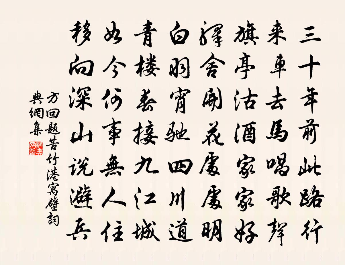 詩詞名句歷史字典書法欣賞書法字典國語詞典說文解字康熙字典古漢語字典標 題 作 者 詩 句 題苦竹港寓壁作者:方回 朝代:宋代題苦竹港寓壁原文三十年前此路行,來車去馬唱歌聲。旗亭沽酒家家好,驛舍開花處處明。白羽宵馳四川道,青樓春接九江城。如今何事無人住,移向深山說避兵。詩詞問答問:題苦竹港寓壁的作者是誰?答:方回問:題苦竹港寓壁寫於哪個朝代?答:宋代方回題苦竹港寓壁書法欣賞題苦竹港寓壁書法作品詩詞推薦遠遊鄭谷〔唐代〕江湖猶足事,食宿戍鼙喧。久客秋風起,孤舟夜浪翻。鄉音離楚水,廟貌入湘源。岸闊鳧鷖小,林垂橘柚繁。津官贈王寂蘇軾〔宋代〕與君暫別不須嗟,俯仰歸來鬢未華。記取江南煙雨里,青山斷處是君家。送梁卿王郎中使東蕃吊冊崔湜〔唐代〕梁侯上卿秀,王子中台傑。贈冊綏九夷,旌旃下雙闕。西堂禮樂送,南陌軒車別。征路入海雲,行舟溯江月。茲邦玉樓春莫崙〔宋代〕綠楊芳徑鶯聲小。簾幕烘香桃杏曉。餘寒猶峭雨疏疏,好夢自驚人悄悄。憑君莫問情多少。門外江流羅帶繞。直饒丹丘道中釋寶曇〔宋代〕綠繞溝塍水正肥,誰家深樹有黃鸝。只知夜雨扶犁日,豈識春風便面時。白髮歸來須早計,黃金散盡未全痴。孤雲句釋曉瑩〔宋代〕與君頻邂逅,此地久盤桓。題鄭大惠詩卷葉適〔宋代〕憶從草廬赴鄰炊,澀雪攪筵糟涌糜。要當醺酣活膚腠,不許雕刻妨肝脾。何年兒孫錦繃裂,金塗門扉玉為切。吟中相和歌辭。子夜春歌王翰〔唐代〕春氣滿林香,春遊不可忘。落花吹欲盡,垂柳折還長。桑女淮南曲,金鞍塞北裝。行行小垂手,日暮渭川陽。謝蘊文承議陽關圖晁說之〔宋代〕邂逅故人逃難處,王孫氣象獨昇平。詩吟摩詰如無味,畫到陽關別有情。宮詞楊皇后〔宋代〕曉窗生白已鶯啼,啼在宮花第幾枝。煙斷獸爐香未絕,曲房朱戶夢回時。虞美人·弄梅騎竹嬉遊日王國維〔清代〕弄梅騎竹嬉遊日。門戶初相識。未能羞澀但嬌痴。卻立風前散發襯凝脂。近來瞥見都無語。但覺雙眉聚。不知何日喜賀拔先輩衡陽除正字周朴〔唐代〕黃紙晴空墜一緘,聖朝恩澤洗冤讒。李膺門客為閒客,梅福官銜改舊銜。名自石渠書典籍,香從芸閣著衣衫。寰中漁父詞(寶公)惠洪〔宋代〕來往獨龍岡畔路。杖頭落索間家具。後事前觀如目睹。非讖語。須知一念無今古。長笑老蕭多病苦。笑中與藥皆狼送郝同知方回〔宋代〕仆昔塵忝歲壬戌,甲科為首降為乙。宰相謂己□□□,□實見怒出私臆。漢東掌教大洪山,寄名帥幕□□。□陵還寄題台州倅廳雲壑樓鑰〔宋代〕頃年登臨赤城裡,江繞城中萬家市。治中寄我雲壑圖,快讀新詩眼如洗。回思歲月如星流,念念飛空尋舊遊。披圖皇后閣端午貼子詞五首真德秀〔宋代〕讀罷懷沙賦,重喔卷耳篇。殷勤勸明主,屬意在求賢。道院偶成二首葉茵〔宋代〕水生遠岸折蒲芽,春色駸駸染物華。伎{作右換養}一詩安老草,眵昏兩眼眩空花。樓分古柳煙光薄,橋倚青簾日念奴嬌傅大詢〔宋代〕江梅破臘,把一枝來報,□春訊息。錦帳銀瓶龍麝暖,畫燭光搖金碧。雨徑桃花,一溪流水,路入神仙宅。雲裳羽次韻梅守著作喜守粹冬杪祈雪春初獲應之什強至〔宋代〕郡境時雖泰,江鄉臘已深。群情憂雪晚,精意喜天忱。夙駕才分禱,春空倏變陰。銀成佛氏界,瓊掩帝家林。始向浣溪沙李之儀〔宋代〕昨日霜風入絳帷,曲房深院繡簾垂。屏風幾曲畫生枝。酒韻漸濃歡漸密,羅衣初試漏初遲。已涼天氣未寒時。名句推薦秋風清,秋月明,落葉聚還散,寒鴉棲復驚。李白《三五七言 / 秋風詞》 今朝有酒今朝醉,明日愁來明日憂。佚名《增廣賢文·上集》 江闊雲低、斷雁叫西風。蔣捷《虞美人·聽雨》 愛人者人恆愛之,敬人者人恆敬之。孟子《孟子·離婁章句下·第二十八節》 江淮度寒食,京洛縫春衣。王維《送綦毋潛落第還鄉 / 送別》 臨難不顧生,身死魂飛揚阮籍《詠懷其五十三》 暮雨相呼失,寒塘欲下遲。崔塗《孤雁二首·其二》 親所好,力為具。親所惡,謹為去。李毓秀《弟子規·入則孝》 朝來入庭樹,孤客最先聞。劉禹錫《秋風引》 善有善報,惡有惡報。不是不報,時候未到。佚名《增廣賢文·上集》