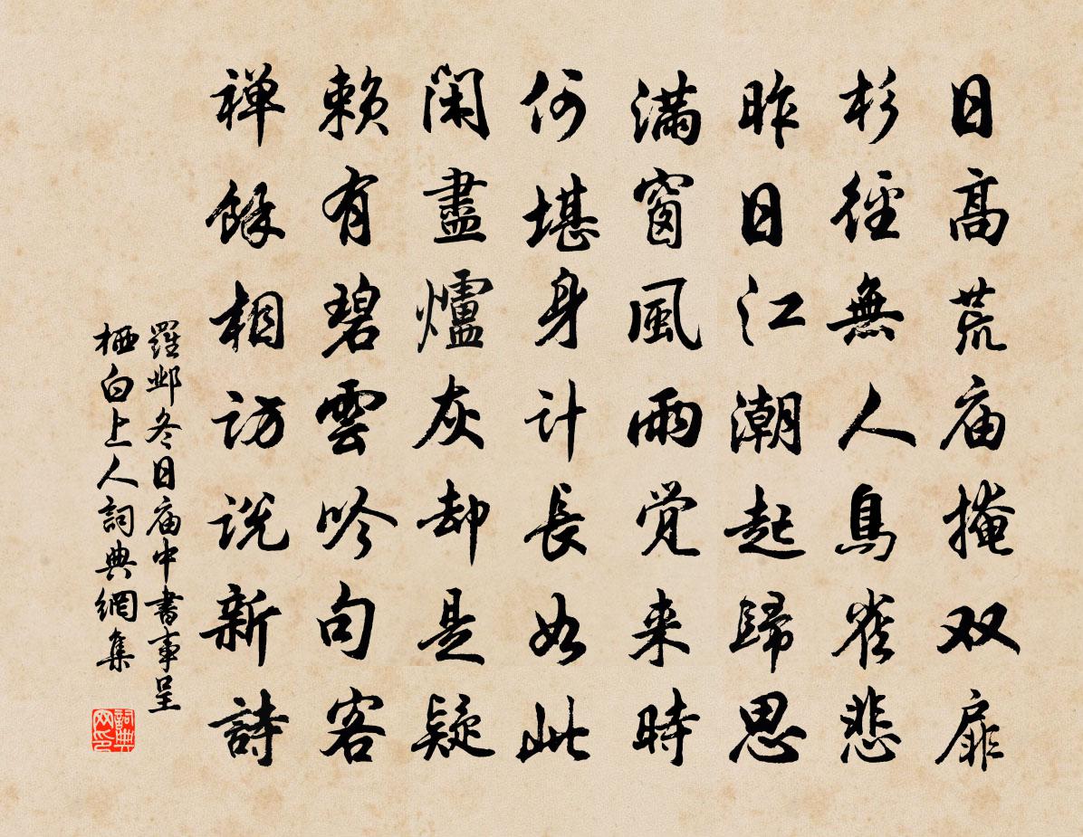 詩詞名句歷史字典書法欣賞書法字典國語詞典說文解字康熙字典古漢語字典標 題 作 者 詩 句 冬日廟中書事呈棲白上人作者:羅鄴 朝代:唐代冬日廟中書事呈棲白上人原文日高荒廟掩雙扉,杉徑無人鳥雀悲。昨日江潮起歸思,滿窗風雨覺來時。何堪身計長如此,閒盡爐灰卻是疑。賴有碧雲吟句客,禪餘相訪說新詩。詩詞問答問:冬日廟中書事呈棲白上人的作者是誰?答:羅鄴問:冬日廟中書事呈棲白上人寫於哪個朝代?答:唐代問:冬日廟中書事呈棲白上人是什麼體裁?答:七律羅鄴冬日廟中書事呈棲白上人書法欣賞冬日廟中書事呈棲白上人書法作品注釋全唐詩:卷654-136詩詞推薦仁宗皇帝輓詞三首曾鞏〔宋代〕納諫終無牾,無人久更明。恩波通四海,壽域載群生。異俗衣裳會,諸儒雅頌聲。威靈空想像,盛德詎能名。鳳棲梧(婺州席上·五之三)張綱〔宋代〕風動飛E648迎曉霽。銀海光浮,宴啟群仙會。騎省流芳誰可繼。尊前看取連枝貴。華發衰翁羞晚歲。未報皇恩桂宋度宗〔宋代〕秋桂庭前霽影涼,萬重深翠護深黃。恭迎兩殿臨清賞,壽斚濃浮月殿香。沁園春 題畫骷髏吳鎮〔元代〕漏*元陽,爹娘搬販,至今未休。百種鄉音,千般狃扮,一生人我,幾許機謀。有限光陰,無窮活計,急急忙忙作簡陸務觀史君編修二首楊萬里〔宋代〕聞道雲間陸士龍,釣台絕頂嘯清風。卻將半掬催詩雨,灑入山村作歲豐。病後小健戲題陸游〔宋代〕行年九十未龍鍾,慚愧天公久見容。醉解病人詩解廋,不如世世作春農。題濟勝七物六釘鞋陳造〔宋代〕幾步山間屬雨餘,徐行猶可當安輿。計功高出芒鞋上,傍險沖泥得屢書。沉醉東風盧摯〔元代〕掛絕壁松枯倒倚,落殘霞孤鶩齊飛。四周不盡山,一望無窮水,散西風滿天秋意。夜靜雲帆月影低,載我在瀟湘畫固陵道中三首文天祥〔宋代〕固陵城下兩龍爭,不見齊王來會兵。勒取河山新分地,項王之後到韓彭。留別張水部籍項斯〔唐代〕省中重拜別,兼領寄人書。已念此行遠,不應相問疏。子城西並宅,御水北同渠。要取春前到,乘閒候起居。諸公皆和詩再用韻並屬湛挺之七首趙蕃〔宋代〕吳楚他鄉外,沅湘久客間。已知身若贅,詎惜鬢成斑。酒債貧常有,詩壇老倦攀。窮猿難擇木,怨鶴望還山。臧正卿示舊所唱酬秋字韻詩軸要季承同用韻贈趙蕃〔宋代〕平生人物論,自謂富陽秋。滿世多遺恨,相逢足破愁。獨憐金錯罄,虛負木瓜投。風節他年事,期君折檻游。題魏野園祖無擇〔宋代〕曉日東郊扣隱扉,瞳瞳初日弄朱旗。黃稍風舞先生柳,紫頰霜殷大谷梨。粉艷清歌穿邃閣,碧溪寒韻落幽池。我來和祖擇之學士袁州慶豐堂十詠陳詵〔宋代〕穢草誅還密,浮萍去又生。輒污如鑒淨,有客若為情。所聞羅公升〔宋代〕試問南來雁,何時戰馬閒。古聞侵柳塞,今見入梅關。南海潮方怒,西江士不還。淒涼廣州婦,萬里沒燕山。禪人並化主寫真求贊釋正覺〔宋代〕發白寒山有雪,眼深秋井澄波。混沌鑿那亡大道,崑崙源自髮長河。一笑十方三世事,不妨隨處薩婆訶。秋字韓愈〔唐代〕淮南悲木落,而我亦傷秋。況與故人別,那堪羈宦愁。榮華今異路,風雨昔同憂。莫以宜春遠,江山多勝游。禪師(一作西峰頂)張籍〔唐代〕獨在西峰頂,年年閉石房。定中無弟子,人到為焚香。禪人寫真求贊釋正覺〔宋代〕看看靜,見其端。星河斗濕,月窟蟾寒。體無稜縫,用絕痕瘢。不須喝彩還贏也,已見雙雙六在盤。入湧泉道中程師孟〔宋代〕寒林已見早梅芳,盡日臨流野與長。門外牛羊人自得,籬邊雞犬盜誰防。三江夜色滄浪白,千里秋香{禾巴}稏黃名句推薦何時倚虛幌,雙照淚痕乾。杜甫《月夜》 絲長魚誤恐,枝弱禽驚踐。崔護《五月水邊柳》 世上無難事,只怕不專心。佚名《增廣賢文·下集》 昨別今已春,鬢絲生幾縷。韋應物《長安遇馮著》 聖人不期修古,不法常可,論世之事,因為之備。韓非及後人《韓非子·五蠹》 楊枝飄泊,桃根嬌小,獨自個思量。項鴻祚《太常引·客中聞歌》 只恐雙溪舴艋舟,載不動許多愁。李清照《武陵春·春晚》 中軍置酒飲歸客,胡琴琵琶與羌笛。岑參《白雪歌送武判官歸京》 群燕辭歸鵠南翔,念君客游多斷腸。曹丕《燕歌行》 寧不知傾城與傾國。佳人難再得。李延年《李延年歌》