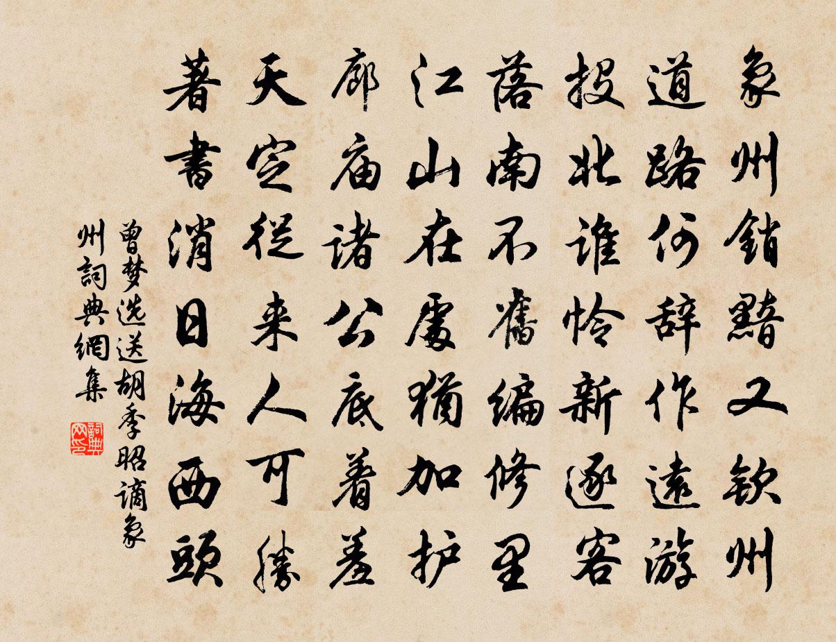詩詞名句歷史字典書法欣賞書法字典國語詞典說文解字康熙字典古漢語字典標 題 作 者 詩 句 送胡季昭謫象州作者:曾夢選 朝代:宋代送胡季昭謫象州原文象州銷黯又欽州,道路何辭作遠遊。投北誰憐新逐客,落南不舊編修里。江山在處猶加護,廊廟諸公底著羞。天定從來人可勝,著書消日海西頭。詩詞問答問:送胡季昭謫象州的作者是誰?答:曾夢選問:送胡季昭謫象州寫於哪個朝代?答:宋代曾夢選送胡季昭謫象州書法欣賞送胡季昭謫象州書法作品詩詞推薦望蓬萊 遊興丘處機〔元代〕飄蓬客,天賜水雲閒。自在行時無日月,相隨到處有蓑蠻。風雨亦開顏。修煉事,地軸鎖天關。出有入無三尺劍,古意十四首章雲心〔宋代〕百川畢東注,兩丸盡西頹。二物常汲汲,未嘗少徘徊。短生亦如斯,逝者良可哀。自昔青雲士,皆為黃土堆。何如再用韻寄丁知縣三首陳造〔宋代〕南樓酌酒未分襟,啅鵲啼烏亦好音。晴日倒紅生笑頰,煙梧搖淥漲杯心。可堪歲月供行色,盡把江山博醉吟。不斷折桂令劉庭信〔元代〕想人生最苦離別。三個字細細分開,淒淒涼涼無了無歇。別字兒半晌痴呆,離字兒一時拆散,苦字兒兩下里堆疊。同楊仲禮和袁集賢上都詩柳貫〔元代〕出塞行瞻日,趨朝喜近天。離宮開苑囿,馳道絕風煙。瑤水巡非遠,峒山歷更綿。甘泉多法從,獻賦憶當年。往回臨安口號八首蘇泂〔宋代〕老銛相見一欣然,說似艱虞是去年。從此新詩更超詣,時人慾殺豈無天。臨江仙李之儀〔宋代〕九十日春都過了,尋常偶到江皋。水容山態兩相饒。草平天一色,風暖燕雙高。酒病厭厭何計那,飛紅更送無聊。元信昨日惠八桂酒兩尊今日惠蓮數頭實圓而大鄭剛中〔宋代〕盆池初泛小青錢,俄有盈盈淡佇仙。香老不隨明玉墮,子肥爭露寶珠圓。乍披紺色神都爽,欲擘柔房意尚憐。檢點贈日東鑒禪師鄭谷〔唐代〕故國無心渡海潮,老禪方丈倚中條。夜深雨絕松堂靜,一點山螢照寂寥。吳正仲遺二物詠之其二疊石梅堯臣〔宋代〕十片寒湖滑,千秋白浪根。蒼蒼古崖色,疊疊老苔痕。欲象巨鰲頂,俯當科斗盆。唯愁作險說,平地起崑崙。次韻秉國種菊於石〔宋代〕淵明令彭澤,自謂歸來好。外物一無累,剛被菊花惱。東籬興悠然,一醉舒懷抱。陶沒已千載,愛菊人何少。誰能送鄭嚴州四首陳鑒之〔宋代〕諸賢適江海,梧竹孤鳳吟。願言正王度,祈招嗣清音。亦為膠西董,反慰及物心。未可賦柏舟,天眷宗社深。感花吳芾〔宋代〕正欲持杯賞萬紅,卻遭連日雨兼風。種花欲看難如此,可是衰翁賦分窮。伍主簿輓詞樓鑰〔宋代〕由來風誼獨穹然,坐享家肥不計年。墮幘何妨各百萬,指囷寧復問三千。靈椿老去仁宜壽,玉樹種成身已仙。袞袞次韻答史太博李覯〔宋代〕驛使將詩訪遠山,發函寧暇正衣冠。秦城未割難論價,燕谷才吹已不寒。佔畢有心忘老至,惰農無罰賀恩寬。一枝晚作趙蕃〔宋代〕古屋黃昏蝙蝠飛,爾飛乾我竟何為。但愁蚊子且生翼,飽爾亦當侵我肌。題公牘曾國藩〔清代〕官兒盡大有何榮?字數太多看不清。減去數行重刻過,留教他日作銘旌。偈頌二十一首釋智愚〔宋代〕乾坤之內,宇宙之間,中有一寶,秘在形山。喜遷鶯(壽薛樞密)程珌〔宋代〕去年玉燕,記曾期今歲,瑤光入度。今日都人,從頭屈指,儘是黑頭公輔。爭道一朝語合,誰信千齡際遇。更積雨霜天曉角(和趙教授韻)吳潛〔宋代〕新詞唱徹,字字珠璣屑。更有張顛草聖,何止是、成雙絕。金粟如霏雪,掃地為芳席。且令諸公一笑,怕明夜、無名句推薦飛光飛光,勸爾一杯酒。李賀《苦晝短》 山檣谷塹依然在,弱吐強吞盡已空。杜牧《題武關》 言無二貴,法不兩適。韓非及後人《韓非子·問辯》 三思而行,再思可矣。佚名《增廣賢文·上集》 鷺窺蘆箔水,鳥啄紙錢風。范成大《寒食郊行書事》 股肱體合,則四海和平;上下猜貳,則封疆幅裂。姚察、姚思廉《梁書·列傳·卷五十六》 邊雪藏行徑,林風透臥衣。賈島《送鄒明府游靈武》 白髮漁樵江渚上,慣看秋月春風。楊慎《臨江仙·滾滾長江東逝水》 大樹無枝向北風,十年遺恨泣英雄。高啟《吊岳王墓》 歸雲一去無蹤跡,何處是前期?柳永《少年游·長安古道馬遲遲》