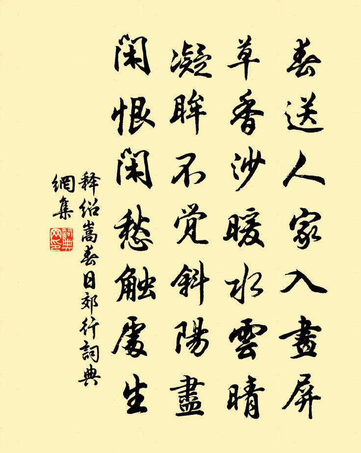 詩詞名句歷史字典書法欣賞書法字典國語詞典說文解字康熙字典古漢語字典標 題 作 者 詩 句 春日郊行作者:釋紹嵩 朝代:宋代春日郊行原文春送人家入畫屏,草香沙暖水雲晴。凝眸不覺斜陽盡,閒恨閒愁觸處生。詩詞問答問:春日郊行的作者是誰?答:釋紹嵩問:春日郊行寫於哪個朝代?答:宋代釋紹嵩春日郊行書法欣賞春日郊行書法作品詩詞推薦夏日十二首張耒〔宋代〕種藥幽人事,還披木草經。出川拋舊翠,過雨有新青。術受壺中秘,方傳肘後靈。不辭勤服餌,為變發星星。樓上曲張元乾〔宋代〕樓外夕陽明遠水。樓中人倚東風裡。何事有情怨別離。低鬟背立君應知。東望雲山君去路。斷腸迢迢盡愁處。明朝登西湖北樓丘濬〔宋代〕澄霽無涯混一區,似開塵綱到華胥。圖抨水墨煙昏處,國占清涼月上初。雲夢澤寬城邑遠,華嚴川好酒胥疏。祇期聞瀑布冰折馬戴〔唐代〕萬仞冰峭折,寒聲投白雲。光搖山月墮,我向石床聞。寒夜曲朱渙〔宋代〕寒夜夜政長,愁人背燈立。驚風搖竹樹,棲鳥墮復集。山空接響多,室靜虛白入。怊悵不成眠,殘鍾曉邊急。題簡齋陳與義〔宋代〕我窗三尺余,可以閱晦明。北省雖巨麗,無此風竹聲。不著散花女,而況使鬼兄。世間多歧路,居士繩床平。未知次歸耕堂稀字韻楊冠卿〔宋代〕湖山春花杏花稀,柳絮漫空作雪飛。橫槊賦詩有餘暇,不妨倒載送春歸。和監丞去歲賦岩桂王洋〔宋代〕南方火老不告疲,秋物過半新涼時。嫦娥剪花趙時節,新月借色天風吹。平生仰望婆娑影,一日坐對連蜷枝。異時劍池林景熙〔宋代〕鑿開神斧是何年,珠雁金鳧鎖冷煙。薜荔帶雲懸古木,轆轤卷月出秋泉。岩前洗劍精疑伏,林下烹茶味亦禪。高倚贈達西堂趙師秀〔宋代〕秋水數枝蓮,在師房畫這。固應通淨理,不復念生緣。舊願酬初滿,靈方許盡傳。閒詢曾住寺,如夢已茫然。木蘭花慢 和鄭禧吳氏女〔元代〕愛風流俊雅,看筆下,掃雲煙。正困倚書窗,慵拈針線,懶詠詩篇。紅葉未知誰寄,慢躊躇、無語小窗前。燕子知吳興新堤朱慶餘〔唐代〕春堤一望思無涯,樹勢還同水勢斜。深映菰蒲三十里,晴分功利幾千家。謀成既不勞人力,境遠偏宜隔浪花。若與送祖擇之司馬光〔宋代〕人生榮與辱,百變似浮雲。自有窮通定,徒勞得喪分。銷愁唯有酒,娛意莫如文。方寸常蕭散,其餘何足雲。依韻答青州富資政見寄范仲淹〔宋代〕樞府當年日輦襄,隱然一柱在明堂。親逢英主開前席,力與皇家正舊章。直道豈求安富貴,純誠惟欲助清光。龔黃山園小梅得疏影橫斜水清淺暗香浮動月黃十四趙時韶〔宋代〕一夜霜風吃緊吹,曉驚飛鳥蹴花枝。誰知窗外紛紛意,正是山陰雪下時。送子由使契丹蘇軾〔宋代〕雲海相望寄此身,那因遠適更沾巾。不辭驛騎凌風雪,要使天驕識鳳麟。沙漠回看清禁月,湖山應夢武林春。單于次韻和台源諸篇九首之南屏山黃庭堅〔宋代〕襞積藍光刻削成,主人題作正南屏。身更萬事已頭白,相對百年終眼青。煙雨數峰當隱几,林塘一帶是中庭。紅塵秋分一首蘇籀〔宋代〕礎濕嵐昏近海多,劍霜清刮手親磨。輪囷馬棧非難整,索漠牛衣且勿呵。好住延陵皋澤去,強同溱洧濟人過。坐令滿庭芳黃庭堅〔宋代〕修水濃青,新條淡綠,翠光交映虛亭。錦鴛霜鷺,荷徑拾幽苹。香渡欄乾屈曲,紅妝映、薄綺疏欞。風清夜,橫塘病中寄曾使君湖上曹勛〔宋代〕露曉紅幢綠蓋明,使君千騎會耆英。笙歌遞奏連雲上,荷芰傳香拂面清。遐想雅歡均四坐,欲尋幽夢下重成。負薪名句推薦東風惡,歡情薄。陸游《釵頭鳳·紅酥手》 邊兵春盡回,獨上單于台。張蠙《登單于台》 論至德者不和於俗,成大功者不謀於眾。司馬遷《史記·趙世家》 以色事他人,能得幾時好。李白《妾薄命》 軍井成而後飲,軍食熟而後飯,軍壘成而後舍,勞佚必以身同之。尉繚《尉繚子·戰威》 驟雨過,珍珠亂撒,打遍新荷。元好問《驟雨打新荷》 獨抱濃愁無好夢,夜闌猶剪燈花弄。李清照《蝶戀花·暖雨晴風初破凍》 貧者士之常也,死者人之終也,處常得終,當何憂哉?列子及其弟子《列子·天瑞》 君看石芒碭,掩淚悲千古李白《丁督護歌》 孔雀東南飛,五里一徘徊。佚名《孔雀東南飛 / 古詩為焦仲卿妻作》