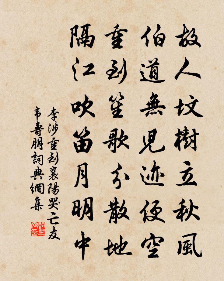 詩詞名句歷史字典書法欣賞書法字典國語詞典說文解字康熙字典古漢語字典標 題 作 者 詩 句 重到襄陽哭亡友韋壽朋作者:李涉 朝代:唐代重到襄陽哭亡友韋壽朋原文故人墳樹立秋風,伯道無兒跡便空。重到笙歌分散地,隔江吹笛月明中。詩詞問答問:重到襄陽哭亡友韋壽朋的作者是誰?答:李涉問:重到襄陽哭亡友韋壽朋寫於哪個朝代?答:唐代李涉重到襄陽哭亡友韋壽朋書法欣賞重到襄陽哭亡友韋壽朋書法作品詩詞推薦系纜鄭克已〔宋代〕系纜縈迴浪,昏林入暮鴉。水窮人有路,天盡客無家。蕉葉浮春蟻,魚歌隔蒲沙。醉眠星斗下,尋夢卜年華。用一代不數人百年能幾見為韻詩賦十章呈陳君趙蕃〔宋代〕人言會合難,會合端有數。公不絕櫧洲,我政長沙住。仆所至未嘗出遊過長蘆聞復禪師病甚不可不一蘇軾〔宋代〕亦知壺子不死,敢問老聃所游。瑟瑟寒松露骨,眈眈病虎垂頭。莫言西蜀萬里,且到南華一游。扶病江邊送客,杖次韻知縣三兄蘇泂〔宋代〕楊柳依依萬縷絲,梅花無計與扶衰。十分酒滿悶如昨,一半春休雨未知。安得詩書成保社,略容岩壑有心期。扁舟贈禪客智仁釋智愚〔宋代〕法戰場中樹勝旗,話頭何似問頭危。古人減灶添兵處,切忌交鋒蹉過伊。排悶陸游〔宋代〕造物冥冥中,與我無一面,不知獲罪由,動輒被訶遣;又若哀其愚,救以藥瞑眩。我亦揣此心,安受不敢怨。中間孫叔度輓詩史堯弼〔宋代〕簡州古遺直,冰雪映當代。茫茫幾回首,凜凜欲無對。居無屋漏愧,動必繩墨內。秋風看獨立,縹緲一蘭佩。從先摸魚兒(生日自述)吳泳〔宋代〕甚一般、化工模子。鑄成一個拙底。生來不向春頭上,卻跨暮春婪尾。驀省記。早冉冉花陰,НН循除水。雖然恁烏夜啼潘牥〔宋代〕無端小雪廉纖。入平檐。金鴨旋添龍餅,莫開簾。尋梅約。開還落。可曾忺。合作一年春恨,上眉尖。山中寄樊僕射(一作寄襄陽樊司空)於鵠〔唐代〕卻憶東溪日,同年事魯儒。僧房閒共宿,酒肆醉相扶。天畔雙旌貴,山中病客孤。無謀還有計,春谷種桑榆。浣溪沙(李參政壁領客訪環湖瑞蓮席間索賦)魏了翁〔宋代〕曉鏡搖空髻聳丫。夜盤承露掌分叉。翠芳綽約總無華。欲往從之空悵望,潛雖伏矣莫藏遮。淤泥深處瑞蓮花。缺題王之望〔宋代〕霜晴愛日曉生東,蕭寺山茶賞歲豐。錦里出遨驅小隊,雪山納堠狎諸戎。葉連油幕侵天碧,花倚朱旗特地紅。美景偈頌十七首釋師範〔宋代〕六爻既窮,陰魔自殄。一陽來復,吾道大亨。宋宰不赴王倅招有詩次韻虞儔〔宋代〕冷宦門羅雀,高軒間不過。似聞諠棰楚,莫恨笑弦歌。會意庭前柏,輸香水面荷。道人觀物妙,宴坐養天和。汾陰行李嶠〔唐代〕君不見昔日西京全盛時,汾陰后土親祭祠。齋宮宿寢設儲供,撞鐘鳴鼓樹羽旂。漢家五葉才且雄,賓延萬靈朝九戎頌古二十首釋道顏〔宋代〕六門曉夜任開張,家賊難防事可傷。識得家親恩愛斷,更無一物獻尊堂。崧高詩為九江趙使君壽楊冠卿〔宋代〕崧高維岳,四方之極。維岳降神,生此王國。苦熱二首姜特立〔宋代〕天地無情處,青林不動時。扇車熱爐鞴,竹簟暖琉璃。蟬喘煙生樹,蚊饕汗浹肌。不知秋後鬢,留得幾莖絲。次韻和章頻下第書懷之什楊億〔宋代〕春闈三上敗垂成,白雪新吟思轉清。修竹園中曾獻賦,慈恩塔下未題名。禹門燒尾他年事,楚客悲秋此日情。道在句李埴〔宋代〕日射紅鸞扇,風清白野樽。名句推薦忘卻成都來十載,因君未免思量。蘇軾《臨江仙·送王緘》 俯瞰黃河小,高懸白雪清。胡秉正《詠賀蘭山》 非君子不可與語變。王通《中說·卷七·述史篇》 人怕出名豬怕壯曹雪芹《紅樓夢·第八十三回》 見面憐清瘦,呼兒問苦辛。蔣士銓《歲暮到家》 北風吹白雲,萬里渡河汾。蘇頲《汾上驚秋》 孝當竭力,忠則盡命。周興嗣《千字文·全文》 岸旁青草長不歇,空中白雪遙旋滅。岑參《熱海行送崔侍御還京》 水流花謝兩無情,送盡東風過楚城。崔塗《春夕》 蛾眉淡了教誰畫?瘦岩岩羞戴石榴花。關漢卿《大德歌·夏》