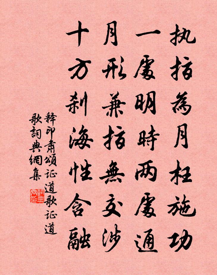 詩詞名句歷史字典書法欣賞書法字典國語詞典說文解字康熙字典古漢語字典標 題 作 者 詩 句 頌證道歌證道歌作者:釋印肅 朝代:宋代頌證道歌證道歌原文執指為月枉施功,一處明時兩處通。月形兼指無交涉,十方剎海性含融。詩詞問答問:頌證道歌證道歌的作者是誰?答:釋印肅問:頌證道歌證道歌寫於哪個朝代?答:宋代釋印肅頌證道歌證道歌書法欣賞頌證道歌證道歌書法作品詩詞推薦泊曹家沙董嗣杲〔宋代〕險危屢涉尚未慣,沙上盡認家為曹。江空不見雨點大,船隘莫禁人語高。送張南史戴叔倫〔唐代〕陋巷無車轍,煙蘿總是春。賈生獨未達,原憲竟忘貧。草座留山月,荷衣遠洛塵。最憐知己在,林下訪閒人。淵靚亭黃伯固〔宋代〕江山無古今,闡發自我輩。心期得地勝,有目皆一快。負郭西繚川,眾流翕以匯。水光開三面,結屋此其最。囂塵亂後入洪州西山曹松〔唐代〕寂寂陰溪水漱苔,塵中將得苦吟來。東峰道士如相問,縣令而今不姓梅。次韻勿齋蠟梅周端臣〔宋代〕不懷南枝斗粉光,品題應合讓蘇黃。融成蜂蠟千葩秀,散作龍涎幾陣香。立悟瞿曇真面目,坐忘姑射舊梳妝。好風奉和襲美太湖詩二十首毛公壇陸龜蒙〔唐代〕古有韓終道,授之劉先生。身如碧鳳凰,羽翼披輕輕。先生盛驅役,臣伏甲與丁。勢可倒五嶽,不唯鞭群靈。飄颻朱賣臣齋二首朱謙之〔宋代〕貧賤難堪俗眼低,區區何事更雲泥。會稽乞得無他念,祗為歸來毫故妻。滿江紅 登汪師展江樓張之翰〔元代〕山厭書長江,流書不盡、滔書溜深碧。書形勝地、以江為塹,以山為壁。兵府舊分城上下,人家新住城南北。說當丁丑歲旦於石〔宋代〕不寫桃符換舊詩,辛盤竹爆付兒嬉。山深未見新年曆,只記梅花春早遲。探梅過西湖鄭安恭〔宋代〕郊坰一到眼偏明,古寺寂無鐘磬聲。共上籃輿尋勝事,獨先冠蓋愧雙旌。探梅載酒成幽趣,縱步登山喜晚晴。自顧讀素問十六首方回〔宋代〕鬼臾區所陳,太始天元冊。後世言陰陽,胥於此焉出。九星首天蓬,遁甲雲古術。要是秦漢間,良醫所祖述。郡齋獨酌 黃州作。杜牧〔唐代〕前年鬢生雪,今年須帶霜。時節序鱗次,古今同雁行。甘英窮四海,四萬到洛陽。東南我所見,北可計幽荒。中畫野人送朱櫻杜甫〔唐代〕西蜀櫻桃也自紅,野人相贈滿筠籠。數回細寫愁仍破,萬顆勻圓訝許同。憶昨賜沾門下省,退朝擎出大明宮。金盤鷓鴣吟邵雍〔宋代〕事體一番新,才新又卻陳。新陳非利物,義理不由人。歲月體驚晚,鶯花續報春。余樽幸無恙,宜唱鷓鴣頻。試院煎茶蘇軾〔宋代〕蟹眼已過魚眼生,颼颼欲作松風鳴。蒙茸出磨細珠落,眩轉繞甌飛雪輕。銀瓶瀉湯夸第二,未識古人煎水意。(古補陀大士贊釋大觀〔宋代〕海天寥泬,海岸孤絕。見得親切,虛空釘橛。怒濤舂碎岩前月。嵩岳聞笙劉希夷〔唐代〕月出嵩山東,月明山益空。山人愛清景,散發臥秋風。風止夜何清,獨夜草蟲鳴。仙人不可見,乘月近吹笙。絳唇赤甲杜甫〔唐代〕卜居赤甲遷居新,兩見巫山楚水春。炙背可以獻天子,美芹由來知野人。荊州鄭薛寄書近,蜀客郗岑非我鄰。笑接雲根胡仲弓〔宋代〕出岫無心直等閒,卻於天運頗相關。五雲飛繞黃金闕,留得雲根在越山。和黃執禮六首胡寅〔宋代〕賜牆那及仲尼宮,妄意堅高立下風。志士有求雖汲汲,鄙夫無得漫空空。詩鳴寡學安能善,酒聖多愁詎敢中。惟賴名句推薦絳雪生涼,碧霞籠夜,小立中庭蕪地。吳文英《拜星月慢·林鐘羽姜石帚以盆蓮數十置中庭宴客其中》 愁看飛雪聞雞唱,獨向長空背雁行。羅鄴《早發》 老柘葉黃如嫩樹,寒櫻枝白是狂花。白居易《早冬》 吹到一片秋香,清輝了如雪。納蘭性德《琵琶仙·中秋》 一節見則百節知矣。劉向《說苑·尊賢》 敗葉填溪水已冰,夕陽猶照短長亭。納蘭性德《浣溪沙·敗葉填溪水已冰》 高議而不可及,不若卑論之有功也。劉向《說苑·談叢》 不見年年遼海上,文章何處哭秋風?李賀《南園十三首》 綠槐煙柳長亭路,恨匆忙分離去。惠洪《青玉案·綠槐煙柳長亭路》 以我獨沉久,愧君相見頻。司空曙《喜外弟盧綸見宿》