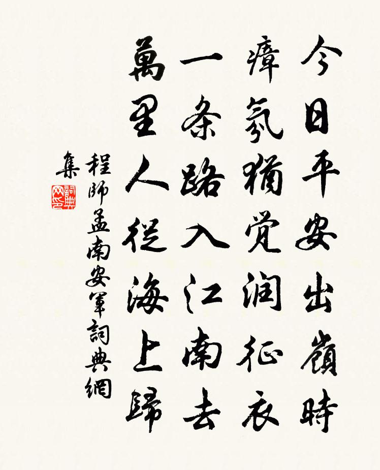 詩詞名句歷史字典書法欣賞書法字典國語詞典說文解字康熙字典古漢語字典標 題 作 者 詩 句 南安軍作者:程師孟 朝代:宋代南安軍原文今日平安出嶺時,瘴氛猶覺潤征衣。一條路入江南去,萬里人從海上歸。詩詞問答問:南安軍的作者是誰?答:程師孟問:南安軍寫於哪個朝代?答:宋代程師孟南安軍書法欣賞南安軍書法作品詩詞推薦新栽梅白居易〔唐代〕池邊新種七株梅,欲到花時點檢來。莫怕長洲桃李妒,今年好為使君開。同張文煥過吳式賢二十六韻方回〔宋代〕退居乏晤語,蒿萊醫荊扉。闉闍一以出,秋色饒清輝。東魯有名士,勛厭常旂。歡言撥簿領,宿約尋郊圻。小輿信留題東岩院強至〔宋代〕仁祠倚岩腹,無處入囂氛。古像棲深殿,高僧傲白雲。山花暖自發,溪溜遠猶聞。我正為名縛,翻羞猿鳥群。蝸廬陸游〔宋代〕小葺蝸廬便著家,槿籬莎徑任欹斜。為生草草僧行腳,到處悠悠客泛槎。孤蝶惜衣晴曝粉,樨蜂貪蜜晚爭花。有書和趙充道秘丞見贈邵雍〔宋代〕人言人事危冠冕,吾愛吾廬遠市朝。野面不堪趨魏闕,閒身唯稱訪楊寥。殊無紀律詩千首,富有雲山酒一瓢。預借送人之漢上周弼〔宋代〕木落千山怨別離,自知難駐馬行蹄。上書季子窮歸路,獻賦荀卿老向齊。驛店破旗秋雨細,戍樓殘角夕陽低。袖藏同三兄安公亭看雨韓維〔宋代〕高堂六月苦炎曦,雨逐輕雷過後池。水面涼生跳赤鯉,林端聲寂語黃鸝。翠深岸篠無風亂,紅重薔薇到地垂。清景讀史釋智圓〔宋代〕我愛包胥哭,一哭救楚國。事君盡其忠,垂名千世則。我愛魯連笑,一笑卻秦軍。折衝罇俎間,流芳至今聞。我愛句徐似道〔宋代〕那堪富有千頭橘,便可稱為四老人。點絳唇劉秉忠〔元代〕恰破黃昏,一灣新月稍稍共。玉溪流汞。時有香浮動。別後清風,馥郁添多種。如相送。未忘珍重。已入幽人夢。圩田胡仲參〔宋代〕圩田依澗水,入夏未栽禾。不是春耕晚,山中寒氣多。除夕感懷譚嗣同〔清代〕內顧何曾足肝膽,論交晚乃得髯翁。不觀器識才終隱,即較文詞勢已雄。逃酒人隨霜陣北,談兵心逐海潮東。飛光紫騮馬江總〔隋代〕春草正萋萋。 * 出空閨。識是東方騎。猶帶北風嘶。揚鞭向柳市。細蹀上金堤。願君憐織素。殘妝尚有啼。寄徐正字夤黃滔〔唐代〕八月月如冰,登樓見姑射。美人隔千里,相思無羽駕。紅蘭裛露衰,誰以流光訝。何當詩一句,同吟祝玄化。蕭五監丞新作堂成名曰知雄且賦彫章題之屋壁祖無擇〔宋代〕況堂佳號塵游外,題壁新吟藻思春。樸素自持師老氏,清醒常戒鑒靈均,窮通一致由知命,恬智相須合入神。因覽皇恐灘三首楊萬里〔宋代〕小煩溪友語陽侯,好遣漂沙蓋石頭。能費奔流多少力,前頭幸有一沙洲。滿庭芳(酬葉憲)洪适〔宋代〕殢酒銷愁,逢場作戲,何曾擇地伸眉。詩筒來往,如我與君稀。喜得青春有閏,添日月、款曲臨池。洲盤有,山餚題石門洞鄭汝諧〔宋代〕每移征棹並雲根,便覺幽懷謝世喧。皓色飛來天際雪,紅塵不到水邊門。破荒康樂名猶在,紀勝元章字不存。但有次韻吳樞密烏衣園舊韻方岳〔宋代〕舊家門巷綠岧嶢,尚憶狨韉馬意驕。金鑿落沮未雀浦,玉丁東上紫宸朝。燕隨往事秋蕭瑟,雁帶夕陽江泬寥。九日偈頌一百六十首釋宗杲〔宋代〕今朝五月五,天降沛然雨。艾人與鬥神,聚頭相耳語。雪竇禪師來,一口吞佛祖。名句推薦孤村落日殘霞,輕煙老樹寒鴉,一點飛鴻影下。白樸《天淨沙·秋》 若要人不知,除非己莫為。佚名《增廣賢文·上集》 有鳥鷙立,羽翼張。柳宗元《唐鐃歌鼓吹曲十二首·其四》 酒已都醒,如何消夜永!周邦彥《關河令·秋陰時晴漸向暝》 聖人之行不同也,或遠或近,或去或不去,歸潔其身而已矣。孟子《孟子·萬章章句上·第七節》 新妝宜面下朱樓,深鎖春光一院愁。劉禹錫《和樂天春詞 / 春詞》 凌余陣兮躐余行,左驂殪兮右刃傷。屈原《國殤》 啼號升斗抵千金,凍雀飢鴉共一音。范成大《雪中聞牆外鬻魚菜者求售之聲甚苦有感》 去日兒童皆長大,昔年親友半凋零。竇叔向《夏夜宿表兄話舊》 不管三七二十一馮夢龍《醒世恆言·卷一》
