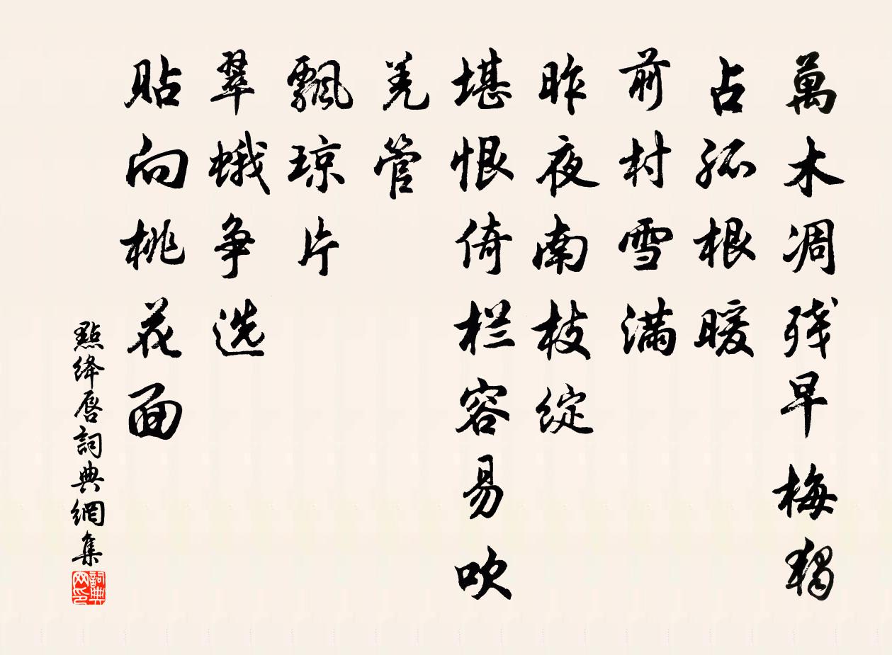 萬木凋殘,早梅獨占孤根暖。前村雪滿。