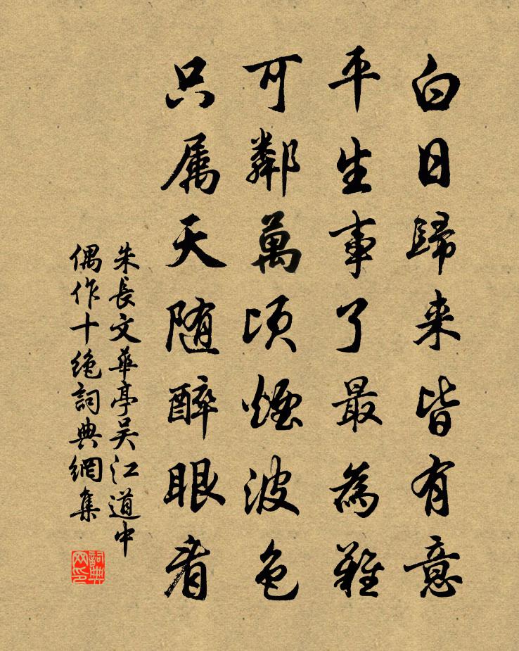 詩詞名句歷史字典書法欣賞書法字典國語詞典說文解字康熙字典古漢語字典標 題 作 者 詩 句 華亭吳江道中偶作十絕作者:朱長文 朝代:唐代華亭吳江道中偶作十絕原文白日歸來皆有意,平生事了最為難。可鄰萬頃煙波色,只屬天隨醉眼看。詩詞問答問:華亭吳江道中偶作十絕的作者是誰?答:朱長文問:華亭吳江道中偶作十絕寫於哪個朝代?答:唐代朱長文華亭吳江道中偶作十絕書法欣賞華亭吳江道中偶作十絕書法作品詩詞推薦雙魚謠(時韓職方書中以孟常州簡詩見示)賈島〔唐代〕天河墮雙魴,飛我庭中央。掌握尺余雪,劈開腸有璜。見令饞舌短,烹繞鄰舍香。一得古詩字,與玉含異藏。答劉長卿蛇浦橋月下重送嚴維〔唐代〕月色今宵最明,庭閒夜久天清。寂寞多年老宦,殷勤遠別深情。溪臨修竹煙色,風落高梧雨聲。耿耿相看不寐,遙雜劇·包待制智勘後庭花佚名〔元代〕第一折(沖末扮趙廉訪引祗從上,詩云)一片忠勤抱國憂,漸看白髮已蒙頭。可憐恩賜如花女,非我初心不敢留。朋黨論歐陽修〔宋代〕臣聞朋黨之說,自古有之,惟幸人君辨其君子小人而已。大凡君子與君子以同道為朋,小人與小人以同利為朋,此歌張衡〔兩漢〕天地煙熅。百卉含蘤。鳴鶴交頸。雎鳩相和。處子懷春。精魂回移。如何淑明。忘我實多。山齋詩庾信〔南北朝〕寂寥尋靜室。蒙密就山齋。滴瀝泉澆路。穹窿石臥階。淺槎全不動。盤根唯半埋。圓珠墜晚菊。細火落空槐。直置白鶴山新居鑿井四十尺遇盤石石盡乃得泉蘇軾〔宋代〕海國困蒸溽,新居利高寒。以彼陟降勞,易此寢處乾。但苦江路峻,常慚汲腰酸。矻矻煩四夫,磽磽斫層巒。彌旬對酒作陸游〔宋代〕憑閣風吹帽,穿林雨熱巾。相呼十日飲,不負百年身。陌上金羈馬,墳前石琢麟。於吾竟何有?笑殺武陵人。岐王宅羅隱〔唐代〕朱邸平台隔禁闈,貴游陳跡尚依稀。雲低雍畤祈年去,雨細長楊從獵歸。申白賓朋傳道義,應劉文彩寄音徽。承平送寧鄉令張沆梅堯臣〔宋代〕長沙過洞庭,水泊風搖矴。青山接夷蠻,白晝鳴鴞鸋。竹存帝女啼,夔學林雍鑋。不嫌卑濕往,教令民須聽。西江月向滈〔宋代〕別後千思萬想,眼前一日三秋。小街欄檻記追游。料得新妝依舊。自笑非常蒂殢,為他無限閒愁。莫將離恨寄鄜州泊舟富池乞靈祠下楊冠卿〔宋代〕大江東南來,馮夷此其宮。群山各獻狀,奔走如游龍。將軍萬人傑,智勇摧奸凶。草木知威名,旗常紀豐功。廟食答鄭生歌佚名〔唐代〕溯青山兮江之隅,拖湘波兮褭綠裾。荷拳拳兮情未舒,匪同歸兮將焉如。午窗劉克莊〔宋代〕恩賦支離粟一囊,午窗臥看世人忙。東家學究窮於我,六月褒衣上講堂。京師逢賣梅花五首梅堯臣〔宋代〕此去吾鄉二千里,不看素萼兩三年。移根種子誰辛苦,上苑偷來值幾錢。奉和江沖陶居二十韻汪炎昶〔宋代〕人世紛喧囂,空山自茅棟。煩君固扃鐍,保此曲肱夢。次韻和吳侍郎寄致政張郎中以令子倅府迎侍河宋庠〔宋代〕序齒顛毛貴,傳家子綬青。蘭芳應作膳,椿老別添齡。逸豫鴻排陸,歡心鯉過庭。幾時陪雅集,醉弁一俄星。題王氏小園唐從龍〔宋代〕山脈鍾雲氣,新晴散紫霞。玉藏雲里石,金落水中沙。瘦鶴依疏竹,飢蜂戀落花。臨池看洗硯,知是右軍家。頌石頭和尚草庵歌釋印肅〔宋代〕中下聞之必生怪,泥有著無生死快。改頭換面者還來,歷劫茫茫虛受罪。浮遠堂二首尤袤〔宋代〕我生家住浙江西,不見江山自是痴。浮遠堂前今日望,畫圖待我看潮時。名句推薦諸葛大名垂宇宙,宗臣遺像肅清高。杜甫《詠懷古蹟五首·其五》 朝聞遊子唱離歌,昨夜微霜初渡河。李頎《送魏萬之京》 甘井近竭,招木近伐。墨子《墨子·01章 親士》 借問此何時?春風語流鶯。李白《春日醉起言志》 千丈之堤,以螻蟻之穴潰;百步之室,以突隙之煙焚。韓非及後人《韓非子·喻老》 人逢喜事精神爽,月到中秋分外明。馮夢龍《醒世恆言·卷十八》 怒不過奪,喜不過予。荀子《荀子·修身》 恐鳳靴,挑菜歸來,萬一灞橋相見。史達祖《東風第一枝·詠春雪》 少年聽雨歌樓上。紅燭昏羅帳。蔣捷《虞美人·聽雨》 安得倚天劍,跨海斬長鯨。李白《臨江王節士歌》