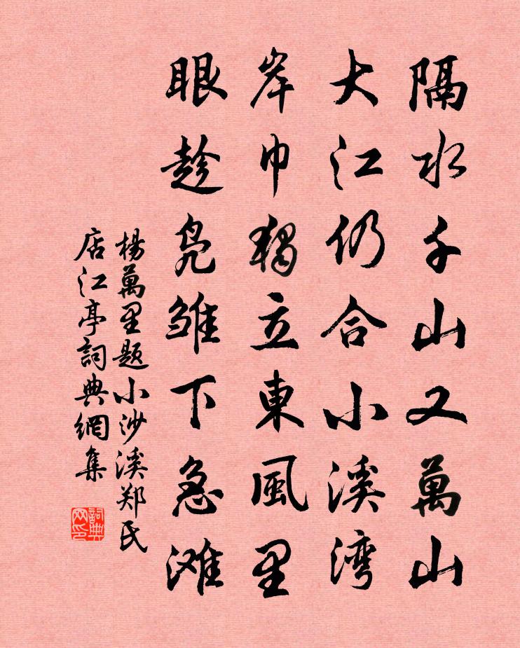 詩詞名句歷史字典書法欣賞書法字典國語詞典說文解字康熙字典古漢語字典標 題 作 者 詩 句 題小沙溪鄭氏店江亭作者:楊萬里 朝代:宋代題小沙溪鄭氏店江亭原文隔水千山又萬山,大江仍合小溪灣。岸巾獨立東風裡,眼趁鳧雛下急灘。詩詞問答問:題小沙溪鄭氏店江亭的作者是誰?答:楊萬里問:題小沙溪鄭氏店江亭寫於哪個朝代?答:宋代問:楊萬里的名句有哪些?答:楊萬里名句大全楊萬里題小沙溪鄭氏店江亭書法欣賞題小沙溪鄭氏店江亭書法作品詩詞推薦歸去來集字十首蘇軾〔宋代〕與世不相入,膝琴聊自歡。風光歸笑傲,雲物寄游觀。言話審無倦,心懷良獨安。東皋清有趣,植杖日盤桓。偈頌二百零五首釋正覺〔宋代〕靈機未動,道環先入。極理也妙得窮通,順事也聊分借借。無象無私,何固何必。娟娟印水之月魂,冉冉在華之春鷓鴣天 玉泉觀魚張可久〔元代〕瀲灩晴光動碧虛。一方清鏡照詩*。□□玉塵三三法,水漾金鱗六六魚。紅舍利,白芙蕖。盡教妝點老僧居。夜深醉落魄/一斛珠張掄〔宋代〕流光轉轂。烏飛兔走爭相逐。火雲方見奇峰簇。颯颯西風,驚墮井梧綠。隙駒莫嘆年華速。新涼且喜消炎酷。休將寄金陵傳神者李士雲王安石〔宋代〕衰容一見便疑真,李子揮毫故有神。欲去鍾山終不忍,謝渠分我死前身。梅叟許月卿〔宋代〕梅叟真侍客,冰壺賢主人。移樽隨月飲,顧典到更深。蠟炬精神耐,梅花氯象新。明朝山屋去,隱者詎能尋。至豫章茂直座上戲書鄭剛中〔宋代〕憶與故人分此袂,倒指數年今不啻。天涯何意得相逢,一笑向君聊破涕。靜垂雙耳聽韶頀,濯洗凡襟無鄭衛。頻將三月三十夜聞杜宇陸游〔宋代〕斗轉春歸不自由,韶華已逐水東流。子規獨抱區區意,血淚交零曉未休。蘄春聽琵琶五首孔武仲〔宋代〕新自潯陽江上來,雖聞此曲不悲哀。輕攏細撚俱清絕,指法何慚二善才。送劉仲鼎瀏陽教四首方回〔宋代〕□向湖南去,衡湘剩□□。淚凝斑竹恨,骨冷葬魚悲。學□循常式,師生整舊現。□軒何故道,無所為而為。句晃逈〔宋代〕色空辨相何妨道,語默由心不礙禪。還鄧覺民詩卷孫嵩〔宋代〕南山竹機笛,北山桐可琴。得如聽松風,中有太古音。西江月辛棄疾〔宋代〕剩欲讀書已懶,只因多病長閒。聽風聽雨小窗眠。過了春光太半。往事如尋去鳥,清愁難解連環。流鶯不肯入西園水調歌頭魏了翁〔宋代〕尚記春歸日,錦繡裹江城。誰推日馭西去,水認故鄉痕。魚鳥自飛自躍。紅紫誰開誰落。天運渺無聲。四序鎮如此玉照堂次韻茂洪古梅張鎡〔宋代〕天教萼綠伴羊權,羞對塵顏粉黛妍。不必修真事靈訣,與花端合共長年。秋台作修睦〔唐代〕獨上高樓上,客情何物同。孤雲無定處,長日信秋風。兄弟多年別,關河此夕中。到頭歸去是,免使嘆洪濛。詠史詩郴縣胡曾〔唐代〕義帝南遷路入郴,國亡身死亂山深。不知埋恨窮泉後,幾度西陵片月沉。絕句三首蘇軾〔宋代〕天風吹月入欄乾,烏鵲無聲夜向蘭。織女明星來枕上,乃知身不在人間。獨居有懷李商隱〔唐代〕麝重愁風逼,羅疏畏月侵。怨魂迷恐斷,嬌喘細疑沈。數急芙蓉帶,頻抽翡翠簪。柔情終不遠,遙妒已先深。浦冷用夾穀子括吳山晚眺韻十首方回〔宋代〕泰伯封疆四望寬,勝將吳越舊書觀。苧羅山下春才到,麋鹿台邊沼已寒。不有采香專怙寵,可能嘗膽便除殘。今年名句推薦三顧頻煩天下計,兩朝開濟老臣心。杜甫《蜀相》 牧人驅犢返,獵馬帶禽歸。王績《野望》 瀚海百重波,陰山千里雪。李世民《飲馬長城窟行》 衰蘭送客鹹陽道,天若有情天亦老。李賀《金銅仙人辭漢歌》 香爐瀑布遙相望,回崖沓嶂凌蒼蒼。李白《廬山謠寄盧侍御虛舟》 孤帆遠影碧空盡,唯見長江天際流。李白《黃鶴樓送孟浩然之廣陵》 行非恆者,天禁之。爽事,地禁之。佚名《黃帝四經·十大經·三禁》 帝里重清明,人心自愁思。孟浩然《清明即事》 雁聚河流濁,羊群磧草膻。齊己《送人游塞》 高齋今夜雨,獨臥武昌城。徐禎卿《在武昌作》
