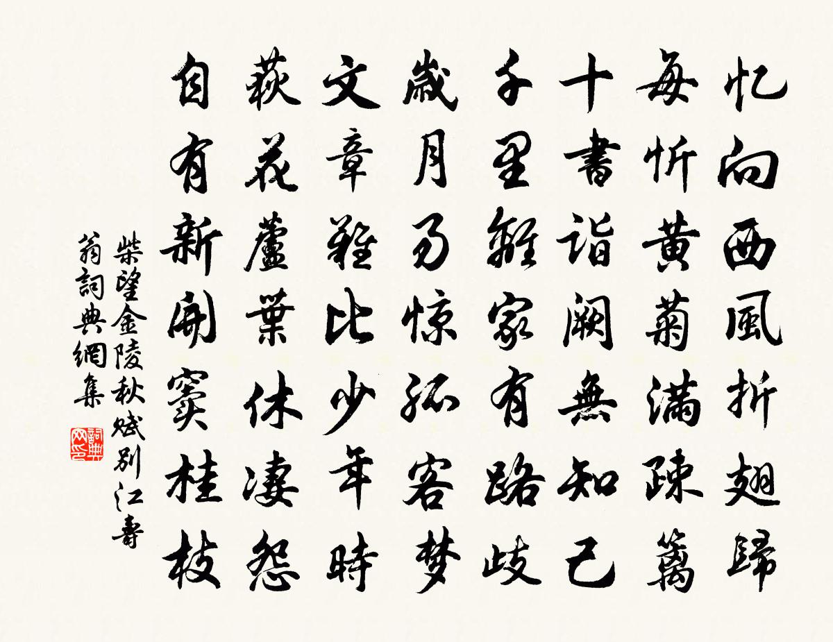 詩詞名句歷史字典書法欣賞書法字典國語詞典說文解字康熙字典古漢語字典標 題 作 者 詩 句 金陵秋賦別江壽翁作者:柴望 朝代:宋代金陵秋賦別江壽翁原文憶向西風折翅歸,每忻黃1/1菊滿疎籬。十書詣闕無知己,千里離家有路歧。歲月易驚孤客夢,文章難比少年時。荻花蘆葉休悽怨,自有新開竇桂枝。詩詞問答問:金陵秋賦別江壽翁的作者是誰?答:柴望問:金陵秋賦別江壽翁寫於哪個朝代?答:宋代柴望金陵秋賦別江壽翁書法欣賞金陵秋賦別江壽翁書法作品詩詞推薦宋永兄一訪青帝而黃婆作惡累日戲作小詩問安黃公度〔宋代〕陌上春光遽如許,花落花開任風雨。誰憐四印居士賢,苦遭造化小兒侮。苦來醫手罕折肱,老去流年劇飛羽。無復題戴勝賈島〔唐代〕星點花冠道士衣,紫陽宮女化身飛。能傳上界春訊息,若到蓬山莫放歸。洞仙歌張韞〔宋代〕花泥絮浪,殢春懷如酒。書卷爐熏夢清晝。喚玉京穩攜手鬆喬,飛光里,笑傲白雲林岫。仙人猶狡獪,灑雪吹冰,奉和晦日駕幸昆明池應制沈佺期〔唐代〕法駕乘春轉,神池象漢回。雙星移舊石,孤月隱殘灰。戰鷁逢時去,恩魚望幸來。山花緹綺繞,堤柳幔城開。思逸雜劇·玉清庵錯送鴛鴦被佚名〔元代〕楔子(沖末扮李府尹引從人上,詩云)白髮刁騷兩鬢侵,老來灰盡少年心。等閒分食天家祿,但得身安抵萬金。老群公集畢氏林亭陳子昂〔唐代〕金門有遺世,鼎實恣和邦。默語誰能識,琴樽寄北窗。子牟戀魏闕,漁父愛滄江。良時信同此,歲晚跡難雙。頌古一百二十一首釋宗杲〔宋代〕言無展事,語不投機。隨言者喪,滯句者學。逢人不得錯舉。寄錢郎中法照〔唐代〕閉門深樹里,閒足鳥來過。五馬不復貴,一僧誰奈何。藥苗家自有,香飯乞時多。寄語嬋娟客,將心向薜蘿。陳叔盥兩惠詩以一首謝陳藻〔宋代〕休要逢人誦六經,紅泉往事已凋零。向來未壞恭王壁,到處閒搖普化鈴。幾歲寒窗頭也白,兩篇新什眼空青。還鄉句劉宰〔宋代〕選詩非選官,論詩非論人。霽後登樓姚合〔唐代〕高樓初霽後,遠望思無窮。雨洗青山淨,春蒸大野融。碧池舒暖景,弱柳嚲和風。為有登臨興,獨吟落照中。鼓腹無所思朝起暮歸眠湫明詩也以詩定韻為十滕岑〔宋代〕少習舉了業,不能中科目。暮竟為尉丞,州縣甘碌碌。四任奉真祠,一家仰雨祿。勿雲腹負予,予亦負此腹。和二兄書事三首李廌〔宋代〕述逃內潰古雲多,楚塞群雄尚感歌。血饗彼猖神苟幸,廟謀非壯士誰何。將軍威信當詢眾,決勝神機豈謂他。試把三池丁祭宿齋所賦虞剛簡〔宋代〕洙泗微言日夜行,天高地下昨猶今。□□□□六經意,識得皇皇萬古心。宗廟百官誰不見,朱弦疏越有知音。同人題無為秀溪亭王之道〔宋代〕畫橋雕檻接招提,新有幽人榜秀溪。十頃淨明天上下,兩奩光映水東西。飛樓涌殿參差見,古木修篁咫尺迷。此景題貂黃嶺官軍韋莊〔唐代〕散騎蕭蕭下太行,遠從吳會去陳倉。斜風細雨江亭上,盡日憑欄憶楚鄉。寄詩友齊己〔唐代〕天地有萬物,盡應輸苦心。他人雖欲解,此道奈何深。返樸遺時態,關門度歲陰。相思去秋夕,共對冷燈吟。又次韻王珪〔唐代〕吟邊莫放酒杯乾,玉樹瓊樓不奈寒。授簡誰當梁苑賦,泛舟聊作剡溪看。但知盈尺占豐歲,豈為無氊笑冷官。想得減字木蘭花吳則禮〔宋代〕梅花未徹。付與團團沙塞月。端欲捐書。去乞君王丈二殳。貂裘錦帽。盤馬不甘青鬢老。底事偏奇。細草平沙看打新春詞鄭獬〔宋代〕晴暉散入鳳凰樓,一桁朱簾不下鉤。漢殿鬧簪雙彩燕,並和春色上釵頭。名句推薦忙忙如喪家之狗,急急如漏網之魚。馮夢龍《醒世恆言·卷十七》 無由持一碗,寄與愛茶人。白居易《山泉煎茶有懷》 吃一分虧,受無量福。馮夢龍《警世通言·卷三》 我自中宵成轉側,忍聽湘弦重理。納蘭性德《金縷曲·亡婦忌日有感》 共看明月應垂淚,一夜鄉心五處同。白居易《望月有感》 用下敬上,謂之貴貴;用上敬下,謂之尊賢。貴貴、尊賢,其義一也。孟子《孟子·萬章章句下·第三節》 前度綠陰載酒,枝頭色比舞裙同。王沂孫《慶清朝·榴花》 霰淅瀝而先集,雪粉糅而遂多。謝惠連《雪賦》 池花春映日,窗竹夜鳴秋。李白《謝公亭·蓋謝朓范雲之所游》 黃河遠上白雲間,一片孤城萬仞山。王之渙《涼州詞二首·其一》
