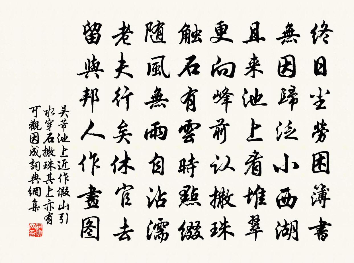 詩詞名句歷史字典書法欣賞書法字典國語詞典說文解字康熙字典古漢語字典標 題 作 者 詩 句 池上近作假山引水穿石撒珠其上亦有可觀因成作者:吳芾 朝代:宋代原文終日塵勞困簿書,無因歸泛小西湖。且來池上看堆翠,更向峰前認撒珠。觸石有雲時點綴,隨風無雨自沾濡。老夫行矣休官去,留與邦人作畫圖。詩詞問答問:《池上近作假山引水穿石撒珠其上亦有可觀因成》的作者是誰?答:吳芾問:該詩寫於哪個朝代?答:宋代書法欣賞池上近作假山引水穿石撒珠其上亦有可觀因成書法作品詩文賞析【原題】:池上近作假山引水穿石撒珠其上亦有可觀因成拙句詩詞推薦菊泉蒲壽宬〔宋代〕疏泉得古髓,種菊蒙秋潭。願與村中人,一瓢共清甘。題少述望海樓陳襄〔宋代〕百尺樓頭水際天,樓東直與海相連。江山氣古南朝後,風物神清北固前。沙鳥晴棲甘露月,布颿時度廣陵煙。何年句梁棟〔宋代〕浮雲暗不見青天。送鄭權尚書南海王建〔唐代〕七郡雙旌貴,人皆不憶回。戍頭龍腦鋪,關口象牙堆。敕設薰爐出,蠻辭咒節開。市喧山賊破,金賤海船來。白氎還家黃公度〔宋代〕黎明呼羸僮,拄策渡野水。輕嵐翳初日,古道步平砥。麥隴黃四出,松竹翠相倚。人間春告盡,岩色秀未已。眼入贈念經僧周朴〔唐代〕庵前古折碑,夜靜念經時。月皎海霞散,露濃山草垂。鬼聞拋故冢,禽聽離寒枝。想得天花墜,馨香拂白眉。茶厲文翁〔宋代〕海濱魚鹽勝耕稼,嘗呼父老采丁寧。江鄉魚茗尤逐末,為分利害別重輕。拔茶種桑何苦口,崇陽因得良吏名。虞美人(辰州上元)王庭珪〔宋代〕城東樓閣連雲起。冠絕辰州市。蓮燈初發萬枝紅。也似江南風景、半天中。花衢柳陌年時靜。劃地今年盛。棚前簫贈敏求舒岳祥〔宋代〕抄書滿架筆無塵,自是餐霞洞裡人。性癖貪吟如好色,話終更仆尚留賓。愛花更縮栽蔬地,開徑還通指竹鄰。不是生男吟邵雍〔宋代〕我本行年四十五,生男方始為人父。鞠育教誨誠在我,壽天賢愚系於汝。我若壽命七十歲,眼前見汝二十五。我欲秋日雜詠六首韓元吉〔宋代〕古郡青山合,乘高眼倍寬。風驚梧葉陣,雨暗菊花團。涼色宜欹枕,秋光怯憑欄。向來疏懶意,景物暫相歡。聞禽聲有感曾幾〔宋代〕寂寂禪房閉,陰陰夏木繁。坐聞幽鳥語,勝與俗人言。脫袴高低樹,提壺遠近村。汝曹知底事,獨與子規論。次韻八侄三首陳著〔宋代〕春色三分一未歸,雪肌風態露春微。東風且作枝頭主,莫把工夫繡地衣。後三日再賦陳與義〔宋代〕天生癭木不須栽,說與兒童是酒杯。落日留霞知我醉,長風吹月送詩來。一官擾擾身增病,萬事悠悠首獨回。不奈晚立陸游〔宋代〕倦憑小豎立柴門,殘角疏鍾欲斷魂。傷雁養翎依荻浦,渡牛浮鼻望煙村。壯心已覺隨年往,孤學何由與俗論?數點桂隱紀詠竹橋張鎡〔宋代〕新篁故蒙叢,惡草剛薈醫。刪薙似少恩,成渠玉無際。長門怨三首劉皂〔唐代〕雨滴長門秋夜長,愁心和雨到昭陽。 淚痕不學君恩斷,拭卻千行更萬行。 宮殿沈沈月欲分,昭陽更漏不堪聞。十詩謝寥計使陳造〔宋代〕二年仕窮山,書外睡作魔。吹律黍為茁,賴公有孰何。懸知登門初,大宅浮陽和。泛愛公自爾,小子何足多。同醉(呂子元、庾及之、杜歸和同隱客泛韋氏池)元稹〔唐代〕柏樹台中推事人,杏花壇上鍊形真。心源一種閒如水,同醉櫻桃林下春。五哀詩故太子中允知洛陽縣潁公王禹偁〔宋代〕洛陽富文彩,峭拔四子流。提筆入廣場,辭氣乾鬥牛。擢第在芸閣,言事觸冕旒。左降宰百里,道勝心無憂。才高名句推薦驚風飄白日,忽然歸西山曹植《贈徐幹詩》 宴爾新婚,以我御窮。佚名《谷風》 江帆幾片疾如箭,山泉千尺飛如電周德清《塞鴻秋·潯陽即景》 想當年,金戈鐵馬,氣吞萬里如虎。辛棄疾《永遇樂·京口北固亭懷古》 志,氣之帥也。孟子《孟子·公孫丑章句上·第二節》 在天願作比翼鳥,在地願為連理枝。白居易《長恨歌》 瘦葉幾經雪,淡花應少春。於武陵《贈賣松人》 野店垂楊步,荒祠苦竹叢。范成大《寒食郊行書事》 東風隨春歸,發我枝上花。李白《落日憶山中》 斷腸何必更殘陽,極目傷平楚。廖世美《燭影搖紅·題安陸浮雲樓》