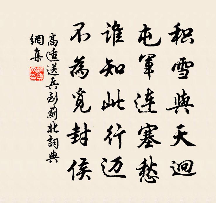 詩詞名句歷史字典書法欣賞書法字典國語詞典說文解字康熙字典古漢語字典標 題 作 者 詩 句 送兵到薊北作者:高適 朝代:唐代送兵到薊北原文積雪與天迥,屯軍連塞愁。誰知此行邁,不為覓封侯。詩詞問答問:送兵到薊北的作者是誰?答:高適問:送兵到薊北寫於哪個朝代?答:唐代問:送兵到薊北是什麼體裁?答:五絕問:高適的名句有哪些?答:高適名句大全高適送兵到薊北書法欣賞送兵到薊北書法作品注釋全唐詩:卷214_72詩詞推薦思子虡陸游〔宋代〕里堠迢迢阻問津,年光冉冉苦催人。未能免俗予嗟老,豈不懷歸汝念親。家釀湖蓴誰共醉?江雲淮月又經春。新詩和錢大參題松隱明秀堂韻曹勛〔宋代〕溪聲山色助清豪,小葺蘅茅望玉霄。蓮社粗能追惠遠,虎頭寧復愧班超。有池清淺方儲水,厥木扶疏豈待高。甚辱深居釋文珦〔宋代〕榮華不入夢,於焉謝憂責。深居三十年,禽猿盡相識。白日久知心,孤雲本無跡。丈室常寂然,焚香自終夕。橋廊上作張鎡〔宋代〕千載清風笠澤仙,提攜曾置筆床邊。吾行不汲長橋水,要煮青山陸羽泉。丁家洲陽枋〔宋代〕水雲留住覺無墳,札菊催歸知有奪。百丈黃錯牽月色,長洲灣處宿丁家。次韻范純仁和郭昌朝寺丞見寄二首宋庠〔宋代〕岷峨秀氣入京華,鵬翼摶風勢莫涯。崑玉照人呈美璞,楚蘭芬畹擢新芽。朝廷遷陟先諸彥,閭里光榮在一家。不鄙外孫文九伏中入村曬麥蘇轍〔宋代〕春田不雨憂無麥,入囷得半猶足食。伏中一曬不可緩,旱田蒼耳猶難得。人言春旱夏當潦,入伏未保天日好。老農禪人並化主寫真求贊釋正覺〔宋代〕影之神,物之春。鶯喉頰之滑滑,柳眉目之津津。蜂股華須粉,蠟脾蜜釀醇。等閒諦了遊戲事,端的還如幻化人。誠齋步月二首楊萬里〔宋代〕先生散發步庭中,孤月行天露滿空。已入廣寒宮裡去,如何別覓廣寒宮。賢者之孝二百四十首秦康公林同〔宋代〕懷哉送舅氏,曰至渭之陽。念母如存意,悠悠寄二章。熱戲樂張祜〔唐代〕熱戲爭心劇火燒,銅槌暗熱不相饒。上皇失喜寧王笑,百尺幢竿果動搖。隋宮李商隱〔唐代〕紫泉宮殿鎖煙霞,欲取蕪城作帝家。玉璽不緣歸日角[1],錦帆應是到天涯。於今腐草無瑩火,終古垂楊有暮鴉句高載〔宋代〕自是去凶明國是,毋輕函首啟戎奸。宮詞張公庠〔宋代〕南交司令已清和,滿殿薰風日未斜。院院迎涼簾盡卷,金盤初賜御園瓜。送沆赴台州學錄陳著〔宋代〕山連霞,水半沙,十步九步神仙家。草初芽,樹欲花,香風二百里春華。人謂此行良可樂,我送出門還作惡。初心采芑佚名〔先秦〕薄言采芑,於彼新田,呈此菑畝。方叔涖止,其車三千。師乾之試,方叔率止。乘其四騏,四騏翼翼。路車有奭,感遇十首次韻和黃著作魯直以將窮山海跡勝絕晁補之〔宋代〕楚有吹竹者,工作百獸音。削格為爾多,滔滔寧適今。嘗俾范馳驅,終日無一禽。復之儻或可,詭遇亦何心。攜客過王提舉園訪梅劉連州以詩來因用其韻陳傅良〔宋代〕屋後雲梢萬個長,屋前風蔓一川芳。有梅自索巡檐笑,無酒還酤踏雪香。偶與三劉同下榻,卻懷二宋對持觴。寫將賀新郎(福州游西湖)辛棄疾〔宋代〕翠浪吞平野。挽天河、誰來照影,臥龍山下。煙雨偏宜晴更好,約略西施未嫁。待細把、江山圖畫。千頃光中堆灩王方叔喪耦姜特立〔宋代〕人生大患身為素,火宅啼號更累身。聞道中郎唯有女,不妨半世作閒人。名句推薦慮澹物自輕,意愜理無違。謝靈運《石壁精舍還湖中作》 重鑄鋤犁作斤,姑舂婦擔去輪官,輸官不足歸賣屋。元稹《田家詞 / 田家行》 玉爐香,紅蠟淚,偏照畫堂秋思。溫庭筠《更漏子·玉爐香》 酌酒以自寬,舉杯斷絕歌路難。鮑照《擬行路難·其四》 萬事一身傷老矣,戎葵凝笑牆東。陳與義《臨江仙·高詠楚詞酬午日》 白日何短短,百年苦易滿。李白《短歌行》 娉娉裊裊十三餘,豆蔻梢頭二月初。杜牧《贈別二首》 劉郎已恨蓬山遠,更隔蓬山一萬重!李商隱《無題·來是空言去絕蹤》 怒髮衝冠,憑欄處、瀟瀟雨歇。岳飛《滿江紅·寫懷》 海水夢悠悠,君愁我亦愁。佚名《西洲曲》