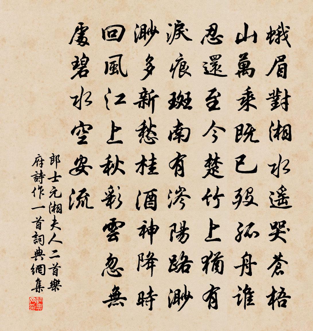 詩詞名句歷史字典書法欣賞書法字典國語詞典說文解字康熙字典古漢語字典標 題 作 者 詩 句 湘夫人二首(樂府詩作一首)作者:郎士元 朝代:唐代原文蛾眉對湘水,遙哭蒼梧山。萬乘既已歿,孤舟誰忍還。至今楚竹上,猶有淚痕斑。南有涔陽路,渺渺多新愁。桂酒神降時,迴風江上秋。彩雲忽無處,碧水空安流。詩詞問答問:《湘夫人二首(樂府詩作一首)》的作者是誰?答:郎士元問:該詩寫於哪個朝代?答:唐代書法欣賞湘夫人二首(樂府詩作一首)書法作品注釋全唐詩:卷248_40詩詞推薦漁父詞周紫芝〔宋代〕六首(叔共名竦)好個神仙張志和。平生只是一漁蓑。和月醉,棹船歌。樂在江湖可奈何。題庵壁陸游〔宋代〕身似蝸牛麤有廬,卻緣無用得安居。地爐封火欺寒雨,紙閣油窗見細書。蕎熟山僧分餺飥,船來溪友餉薪樗。閉門感興四章章五句汪晫〔宋代〕暑往寒來如電泡,年年門外閒花草,世事紛紛自顛倒。青山眼底最多情,日日向人渾不老。膠擾浮生事若麻,世路明堂樂章二首王安石〔宋代〕有奕明堂,萬方時會。宗予聖考,作帝之配。樂酌虞曲,禮從周制。厘事既成,於皇來塈。絕句六十四首張伯端〔宋代〕修行混俗且和光,圓即圓兮方即方。顯晦逆從人莫測,教人爭得見行藏。絕句釋惟茂〔宋代〕四面峰慈翠入雲,一溪流水漱山根。老僧只恐山移去,日午先教掩寺門。送李侍御賈至〔唐代〕我年四十餘,已嘆前路短。羈離洞庭上,安得不引滿。李侯忘情者,與我同疏懶。孤帆泣瀟湘,望遠心欲斷。贈江東李提學方回〔宋代〕小難和氣如三春,大難色瑩清無塵。小難作詩到對處,大難更自髯絕倫。天憐今年窮已極,稍慰蒹葭霜露身。惡風釀重陽酒蘇轍〔宋代〕家人花欲釀重陽花,香麴甘泉家自有。黃花抱蕊有佳思,金火未調無好手。老奴但欲致村酤,小婢爭言試三斗。我垂柳長吟邵雍〔宋代〕垂柳有兩種,有長有短垂。唯茲長一種,偏與靜相宜。院宇深春後,亭台晚景時。不勝煙羃羃,無柰日遲遲。霢霂木蘭花蘇庠〔宋代〕江雲疊疊遮鴛浦。江水無情流薄暮。歸帆初張葦邊風,客夢不禁篷背雨。渚花不解留人住。只作深愁無盡處。白沙送喬仝寄賀君六首蘇軾〔宋代〕曾謁東封玉輅塵,幅巾短褐亦逡巡。行宮夜奏空名姓,悵望雲霞縹緲人。一絕寄家鄭剛中〔宋代〕驚枕夢回常半夜,倚樓魂斷是斜陽。如何行李猶淹泊,未報蒲帆過武昌。水調歌頭(壽隱者·十一月初七)梁大年〔宋代〕南極壽星現,佳氣藹庭除。誰為絳人甲子,為我一軒渠。恰喜亥成二首,還慶陽來七日,和氣漸舒徐。敬為圖南祝小溪至新田四首楊萬里〔宋代〕懊惱春光欲斷腸,來時長緩去時忙。落紅滿路無人惜,蹈作花泥透腳香。秋波媚·七月十六日晚登高興亭望長安南山陸游〔宋代〕秋到邊城角聲哀,烽火照高台。悲歌擊築,憑高酹酒,此興悠哉。多情誰似南山月,特地暮雲開。灞橋煙柳,曲江卜運算元郭應祥〔宋代〕黃幾叔所惠綠燭,遂賦。綠燭間紅花,絕艷交相照。不分花時雨又風,折取供吟笑。擬把插烏巾,卻恨非年少。點木蘭花減字/減字木蘭花陳師道〔宋代〕勻紅點翠。取次梳妝誰得似。風柳腰肢。盡日纖柔屬阿誰。嬌嬌小小。卻是尋春人較老。著便休痴。付與風流幕下春秋戰國門。田饒周曇〔唐代〕廚拋敗肉士懷飢,倉爛餘糧客未炊。臨難欲行求死士,將何恩信致扶危。御製太皇太后輓詞四首范祖禹〔宋代〕八荒同軌壽原成,雨露俄悲歲律更。曉日瞳曨開鳳翣,春風縹緲轉龍旌。晨朝尚想趨金殿,飆馭難留返玉京。寶冊名句推薦遙憐小兒女,未解憶長安。杜甫《月夜》 離宮絕曠,身體摧藏,志念沒沉,不得頡頏。王昭君《怨詞》 莫見長安行樂處,空令歲月易蹉跎。李頎《送魏萬之京》 三教於是乎可一矣。王通《中說·卷五·問易篇》 道人善,即是善。人知之,愈思勉。李毓秀《弟子規·泛愛眾》 燕燕輕盈,鶯鶯嬌軟,分明又向華胥見。姜夔《踏莎行·自沔東來丁未元日至金陵江上感夢而作》 太平之世多長壽人。王充《論衡·卷一·氣壽篇》 春愁難遣強看山,往事驚心淚欲潸。丘逢甲《春愁》 機關算盡太聰明,反算了卿卿性命。曹雪芹《紅樓夢·第五回》 匹馬南來渡浙河,汴城宮闕遠嵯峨。于謙《岳忠武王祠》