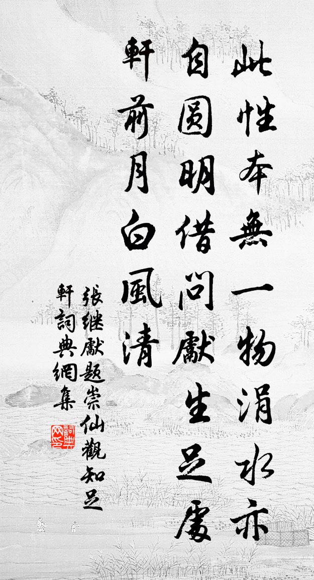 詩詞名句歷史字典書法欣賞書法字典國語詞典說文解字康熙字典古漢語字典標 題 作 者 詩 句 題崇仙觀知足軒作者:張繼先 朝代:宋代題崇仙觀知足軒原文此性本無一物,涓水亦自圓明。借問先生足處,軒前月白風清。詩詞問答問:題崇仙觀知足軒的作者是誰?答:張繼先問:題崇仙觀知足軒寫於哪個朝代?答:宋代張繼先題崇仙觀知足軒書法欣賞題崇仙觀知足軒書法作品詩詞推薦晚出江城聞角賀鑄〔宋代〕古壕沮洳荷葉枯,矍鑠禿鶖行且漁。山銜日腳水關掩,孤樓引角吹單于。胡馬嘶風興非淺,壯圖舊跡隨塵卷。秋盡七夕見與諸孫題乞巧文權德輿〔唐代〕外孫爭乞巧,內子共題文。隱映花奩對,參差綺席分。鵲橋臨片月,河鼓掩輕雲。羨此嬰兒輩,吹呼徹曙聞。小酌敬岩梅下和立齋韻王柏〔宋代〕平生手種梅,不作和羹念。其所起予者,歲寒心一片。孤芳以氣傳,萬物自形禪。暗香疎影句,知心亦已淺。雖以句元絳〔宋代〕可惜閩州風物好,一生魂夢到三山。午景書懷陳著〔宋代〕虛齋檐馬自丁東,卻在鶯啼燕語中。整屐欲尋花信息,不知柳絮已隨風。仙人石徐圓老〔宋代〕花開炫紅霞,景接長春壑。終古斯石存,蒼苔涴雙腳。安得洞仙來,重遊跨白鶴。郡齋讀經羊士諤〔唐代〕壯齡非濟物,柔翰誤為儒。及此齋心暇,翛然與道俱。散材誠獨善,正覺豈無徒。半偈蓮生水,幽香桂滿爐。息陰書懷奉簡蘭若提舉黃庚〔宋代〕十年湖海嘆飄零,晚景投閒百念輕。看水看山真有味,學書學劍恨無成。竹風吟曉詩情動,梧雨敲秋客夢驚。老傍紹興二十八年祀圜丘學士院〔宋代〕至大惟天,云何稱德。展誠致諜,牲用博碩。誠以牲寓,帝由誠格。居歆降祥,時萬是億。雪阻李家渡董嗣杲〔宋代〕跡寄郵程冒冷雲,病身染透客衣塵。欹傾茅店清眠雪,想像梅村遠醉春。樵子獨還衣卸濕,篙人相告酒賒頻。荒雞鷓鴣天曹組〔宋代〕淺笑輕顰不在多。遠山微黛接橫波。情吞醽醁千鍾酒,心醉飛瓊一曲歌。人慾散,奈愁何。更看朱袖拂雲和。夜深同王見可、劉子年循南溪,度西橋,登天柱岡楊萬里〔宋代〕親交久別忽相從,飯罷相將拄瘦筇。深澗小橋聊駐步,胡床羽扇對西風。水聲流入肝脾里,日影輕遮雲氣中。玉潤偶書邵雍〔宋代〕賢德之人,所居之處。如芝如蘭,使人愛慕。兇惡之人,所居之處。如虎如狼,使人怕怖。喜晴范成大〔宋代〕驅帚水爭溝口,捲簾日款屋山。飢燕痴兒叫怒,拙鳩去婦復還。次韻詹丞賀得祠高斯得〔宋代〕我生天地間,自笑一疣物。燕蝠爭晨螟,龍蠖安伸屈。三度侶黃冠,十載謝丹紱。無學陪旃廈,無才演綸綍。晨策賀新郎辛棄疾〔宋代〕鳳尾龍香撥。自開元、霓裳曲罷,幾番風月。最苦潯陽江頭客,畫舸亭亭待發。記出塞、黃雲堆雪。馬上離愁三萬次韻曾宣乾項安世〔宋代〕無缽無簞曉自齋,一銎一衲晚逾乖。戰場實事膏兼血,廣坐虛談冢共骸。虜事方然人尚爾,世途何者我猶諧。道林虞美人劉辰翁〔宋代〕猶疑綠萼花微甚。難與青蓮並。青蓮朵朵是天人。又向天人想見、洛陽春。多情素質塵生步。況被潘妃污。此花仍烏賊魚梅堯臣〔宋代〕海若有醜魚,烏圖有烏賊。腹膏為飯囊,鬲冒貯飲墨。出沒上下波,厭飫吳越食。爛腸來雕蚶,隨貢入中國。中國次高季應韻林季仲〔宋代〕杖屨相從秋水濱,便將公作社中人。酒行苦要深浮白,醉去那知倒著巾。把手共憐江國月,回頭休憶野堂春。太平名句推薦暖風熏得遊人醉,直把杭州作汴州。林升《題臨安邸》 除腹心之疾,而置諸股肱,何益?左丘明《左傳·哀公·哀公六年》 庭院深深深幾許,楊柳堆煙,簾幕無重數。歐陽修《蝶戀花·庭院深深深幾許》 嗚呼!楚雖三戶能亡秦,豈有堂堂中國空無人陸游《金錯刀行》 何處相逢,登寶釵樓,訪銅雀台。劉克莊《沁園春·夢孚若》 曾把芳心深相許。故夢勞詩苦。史達祖《留春令·詠梅花》 言以足志,文以足言。左丘明《左傳·襄公·襄公二十五年》 何處它年寄此生,山中江上總關情。虞集《院中獨坐》 七夕今宵看碧霄,牽牛織女渡河橋。林傑《乞巧》 蕪然蕙草暮,颯爾涼風吹。李白《秋思》