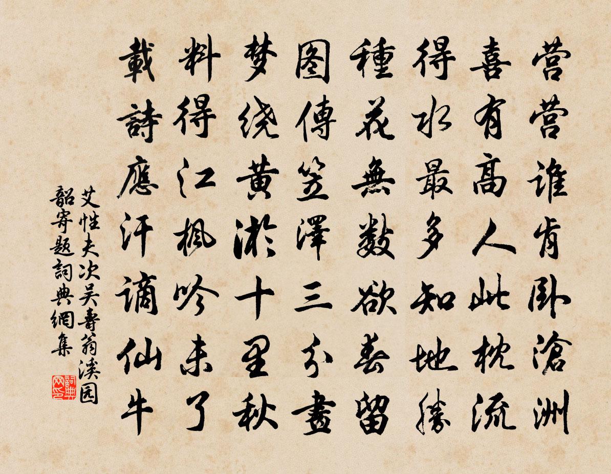 詩詞名句歷史字典書法欣賞書法字典國語詞典說文解字康熙字典古漢語字典標 題 作 者 詩 句 次吳壽翁溪園韶寄題作者:艾性夫 朝代:宋代次吳壽翁溪園韶寄題原文營營誰肯臥滄洲,喜有高人此枕流。得水最多知地勝,種花無數欲春留。圖傳笠澤三分畫,夢繞黃淤十里秋。料得江楓吟未了,載詩應汗謫仙牛。詩詞問答問:次吳壽翁溪園韶寄題的作者是誰?答:艾性夫問:次吳壽翁溪園韶寄題寫於哪個朝代?答:宋代問:次吳壽翁溪園韶寄題是什麼體裁?答:七律艾性夫次吳壽翁溪園韶寄題書法欣賞次吳壽翁溪園韶寄題書法作品詩詞推薦合州津口別舍弟至東陽峽步趁不及眷然有憶作以示之陳子昂〔唐代〕江潭共為客,洲浦獨迷津。思積芳庭樹,心斷白眉人。同衾成楚越,別島類胡秦。林岸隨天轉,雲峰逐望新。遙遙秋夜書廨中壁蔡襄〔宋代〕遙夜不能寢,值茲節物清。大空瑩虛碧,仰觀澄性情。素月若可把,浮云何故生。瑤琴且勿弄,誰鄰希代聲。郡務稍簡因得整比舊詩並連綴焚削封章繁委篋笥…樂天元稹〔唐代〕近來章奏小年詩,一種成空盡可悲。書得眼昏朱似碧,用來心破發如絲。催身易老緣多事,報主深恩在幾時。天遣出郊劭農口占李曾伯〔宋代〕小約賓僚集,相招老父耕。寺依青帶住,人在翠帷行。疊嶂堆春色,微雲護午晴。時康田裡樂,歸騎踏花輕。鸚鵡子蘭〔唐代〕翠毛丹觜乍教時,終日無寥似憶歸。近來偷解人言語,亂向金籠說是非。解語花周密〔宋代〕晴絲罥蝶,暖蜜酣蜂,重檐卷春寂寂。雨萼煙梢,壓闌乾、花雨染衣紅濕。金鞍誤約,空極目、天涯草色。閬苑玉【仙呂】醉扶歸_瘦後因他瘦呂止庵〔元代〕瘦後因他瘦,愁後為他愁。早知伊家不應口,誰肯先成就。營勾了人也罷手,吃得我些酩子裡罵低低的咒。頻去教附:張郁洛川沿步吟洛川仙女〔唐代〕浮生如夢能幾何,浮生復更憂患多。無人與我長生術,洛川春日且長歌。屋後植竹袁說友〔宋代〕穩袖三年手,新鋤十丈園。傍山移早筀,掃徑斸孤根。瑣碎梢頭影,淒涼竹外村。可人風月地,頭角見龍孫。廉州何使君輓詩二首張栻〔宋代〕憶昔湟江上,相逢意便傾。胸中元浩蕩,筆下更縱橫。士伏徐公德,人言景倩清。定應鄉里敬,枌社祭先生。水調歌頭(趙運判師屷生日)魏了翁〔宋代〕萬里蜀山險,難似上青天。誰知間有,人心之險甚山川。賴得皇華星使,滿載春風和氣,來自鑑湖邊。要識方寸地買陂塘(與沈潤宇、鄧元實同賦)劉塤〔宋代〕暮雲沈、淒淒花陌,荒苔青潤鴛甃。嬌紅一捻不勝春,苦雨酸雨僝僽。從別後。但暗憶娉婷,幾把垂楊蹂。香銷韓次韻感春五首黃庭堅〔宋代〕祁寒不可怨,天道自平分。及爾春風來,四肢有餘溫。丈夫力如虎,為人行灌園。椒蘭工壅蔽,未可怨芳蓀。寒魚游洞霄宮一首王阮〔宋代〕洞天若限仙凡路,九鎖前山不易尋。尚有康廬山下客,玉皇溫詔與登臨。敬和九鎖步虛詞飛鸞鎖趙汝湜〔宋代〕漸入雲霄徑,清氣逼人寒。欲學長生訣,先過此重壇。無屋堪竚足,有地可藏丹。遙瞻深鎖處,時見繞飛鸞。兩頭纖纖王建〔唐代〕兩頭纖纖青玉玦,半白半黑頭上發。逼逼僕僕春冰裂,磊磊落落桃花結。與僧道升二首王安石〔宋代〕跋陀羅師能幻物,幻穢為淨持幻佛。佛幻諸天以戲之,幢幢香果助設施。茫然悔欲除所幻,還為幻佛力所持。佛天會稽頌馬太守廟諸葛興〔宋代〕書畀姒兮力溝洫,民奠居兮勤稼穡。降嬴劉兮言水利,嘉鄴渠兮夸鄭國。慨元光兮瓠子決,彼鄃封兮河之北。悼一春日田園雜興王進之〔宋代〕桑田滄海歲興亡,几几東風自扇揚。細麥新秧隨意長,閒花幽草為誰芳。午橋蕭散名千古,金谷繁華夢一場。滿眼挽李提刑久善史堯弼〔宋代〕絕知嗣法一枝香,作意開堂嗣雪堂。早悟錐沙傳筆畫,旋收珠玉入詩囊。卷 * 閟龍蛇字,炳蔚家餘虎豹章。衣缽名句推薦冰泮寒塘水綠,雨余百草皆生。韋應物《三台》 去好去惡,臣乃見素;去舊去智,臣乃自備。韓非及後人《韓非子·主道》 別來春半,觸目柔腸斷。李煜《清平樂·別來春半》 喃喃教言語,一一刷毛衣。白居易《燕詩示劉叟》 山遠天高煙水寒,相思楓葉丹。李煜《長相思·一重山》 不知近水花先發,疑是經冬雪未銷。張謂《早梅》 舉觴酹先酒,為我驅憂煩。柳宗元《飲酒》 如今卻憶江南樂,當時年少春衫薄。韋莊《菩薩蠻·如今卻憶江南樂》 相逢意氣為君飲,系馬高樓垂柳邊。王維《少年行四首》 芙蓉老秋霜,團扇羞網塵。李白《中山孺子妾歌》
