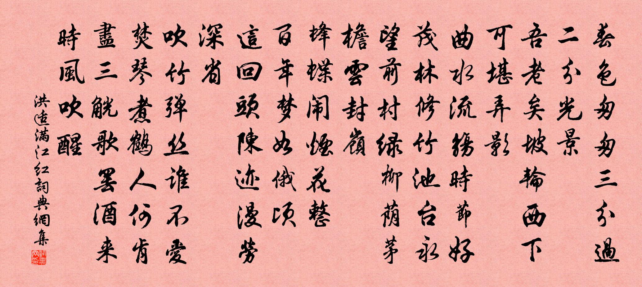 詩詞名句歷史字典書法欣賞書法字典國語詞典說文解字康熙字典古漢語字典標 題 作 者 詩 句 滿江紅作者:洪适 朝代:宋代滿江紅原文春色匆匆,三分過、二分光景。吾老矣,坡輪西下,可堪弄影。曲水流觴時節好,茂林修竹池台永。望前村、綠柳蔭茅檐,雲封嶺。蜂蝶鬧,煙花整。百年夢,如俄頃。這回頭陳跡,漫勞深省。吹竹彈絲誰不愛,焚琴煮鶴人何肯。盡三觥、歌罷酒來時,風吹醒。詩詞問答問:滿江紅的作者是誰?答:洪适問:滿江紅寫於哪個朝代?答:宋代問:滿江紅是什麼體裁?答:詞洪适滿江紅書法欣賞滿江紅書法作品詩詞推薦謝人惠紙齊己〔唐代〕烘焙幾工成曉雪,輕明百幅疊春冰。何消才子題詩外,分與能書貝葉僧。疾邪詩趙壹〔兩漢〕河清不可恃,人命不可延。順風激靡草,富貴者稱賢。文籍雖滿腹,不如一囊錢。伊優北堂上,骯髒倚門邊。秀實長子玉麟期晬葉茵〔宋代〕門左篷弧喜事新,四朝先佛慶生辰。嶢嶢已露峙頭玉,表表因名系角麟。鼻祖同庚光後葉,卯君著瑞定前身。我來和酬何泳推官見贈魏野〔宋代〕杜牧科名李賀曹,初官花幙莫辭勞。年顏不似詩情老,公器還如酒戶高。我稱臥遊藍碧嶂,君宜立近赭黃袍。雅章水龍吟(春晚留別故人)張炎〔宋代〕亂紅飛已無多,艷游終是如今少。一番雨過,一番春減,催人漸老。倚檻調鶯,捲簾收燕,故園空杳。奈關愁不住謁文公上方杜甫〔唐代〕野寺隱喬木,山僧高下居。石門日色異,絳氣橫扶疏。窈窕入風磴,長蘆紛卷舒。庭前猛虎臥,遂得文公廬。俯視贈太素脈王道人為端夫病起解嘲舒邦佐〔宋代〕按指如醫細切膚,對人便肯說榮枯。我今跳出榮枯外,試問先生脈得無。淮西有答張詠〔宋代〕天教明道知經綸,只在尊君兼庇民。鶴板未徵身且賤,輕車素佩紅塵。飄飄颻颻齊與魯,半醉半醒陳復楚,夜倚四頌古釋道顏〔宋代〕人貧多智短,馬瘦見毛長。獨宿雙峰寺,同焚一炷香。寓泊鄭圃寄獻昌言舍人司馬光〔宋代〕旅食繅衣館,飄蓬怳自迷。樹橫寒霧遠,山隱古原低。愁暮空庭雀,驚晨別野雞。故人何處在,依約玉繩西。挽歐陽夫人許氏二首黃公度〔宋代〕斷機貽子訓,截髮具賓盤。異數行開邑,他鄉忽蓋棺。薤歌春日晚,萱樹北堂寒。蕭瑟青門道,萊衣淚不乾。頌古五首釋彥岑〔宋代〕一橈打著這瞎漢,堪笑令猶行一半。竿頭比重線約鯨波,趯浪拿雲猶是鈍。寄令狐揆二首宋祁〔宋代〕紫漢參橫宿霧收,煙江南渡悵夷猶。夢中未省能知路,天上何緣許寄愁。豈有文鱗憑遠客,枉緣香杜怨芳洲。遙知夜宿青原寺感懷文天祥〔宋代〕松風一榻雨蕭蕭,萬里封疆夜寂寥。獨坐瑤琴悲世慮,君恩猶恐壯懷消。病中次務觀通判韻周必大〔宋代〕老眼亂蟬翼,樂事嘆何有。經年不銜杯,更暇問濡首。愛山空在山,擿埴詎容走。塵埃登高帽,生澀彈棋手。三年酌酒與裴迪王維〔唐代〕酌酒與君君自寬,人情翻覆似波瀾。白首相知猶按劍,朱門先達笑彈冠。草色全經細雨濕,花枝欲動春風寒。世事偈頌六十八首釋法薰〔宋代〕有路可行,更高也上。須彌燈王。退身合掌。山居即事余觀復〔宋代〕密竹環茆舍,應無俗士過。睡濃嫌日出,坐久厭塵多。斗雀翻危葉,飢鵝唼短莎。世塗真九曲,奔走欲如何。贈城郭道士孟郊〔唐代〕望里失卻山,聽中遺卻泉。松枝休策雲,藥囊翻貯錢。曾依青桂鄰,學得白雪弦。別來意未回,世上為隱仙。用戴帥初韻寄孫常州陳著〔宋代〕溪繞山園楊柳遮,戰蝸國里退閒家。兒孫滿眼堂萬卷,賓客多賢館五花。立腳東皋看倦鳥,回頭溫水笑跳蟆。相知名句推薦卻下水晶簾,玲瓏望秋月。李白《玉階怨》 況復煩促倦,激烈思時康。杜甫《夏夜嘆》 庸愚足以覆事;精明亦足以覆事。王永彬《圍爐夜話·第五九則》 溪谷少人民,雪落何霏霏!曹操《苦寒行》 忘身辭鳳闕,報國取龍庭。王維《送趙都督赴代州得青字》 玉樹歌殘王氣終,景陽兵合戍樓空。許渾《金陵懷古》 揚子江頭楊柳春,楊花愁殺渡江人。鄭谷《淮上與友人別》 驅馬天雨雪,軍行入高山。杜甫《前出塞九首》 吾日三省吾身:為人謀而不忠乎?與朋友交而不信乎?傳不習乎?孔子弟子《論語·學而篇》 君子立身,雖雲百行,唯誠與孝最為其首。魏徵《隋書·帝紀·卷二》
