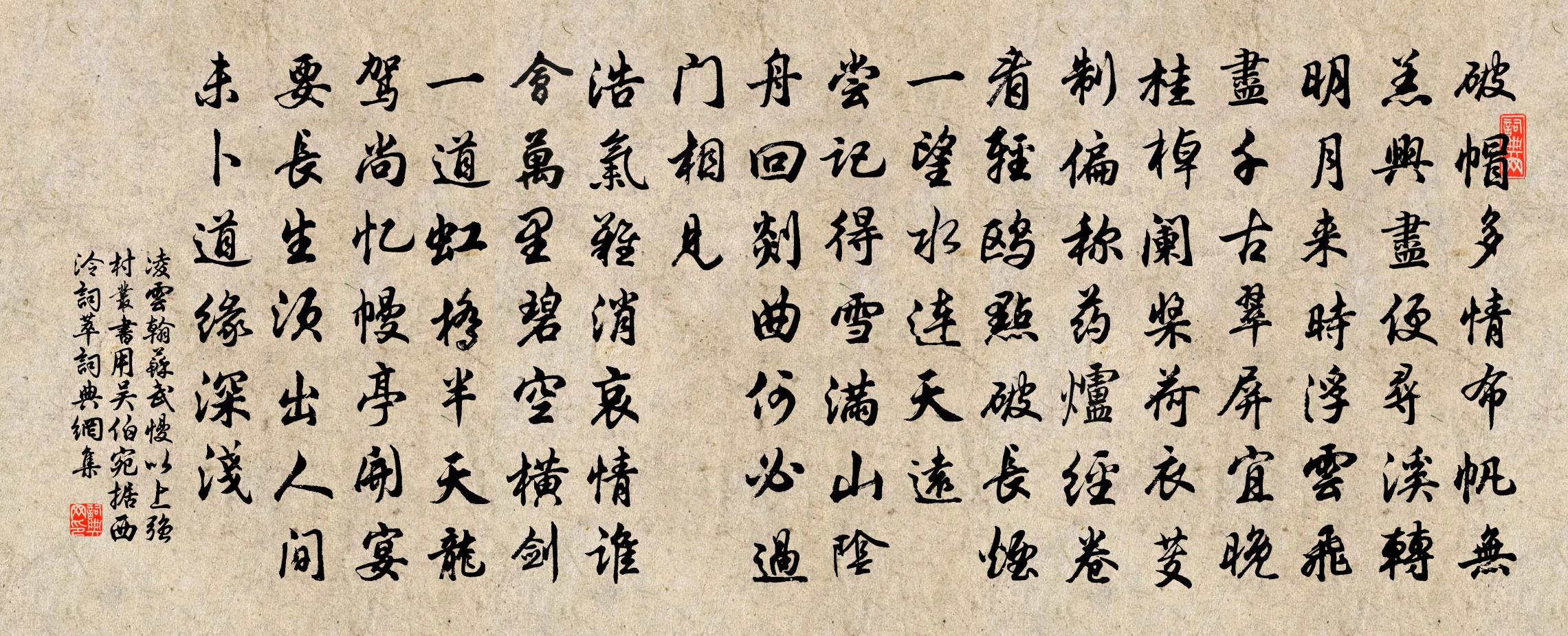 詩詞名句歷史字典書法欣賞書法字典國語詞典說文解字康熙字典古漢語字典標 題 作 者 詩 句 蘇武慢 以上強村叢書,用吳伯宛據西泠詞萃作者:凌雲翰 朝代:元代原文破帽多情,布帆無羔,興盡便尋溪轉。明月來時,浮雲飛盡,千古翠屏宜晚。桂棹闌槳,荷衣芰制,偏稱藥爐經卷。看輕鷗、點破長煙,一望水連天遠。嘗記得、雪滿山陰,舟回剡曲,何必過門相見。浩氣難消,哀情誰會,萬里碧空橫劍。一道虹橋,半天龍駕,尚憶幔亭開宴。要長生、須出人間,未卜道緣深淺。詩詞問答問:《蘇武慢 以上強村叢書,用吳伯宛據西泠詞萃》的作者是誰?答:凌雲翰問:該詩寫於哪個朝代?答:元代問:該詩是什麼體裁?答:詞書法欣賞蘇武慢 以上強村叢書,用吳伯宛據西泠詞萃書法作品詩詞推薦初歸范伯達弟相會夜歸有成胡寅〔宋代〕亂後風塵稍破昏,歸來骨肉喜全存。飲君竹葉醉不惜,映我梅花香正繁。問學據今宜了了,唱酬從此定源源。夜寒前緩聲歌謝惠連〔南北朝〕羲和纖阿去嵯峨。覩物知命。使余轉欲悲歌。憂戚人心胸。處山勿居峯。在行勿為公。居峯大阻銳。為公遇讒蔽。清平樂 用前韻,答郭斡卿二首劉敏中〔元代〕松窗竹戶。山氣空濛處。煙柳迷人花滿路。此是中庵舊住。沙鷗久望歸家。歸心已接飛霞。他日乘軒過我,待君繡遂州南江別鄉曲故人陳子昂〔唐代〕楚江復為客。征棹方悠悠。故人憫追送。置酒此南洲。平生亦何恨。夙昔在林丘。違此鄉山別。長謠去國愁。中秋夜八絕蘇轍〔宋代〕明入庭陰白,寒侵酒氣微。夜深看更好,樓上漸人稀。皇雅十首《耆武》三章尹洙〔宋代〕帝戒二俘,同即爾誅。予惟民無辜,休息是圖。謁烏龍廟陳允平〔宋代〕斷碑猶紀唐時事,山氣陰沉暗綠苔。松木已逾千歲壽,香菸知化幾爐灰。廊深無月鬼神過,殿古有雲風雨來。曲曲鬼門關諺佚名〔唐代〕鬼門關,十人去,九不還。六言雜興陸游〔宋代〕語道無如孔孟,佛莊雖似非同。倘有一人領會,何須客滿坐中。初發桂林,有出嶺之喜,但病餘便覺登頓,至范成大〔宋代〕桂林獨宜人,無瘴古所傳。北客守炎官,恃此以泰然。堂高愜宴坐,訟簡容佳眠。不計身落南,璇柄三回天。今朝送司馬入京杜甫〔唐代〕群盜至今日,先朝忝從臣。嘆君能戀主,久客羨歸秦。黃閣長司諫,丹墀有故人。向來論社稷,為話涕沾巾。草衣文殊贊釋心月〔宋代〕草離離,發垂垂。神出鬼沒,佛眼難窺。能坐毗耶之舌,而不能出女子之定。能行法王之令,而不能免迦葉之疑。次韻吳江陳學長送行二首陳造〔宋代〕詩人六十合恩袍,平日周庠重譽髦。舊學堪重漢儒席,新文欲仆楚人騷。等觀得喪心無累,飽閱豪英眼更高。聞道巫山神女廟劉禹錫〔唐代〕巫山十二郁蒼蒼,片石亭亭號女郎。曉霧乍開疑卷幔,山花欲謝似殘妝。星河好夜聞清佩,雲雨歸時帶異香。何事賢者之孝二百四十首趙琰林同〔宋代〕禮稱親未葬,喪服不除焉。食麥斷鹽味,悲哉四十年。偈二十二首釋洵〔宋代〕若欲正提綱,直教大地荒。擬來沖雪刃,不免露鋒鋩。驀山溪(同前)楊無咎〔宋代〕玉英檀蕊,細意憑君看。青帝忒多情,費幾許、春風暗剪。曉來敧枕,不覺嫩香飄,披宿霧,啟幽窗,不道開初遍途中西望雍陶〔唐代〕行行何處散離愁,長路無因暫上樓。唯到高原即西望,馬知人意亦回頭。織圖二十四首窖繭樓璹〔宋代〕盤中水晶鹹,井上梧桐葉。陶器固封泥,窖繭過旬浹。門前春水生,布穀催畚鍤。明朝蹋繅車,車輪纏白氎。追悼親哥王炎〔宋代〕昔在清華日,明珠掌上新。豈期吾薄福,不見汝成人。荒冢魂長夜,空山草自春。姜涼無限恨,獨坐一沾巾。名句推薦知恩不報,非為人也。施耐庵《水滸傳·第二十回》 十分不耐煩,乃為人大病;一味學吃虧,是處事良方。王永彬《圍爐夜話·第五四則》 五原秋草綠,胡馬一何驕。李白《塞上曲》 山隨平野盡,江入大荒流。李白《渡荊門送別》 瀚海百重波,陰山千里雪。李世民《飲馬長城窟行》 征人去日殷勤囑,歸雁來時數附書。王維《伊州歌》 山驛淒涼,燈昏人獨寢。陸游《清商怨·葭萌驛作》 韶華不為少年留,恨悠悠,幾時休?秦觀《江城子·西城楊柳弄春柔》 知人者智,自知者明。勝人者有力,自勝者強。老子《老子·道經·第三十三章》 彌傷孤舟夜,遠結萬里心。權德輿《月夜江行 / 旅次江亭》
