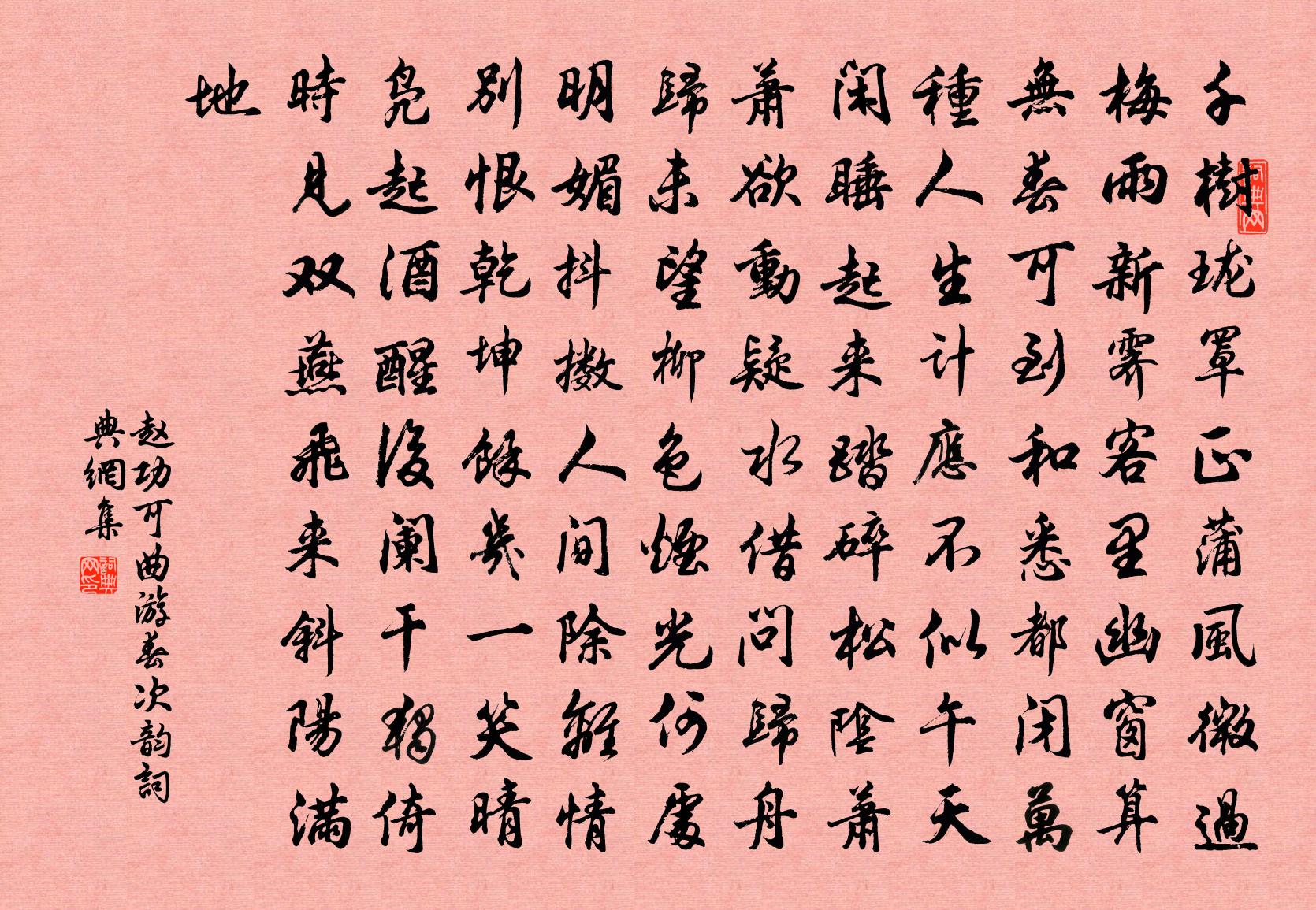 詩詞名句歷史字典書法欣賞書法字典國語詞典說文解字康熙字典古漢語字典標 題 作 者 詩 句 曲遊春(次韻)作者:趙功可 朝代:宋代曲遊春(次韻)原文千樹瓏罩,正蒲風微過,梅雨新霽。客里幽窗,算無春可到,和悉都閉。萬種人生計。應不似、午天閒睡。起來踏碎松陰,蕭蕭欲動疑水。借問歸舟歸未。望柳色煙光,何處明媚。抖擻人間,除離情別恨,乾坤余幾。一笑晴鳧起。酒醒後、闌乾獨倚。時見雙燕飛來,斜陽滿地。詩詞問答問:曲遊春(次韻)的作者是誰?答:趙功可問:曲遊春(次韻)寫於哪個朝代?答:宋代趙功可曲遊春(次韻)書法欣賞曲遊春(次韻)書法作品詩詞推薦夜吟陸游〔宋代〕六十餘年妄學詩,功夫深處獨心知。夜來一笑寒燈下,始是金丹換骨時。山行陸游〔宋代〕山光秀可餐,溪水清可啜。白雲映空碧,突起若積雪。我行溪山間,靈府為澄澈。崚嶒崖角立,蟠屈路九折。黃楊水調歌頭(壽常德府劉守)佚名〔宋代〕天地有英氣,鍾秀在人間。流虹甫近華旦,維岳預生賢。千載明良會遇,三世勛庸忠烈,誰得似家傳。高論排風俗被召作王安石〔宋代〕榮祿嗟何及,明恩愧未酬。欲尋西掖路,更上北山頭。得菊並詩司馬光〔宋代〕黃花小墢和煙斸,野興蕭蕭已相逐。同來更得詩句兼,久立看詩忘栽菊。紹興以後祀感生帝十六首佚名〔宋代〕[黃鐘為角]宋德惟火,神實司之。上們申惹,迎方重離。瑤幣告法,秀畢金支。啾啾神在,彝介繁禧。杭州雜詩和林石田汪元量〔宋代〕石田林處士,吟境靜無塵。亂後長如醉,愁來不為貧。飯蔬留好客,筆硯老斯人。近法秦州體,篇篇妙入神。贈蔣清隱王冕〔元代〕門外好山千萬重,翠濤百頃羅雲松。細水幽回雜花遠,三徑修竹來秋風。靈籟泠泠動清操,世外紅塵飛不到。白月唐律十首方岳〔宋代〕有客共攢眉,蠶叢事可悲。渡滬諸葛表,哀汴老韓詩。誰又青冥鉞,吾方白接?。神謨自堅定,豺虎莫恫疑。鄭駙馬宅宴洞中杜甫〔唐代〕主家陰洞細煙霧,留客夏簟青琅〔王乾〕。春酒杯濃琥珀薄,冰漿碗碧瑪瑙寒。誤疑茅屋過江麓,已入風磴霾雲端一剪梅/一翦梅徐似道〔宋代〕道學從來不則聲。行也東銘。坐也西銘。爺娘死後更伶丁。也不看經。也不齋僧。卻言淵子太狂生。行也輕輕。坐渚宮春日因懷有作齊己〔唐代〕舊業樹連湘樹遠,家山雲與岳雲平。僧來已說無耕釣,雁去那知有弟兄。客思莫牽蝴蝶夢,鄉心自憶鷓鴣聲。沙頭夜賦陸游〔宋代〕月暈知將雨,風聲報近秋。暗廊行熠燿,深樹嘯鵂鶹。老幸傳家事,狂猶為國憂。相齊雖已矣,且復飯吾牛。平綠軒王用亨〔宋代〕塵器胸次嘗苦隘,誰謂一隅天地寬。野色供餐來几上,山光極目在林端。犁耕宿雨春風暖,舟撼清流夜雨寒。卻笑宮詞楊皇后〔宋代〕輦路青苔雨後深,銅魚雙鑰晝沉沉。詞臣還有相如在,不得當時賣賦金。吳烈女翁森〔宋代〕士習與世換,一墮不自持。寧如二女子,至性不自移。人之能為人,所懼大節虧。吾父死汝手,吾身豈汝隨。匪雲詠蟬陸蒙老〔宋代〕綠蔭深處汝行藏,風露從來是稻粱。莫倚高枝縱繁響,也宜回首顧螳螂。冬日書懷四首王炎〔宋代〕結茅綠陰下,四壁但圖史。時亦有好事,相過款名理。舍之學宦遊,蓬轉不自已。豈無山水音,塵埃被綠綺。幽夢龍淵二首郭印〔宋代〕蟄龍道已成,升降得自在。淵無百尺深,竅穴通滄海。村居書事陸游〔宋代〕文辭苦思徒妨睡,官職虛名不療飢。垂老始知安樂法,紙鳶竹馬伴兒嬉。名句推薦酌酒與君君自寬,人情翻覆似波瀾。王維《酌酒與裴迪》 屏卻相思,近來知道都無益。王國維《點絳唇·屏卻相思》 富而不驕,貴而不舒。司馬遷《史記·五帝本紀》 何時一樽酒,重與細論文。杜甫《春日憶李白》 欲說還休,卻道“天涼好個秋”!辛棄疾《醜奴兒·書博山道中壁》 靈山多秀色,空水共氤氳。張九齡《湖口望廬山瀑布泉 / 湖口望廬山瀑布水》 年年負卻花期!過春時,只合安排愁緒送春歸。張惠言《相見歡·年年負卻花期》 東風吹落戰塵沙,夢想西湖處士家。劉因《觀梅有感》 事莫明於有效,論莫定於有證王充《論衡·卷二十三·薄葬篇》 天將暮,雪亂舞,半梅花半飄柳絮。馬致遠《壽陽曲·江天暮雪》