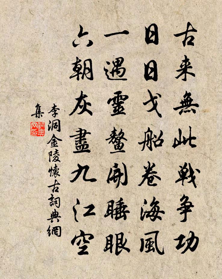詩詞名句歷史字典書法欣賞書法字典國語詞典說文解字康熙字典古漢語字典標 題 作 者 詩 句 金陵懷古作者:李洞 朝代:唐代金陵懷古原文古來無此戰爭功,日日戈船卷海風。一遇靈鰲開睡眼,六朝灰盡九江空。詩詞問答問:金陵懷古的作者是誰?答:李洞問:金陵懷古寫於哪個朝代?答:唐代問:金陵懷古是什麼體裁?答:七絕李洞金陵懷古書法欣賞金陵懷古書法作品注釋全唐詩:卷723-49詩詞推薦南歌子(沈蕙乞詞)朱敦儒〔宋代〕住近沈香浦,門前蕙草春。鴛鴦飛下柘枝新。見弄青梅初著、翠羅裙。怕喚拈歌扇,嫌催上舞茵。幾時微步不生塵漁家傲郭應祥〔宋代〕白古餘杭多俊俏。風流不獨夸蘇小。又見尊前人窈窕。花枝裊。貪看忘卻朱顏老。曲巷橫街深更杳。追歡買笑須年新書引周諺佚名〔先秦〕君子重襲。小人無由入。正人十倍。邪辟無由來。囊漏貯中。曹氏寒碧即事葛紹體〔宋代〕小窗棋靜一枰空,多事蟬聲斷續中。過雨涼生醉歸去,不知明日又秋風。與彥博審知同為問梅之行到溪南仆與審知俱以趙蕃〔宋代〕非為十日留,重此一歲闌。歲去易悲感,日來盛陰寒。今晨已春意,欲出反浩嘆。梅事足可惜,病軀良獨難。鑄鏡歌龍護老人〔唐代〕盤龍盤龍,隱於鏡中。分野有象,變化無窮。興雲吐霧,行雨生風。上清仙子,來獻聖聰。即事文同〔宋代〕公禮欲下格,具觀人所存。須知范孟博,豈肯伏陳蕃。和河南鄭尹新歲對雪白居易〔唐代〕白雪吟詩鈴閣開,故情新興兩裴回。昔經勤苦照書卷,今助歡娛飄酒杯。楚客難酬郢中曲,吳公兼占洛陽才。銅街秋杪江亭有作(一作秋杪乾越亭)劉長卿〔唐代〕寂寞江亭下,江楓秋氣斑。世情何處澹,湘水向人閒。寒渚一孤雁,夕陽千萬山。扁舟如落葉,此去未知還。婦女之孝二十首唐氏婦林同〔宋代〕姑今病且死,頗愧婦恩深。但願婦有子,皆如婦用心。謝張時可通判贈詩編陸游〔宋代〕聖朝中興六十年,君家文武何聯翩!先王劍履冠麟閣,後嗣簪橐陪甘泉。流傳到君愈卓犖,投我千篇皆傑作。未分臨岐錢別文天祥〔宋代〕聖恩優許力求田,把酒臨岐錢一杯。台閣是非遠已矣,乾坤俯仰愧何哉。竟追范蠡歸湖去,不管胡兒放馬來。強圉去不返曹鄴〔唐代〕寒女不自知,嫁為公子妻。親情未識面,明日便東西。但得上馬了,一去頭不回。雙輪如鳥飛,影盡東南街。九重和二十二弟龜山寺三絕晁說之〔宋代〕江邊龜步亦平平,淮上龜山聳五兵。何但八公山草木,解令王國列金城。次韻和承旨侍郎宿齋太乙宮之什楊億〔宋代〕北斗城南太乙祠,羽人多著九霞衣。竹宮肅穆珠旒拜,華表飄颻鶴馭歸。繞殿步虛幢影密,登台酌獻珮聲微。質明留題鑒遠樓三首李彌遜〔宋代〕表里江山面面來,秋風此日偶徘徊。塵埃閱心心如鑒,一到江樓眼為開。詠史二首陳造〔宋代〕平側區分偶儷勻,無階更復古真淳。浪言此秘無前睹,畢竟休文是罪人。飛龍引陳陶〔唐代〕有熊之君好神仙,餐霞鍊石三千年。一旦黃龍下九天,騎龍枿枿升紫煙。萬姓攀髯髯墮地,啼呼弓劍飄寒水。紫鸞水仙花二首李石〔宋代〕肌膚剪秋水,垂雲出龍宮。我意得子佩,笑許無言中。次韻李參政龍鶴山廬魏了翁〔宋代〕山色醉痕邊,溪聲客枕前。山溪元自舊,人已別經年。名句推薦欲覺聞晨鐘,令人發深省杜甫《游龍門奉先寺》 不茶不飯,不言不語,一味供他憔悴。蜀妓《鵲橋仙·說盟說誓》 鵲橋波里出,龍車霄外飛。任希古《和長孫秘監七夕》 憶共錦衾無半縫,郎似桐花,妾似桐花鳳。王士禎《蝶戀花·和漱玉詞》 鼎湖流水清且閒,軒轅去時有弓劍,古人傳道留其間李白《飛龍引二首·其二》 年年陌上生秋草,日日樓中到夕陽。晏幾道《鷓鴣天·醉拍春衫惜舊香》 目不能兩視而明,耳不能兩聽而聰。荀子《荀子·勸學》 獨立小橋風滿袖,平林新月人歸後。馮延巳《鵲踏枝·誰道閒情拋擲久》 知者不博,博者不知。老子《老子·德經·第八十一章》 圓魄上寒空,皆言四海同。李嶠《中秋月二首·其二》