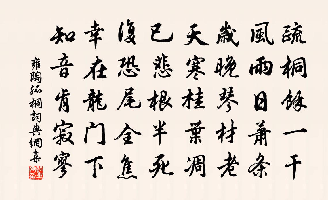 詩詞名句歷史字典書法欣賞書法字典國語詞典說文解字康熙字典古漢語字典標 題 作 者 詩 句 孤桐作者:雍陶 朝代:唐代孤桐原文疏桐餘一乾,風雨日蕭條。歲晚琴材老,天寒桂葉凋。已悲根半死,復恐尾全焦。幸在龍門下,知音肯寂寥。詩詞問答問:孤桐的作者是誰?答:雍陶問:孤桐寫於哪個朝代?答:唐代問:孤桐是什麼體裁?答:五律雍陶孤桐書法欣賞孤桐書法作品注釋全唐詩:卷518-4詩詞推薦夏日雜詠陸游〔宋代〕閒居自無客,況復暑如焚。百折赴溪水,數峰當戶雲。幽尋窮鹿徑,靜釣雜鷗群。舊愛南華語,今方踐所聞。贈李中華梁鍠〔唐代〕莫向嵩山去,神仙多誤人。不如朝魏闕,天子重賢臣。徐仙白玉蟾〔宋代〕採樵有遇才三日,歸路還家已十年。自古得仙非苦節,此坑安得號黃蓮。晚泊湘江懷故人劉長卿〔唐代〕天涯片雲去,遙指帝鄉憶。惆悵增暮情,瀟湘復秋色。扁舟宿何處,落日羨歸翼。萬里無故人,江鷗不相識。拜星月慢(祠壁宮姬控弦可念)彭泰翁〔宋代〕霧罥觚稜,塵侵團扇,恨滿哀彈倦理。控雨籠雲,共閒情孤倚。斂娥黛、怕似流鶯歷歷,惹得玉銷瓊碎。可惜闌乾修真觀李道士年老貧餓無所依忽縊死因為詩以梅堯臣〔宋代〕唐室王子後,黃冠事隱淪。餐霞不滿腹,披雲不蔽身。八十不能死,縊以頭上巾。始慕老莊術,終厭道德貧。營營用元韻答清老王炎〔宋代〕篆車創始自稚輪,筦簟從初但蒲稿。詩到晚唐非不佳,少似國風能理到。嗟予耄矣棄潁泓,臥病終年長卻掃。客無湖州歌九十八首 其六十九汪元量〔宋代〕會同館裡紫蒙茸,蘭麝飄來陣陣風。簫鼓沸天回雁舞,黃羅帳幔燕三宮。洞明軒白玉蟾〔宋代〕夜坐幽堂聽玉泉,松號風吼不成眠。 * 裡面真訊息,猿叫千山月正圓。寄晁元中十首黃庭堅〔宋代〕北書來無期,雁不到梅嶺。欲遺雙鯉魚,楓葉江路永。平生中心愿,褊短不獲騁。富貴安可為,吾亦有岑鼎。歸來曲侯善淵〔元代〕修行事,割愛斷攀緣。身淨心清明道眼,內持無漏氣神全。真汞煉真鉛。安爐鼎,進火任烹煎。款款揮來捶作片,頃歲如番禺與慶傳十六兄遇上饒後五年胥會於楊冠卿〔宋代〕囊空未辦買山錢,壯志隨人祗自憐。千里鄉關愁夢裡,幾年蹤跡瘴江邊。回谿重困南摶翼,異縣還尋東去船。何日汀漲釋永頤〔宋代〕澤國迷春漲,芳洲生綠波。淨涵汀樹小,間占浦雲多。風晚低輕燕,川明媚浴鵝。望人煙思遠,奈此暮山何。秦中吟十首。歌舞(一作傷閿鄉縣囚)白居易〔唐代〕秦中歲雲暮,大雪滿皇州。雪中退朝者,朱紫盡公侯。貴有風雲興,富無饑寒憂。所營唯第宅,所務在追游。朱輪奉和虢州劉給事使君三堂新題二十一詠北湖韓愈〔唐代〕聞說游湖棹,尋常到此回。應留醒心處,準擬醉時來。偈頌二十五首釋如淨〔宋代〕靈雲見處桃花開,天童見處桃花落。桃花開,春風催。桃花落,春風惡。春風惡,桃花躍浪生頭角。已亥雜詩 169龔自珍〔清代〕劘之道義拯之難,賞我出處好我書。史公副墨問姓氏,屈指首寄虬髯吳。賀表兄傅仁仲常後院生男王邁〔宋代〕昔君與我夜對床,知君著意選專房。為言東鄰有女寶,胡不貯之芸輝堂。君時為我一慫恿,以斗量金買嬌寵。小君題阮步兵祠二首宋祁〔宋代〕幽懷八十首,鬱郁寄蓬池。屋壁留南巷,鄉人奉種祠。乘驢非宦巧,逃蝨厭流卑。三沃椒漿酹,誰論飲過差。高溪有懷蔣吉〔唐代〕駐馬高溪側,旅人千里情。雁山山下水,還作此泉聲。名句推薦秋色從西來,蒼然滿關中。岑參《與高適薛據同登慈恩寺浮圖》 真積力久則入。荀子《荀子·勸學》 夜月一簾幽夢,春風十里柔情。秦觀《八六子·倚危亭》 欲知悵別心易苦,向暮春風楊柳絲。李白《下途歸石門舊居》 夜深風竹敲秋韻,萬葉千聲皆是恨。歐陽修《玉樓春·別後不知君遠近》 水滿有時觀下鷺,草深無處不鳴蛙。陸游《幽居初夏》 無言獨上西樓,月如鉤。寂寞梧桐深院鎖清秋。李煜《相見歡·無言獨上西樓》 燕簾鶯戶,雲窗霧閣,酒醒啼鴉。張炎《朝中措·清明時節》 記得綠羅裙,處處憐芳草。賀鑄《綠羅裙·東風柳陌長》 兵戈既未息,兒童盡東征。杜甫《羌村三首·其三》
