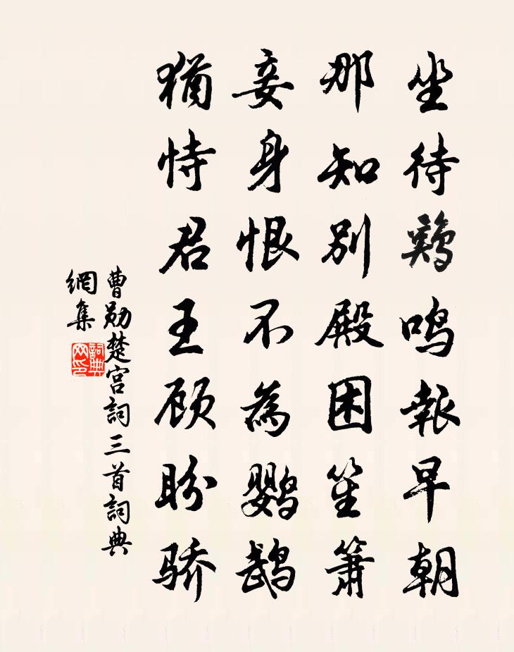 詩詞名句歷史字典書法欣賞書法字典國語詞典說文解字康熙字典古漢語字典標 題 作 者 詩 句 楚宮詞三首作者:曹勛 朝代:宋代楚宮詞三首原文坐待雞鳴報早朝,那知別殿困笙簫。妾身恨不為鸚鵡,猶恃君王顧盼驕。詩詞問答問:楚宮詞三首的作者是誰?答:曹勛問:楚宮詞三首寫於哪個朝代?答:宋代曹勛楚宮詞三首書法欣賞楚宮詞三首書法作品詩詞推薦帶馬行 緣化子弟王哲〔元代〕鎖戶真成了。百朝甚惺灑。冰餐非苟且,玄妙就中超,*馬眸粘惹。恩愛俱齊舍。閒遊冶。教余同幽雅。仙子共成金縷曲(送五峰歸九江)劉辰翁〔宋代〕世事如何說。似舉鞍、回頭笑問,并州兒葛。手障塵埃黃花路,千里龍沙如雪。著破帽、蕭蕭餘發。行過故人柴桑獻從叔當塗宰陽冰李白〔唐代〕金鏡霾六國,亡新亂天經。焉知高光起,自有羽翼生。蕭曹安山兒屼,耿賈摧欃槍。吾家有季父,傑出新地英。雖病中秦觀〔宋代〕疏簾薄幔對青燈,鸜鵒喧喧自轉更。風雨渺漫人臥病,地爐湯鼎更悲鳴。圓壇午龕行事王俊刈〔宋代〕平日郊邱事口談,今朝相祀列星參。大裘袞冕升南陛,小次龍床近午龕。韋社去天真尺五,嵩神祀聖似呼三。清都題釣台徐照〔宋代〕當時廊廟去,此地也成空。草木多年換,兒孫近代窮。無言傷末俗,久立慕高風。梅福神仟者,新知是婦翁。海棠七首劉克莊〔宋代〕范公蜀西曲,陸老劍南詩。子美渠曾道,淵材輩豈知。觀北人圍獵蘇頌〔宋代〕莽莽寒郊晝起塵,翩翩戎騎小圍分。引弓上下人鳴鏑,羅草縱橫獸軼群。畫馬今無胡待詔,射鵰猶懼李將軍。山川昱嶺范成大〔宋代〕竹輿搖兀走婆娑,石滑泥融側足過。昱嶺不高人已困,晚登新嶺奈君何!點絳唇朱雍〔宋代〕輕艷盈盈,相逢曾向寒溪路。惜飄零處。無計禁春雨。素影參差,人在瓊城步。危闌暮。年光催度。特地香風住。白雲獅子峰望羅浮李昴英〔宋代〕不到羅浮瞥六年,後期幾誤鐵橋仙。遠雲不隔山真面,西麓原同第七天。杭州官舍偶書姚合〔唐代〕錢塘刺史謾題詩,貧褊無恩懦少威。春盡酒杯花影在,潮回畫檻水聲微,閒吟山際邀僧上,暮入林中看鶴歸。無術獨駿圖毛直方〔宋代〕連天苜蓿青茫茫,鹽車鼓車紛道傍。肉駿汗血不可常,權奇倜儻晦若藏。五之六之無留良,如此獨步何堂堂。日三減字木蘭花吳則禮〔宋代〕斑斑小雨。初入高梧黃葉暮。又是重陽。昨夜西風作許涼。鮮鮮叢菊。只解凋人雙鬢綠。試傍清尊。分付幽香與斷希顏見寄二絕和韻陳文蔚〔宋代〕乳燕交雛看學飛,絕勝對客塵頻軍。綠陰翠幄閒中好,誰道春隨紅紫歸。辭閩王歸朝寄倪先輩翁承贊〔唐代〕時人莫訝再還鄉,簡冊分明劍佩光。駟馬高車太常樂,登庸門下憶賢良。題祝公輔靜得齋方回〔宋代〕鄭衛撼俗耳,姬姜接凡目。醇酎誑渴吻,大房誘飢腹。一閾內外間,鮮不妄舉足。堂堂七尺軀,頃刻萬感觸。人生朝退書懷韓偓〔唐代〕鶴帔星冠羽客裝,寢樓西畔坐書堂。山禽養久知人喚,窗竹芟多漏月光。粉壁不題新拙惡,小屏唯錄古篇章。孜孜病中絕句范成大〔宋代〕夜合梢頭蘸紫茸,菉蔥頂上拆黃封。去年團扇題詩處,依舊疏簾細雨中。偈頌十二首釋原妙〔宋代〕學道如初不變心,千魔萬難愈惺惺。直須敲出虛空髓,拔卻金剛腦後釘。名句推薦春草細還生,春雛養漸成。揭傒斯《畫鴨》 苟不至德,至道不凝焉。子思《中庸·第二十七章》 千步虹橋,參差雁齒,直趨水殿。柳永《破陣樂·露花倒影》 里仁為美,擇不處仁,焉得知?孔子弟子《論語·里仁篇》 雨中黃葉樹,燈下白頭人。司空曙《喜外弟盧綸見宿》 孟夏草木長,繞屋樹扶疏。陶淵明《讀山海經·其一》 九日黃花才過了,一尊聊慰秋容老。趙可《鳳棲梧·霜樹重重青嶂小》 滿紙荒唐言,一把辛酸淚!曹雪芹《紅樓夢·第一回》 故山知好在,孤客自悲涼。蘇軾《臨江仙·送王緘》 畫圖省識春風面,環珮空歸夜月魂。杜甫《詠懷古蹟五首·其三》