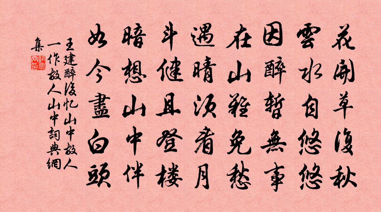 詩詞名句歷史字典書法欣賞書法字典國語詞典說文解字康熙字典古漢語字典標 題 作 者 詩 句 醉後憶山中故人(一作故人山中)作者:王建 朝代:唐代原文花開草復秋,雲水自悠悠。因醉暫無事,在山難免愁。遇晴須看月,斗健且登樓。暗想山中伴,如今盡白頭。詩詞問答問:《醉後憶山中故人(一作故人山中)》的作者是誰?答:王建問:該詩寫於哪個朝代?答:唐代問:王建的名句有哪些?答:王建名句大全書法欣賞醉後憶山中故人(一作故人山中)書法作品注釋全唐詩:卷299_8詩詞推薦靈濟寺午睡起陳著〔宋代〕江上春風底事寒,主張火櫃一雷鼾。不乾酒力濃時困,自是人情熟處安。首夏二章呈諸鄰司馬光〔宋代〕首夏木陰薄,清和自一時。筍抽 * 尺,荷生三四枝。新服裁蟬翼,舊扇拂蛛絲。莎徑熱未劇,晨昏來往宜。次韻子瞻有美堂夜歸蘇轍〔宋代〕飲闌鍾虡欲移軒,香霧猶殘金博山。明月飛來松嶺外,遊人散落馬蹄間。城嚴畫鼓初傳角,路暗山花自落鬟。清境次韻酬周開祖宣義秦觀〔宋代〕并州令尹古人風,淮海相忘十載中。麗句曉披花綽約,清談初扣玉丁東。追攀昔共猗玕子,嗜好今同桑薴翁。所惜呈劉子卿四首趙蕃〔宋代〕往自清江別,於今近十年。依僧聊避暑,扔節會朝天。我愧不如昔,公乎真過前。政規期斷手,明本已終篇。句崔子厚〔宋代〕興盡回蘭棹。聞李泰發參政得旨自便將歸以詩迓之曾幾〔宋代〕苦遭前政墮危機,二十餘年詠式微。天上謫仙皆欲殺,海濱大老竟來歸。故園松菊猶存否,舊日人民果是非。最小射魚曲李商隱〔唐代〕思牢弩箭磨青石,繡額蠻渠三虎力。尋潮背日伺泅鱗,貝闕夜移鯨失色。纖纖粉簳馨香餌,綠鴨回塘養龍水。含冰密庵題柱二首劉學箕〔宋代〕五更清夢雞喚醒,八月好景詩為催。秋蟲夜靜野禽語,風木天寒山雨來。關山月鄒登龍〔宋代〕行人十年歸不得,夜上戍樓看明月。樓中星斗連太白,樓外關山雁飛絕。雁飛絕,歸不得,鏡時青蛾怨離別。前年彭心齋諱逢源自作頌呈師師於一句下加三句釋印肅〔宋代〕光大深淵,匝地周天。常憶江南三月裹,鷓鴣啼處百花鮮。讀詔書王安石〔宋代〕去秋東出汴河梁,已見中州旱勢強。日射地穿千里赤,風吹沙度滿城黃。近聞急詔收群策,頗說新年又亢陽。賤術仁宗皇帝輓詩二首余靖〔宋代〕丕承三後績,盛烈古難陪。納諫書囊集,談經殿閣開。御弧圓月滿,宸翰舞鸞回。冠劍雖歸葬,英風萬祀恢。題石子溪亭李新〔宋代〕怪事年來一禿翁,懶能揮涕謝途窮。歸心豈但杜鵑勸,官味正嫌玄酒濃。枯葉展開蠶命老,山花飛盡蝶家空。願從賦介軒半村新居周耕雲〔宋代〕近謀吟屋傍潯溪,雁盪山深雲未歸。怕惱春光花種少,愛延月色竹栽稀。寶藏書冊教兒讀,土視功名與世違。不是謝潘端叔惠紅梅樓鑰〔宋代〕舊見寒花蠟蔕紅,寧知泌入雪膚中。絕憐金谷佳人墜,到地余香散曉風。寓題黃滔〔唐代〕紛紛墨敕除官日,處處紅旗打賊時。竿底得璜猶未用,夢中吞鳥擬何為。損生莫若攀丹桂,免俗無過詠紫芝。兩岸依韻和挺之晨起見寄梅堯臣〔宋代〕淺水不堪泛,暗灘時激聲。晨都望迢遞,窮旅思屏營。芳草同誰藉,投壺自喚名。得君晨起詠,遠遠見交情。王復秀才所居雙檜二首蘇軾〔宋代〕吳王池館遍重城,奇草幽花不記名。青蓋一歸無覓處,只留雙檜待昇平。凜然相對敢相欺,直乾凌空未要奇。根到同顏使君真卿、李侍御萼游法華寺登鳳翅山望太湖皎然〔唐代〕雙峰開鳳翅,秀出南湖州。地勢抱郊樹,山威增郡樓。正逢周柱史,來會魯諸侯。緩步凌彩蒨,清鐃發颼飀。披雲名句推薦凡與敵戰,若敵人勢實,我當嚴兵以備之,則敵人必不輕動。佚名《百戰奇略·第五卷·實戰》 路遙知馬力,日久見人心。佚名《增廣賢文·上集》 願月常圓,休要暫時缺。趙佶《醉落魄·預賞景龍門追悼明節皇后》 被酒莫驚春睡重,賭書消得潑茶香,當時只道是尋常。納蘭性德《浣溪沙·誰念西風獨自涼》 無人知此意,歌罷滿簾風。陳與義《臨江仙·高詠楚詞酬午日》 車轔轔,馬蕭蕭,行人弓箭各在腰。杜甫《兵車行》 酒後競風采,三杯弄寶刀。李白《白馬篇》 參橫斗轉欲三更,苦雨終風也解晴。蘇軾《六月二十日夜渡海》 日暮鄉關何處是?煙波江上使人愁。崔顥《黃鶴樓 / 登黃鶴樓》 親朋無一字,老病有孤舟。杜甫《登岳陽樓》