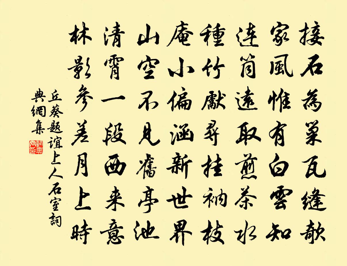 詩詞名句歷史字典書法欣賞書法字典國語詞典說文解字康熙字典古漢語字典標 題 作 者 詩 句 題誼上人石室作者:丘葵 朝代:宋代題誼上人石室原文接石為巢瓦縫欹,家風惟有白雲知。連筒遠取煎茶水,種竹先尋掛衲枝。庵小偏涵新世界,山空不見舊亭池。清霄一段西來意,林影參差月上時。詩詞問答問:題誼上人石室的作者是誰?答:丘葵問:題誼上人石室寫於哪個朝代?答:宋代丘葵題誼上人石室書法欣賞題誼上人石室書法作品詩詞推薦又上後園山腳杜甫〔唐代〕昔我游山東,憶戲東嶽陽。窮秋立日觀,矯首望八荒。朱崖著毫髮,碧海吹衣裳。蓐收困用事,玄冥蔚強梁。逝水酬梁二十戎昱〔唐代〕渚宮無限客,相見獨相親。長路皆同病,無言似一身。歲寒唯愛竹,憔悴不堪春。細與知音說,攻文恐誤人。系冠船蓬自戲許志仁〔宋代〕竹皮狗尾粗斕斑,神虎門前興已闌。每恨誤身誠可溺,殆將苴履不須彈。數莖漸覺勝簪怯,一免當知復冠難。柱後村晚張耒〔宋代〕深塢繁花麗,晴田細徑分。孤舟春水路,芳草夕陽村。暗雀投檐靜,昏鴉集樹喧。牛羊自歸晚,燈火掩衡門。贈陳君景初王安石〔宋代〕吾嘗奇華佗,腸胃真割剖。神膏既傅之,頃刻活殘朽。昔聞今則信,絕伎世嘗有。堂堂潁川士,察脈極淵藪。珍丸郡齋閒步張伯玉〔宋代〕花木方塘小,樓台宅院深。以何消俸祿,無事任山林。雨雪羈游路,風沙苦戰心。若論當此景,不啻萬黃金。種田行趙友直〔宋代〕春雨一犁足郊原,南村北村齊種田。拋秧落水時競捷,老者在後少者前。日暮天寒完未得,比鄰來相助插田。比鄰寒食日偶出董嗣杲〔宋代〕漪嵐堂下野芳晴,楊柳枝頭歇雨聲。笑逐遊人城外去,沙洲沽酒做清明。香入雲亭為高子章賦杜去輕〔宋代〕山麓有庭存古意,不種凡花惟種桂。苔葑蘚剝迸鱗皺,雪勁霜頑聾蒼翠。栽培豈解一日成,愛惜至今尤不易。來人頌石頭和尚草庵歌釋印肅〔宋代〕成時初見茅草新,權披百衲強看經。賴得藥山重決破,別傳一句醒人心。扇子峽范成大〔宋代〕茲行看山真飽諳,今晨出峽仍窮探。南磯北磯白鐵壁,千峰萬峰蒼玉篸。橫前直疑江已斷,崛起競與天相攙。蜀山醉中錄近詩因題卷後陸游〔宋代〕鵝兒色淺酒醺人,雞距鋒圜筆絕倫。滿引一杯書數紙,要知林下有閒身。送稅官仇副使詩十首熊禾〔宋代〕彥修但自修,逆境堪進德。知我自有天,純固在學力。題識山樓易祓〔宋代〕山外如何便識山,白雲出岫鳥知還。更看面目知端的,卻在先生幾格閒。贈水軍都將張蠙〔唐代〕平生為有安邦術,便別秋曹最上階。戰艦卻容儒客臥,公廳唯伴野僧齋。裁書榭迥冰膠筆,養藥堂深蘚惹鞋。直待敷水盧校書黃滔〔唐代〕九霄無詔下,何事近清塵。宅帶松蘿僻,日唯猿鳥親。吟高仙掌月,期有洞庭人。莫問煙霞句,懸知見岳神。三月十日流杯亭李商隱〔唐代〕身屬中軍少得歸,木蘭花盡失春期。偷隨柳絮到城外,行過水西聞子規。花舞史浩〔宋代〕算仙家,真巧數,能使眾芳長繡組。羽軿芝葆,曾到世間,誰共凡花為伍。桃李漫夸艷陽,百卉又無香可取。歲歲宮詞一百首岳珂〔宋代〕繡裳畫袞地生雲,風動槐龍舞玉宸。鈴索不搖鐘漏永,驪珠滿袖寵詞臣。詠史上漢高帝八首陳普〔宋代〕氣力才勝野外儀,情懷頗樂漢中兒。兩生禮樂留侯箸,此事而翁卻自知。名句推薦精誠所加,金石為開。范曄《後漢書·列傳·光武十王列傳》 嚴近乎矜,然嚴是正氣,矜是乖氣;故持身貴嚴,而不可矜。王永彬《圍爐夜話·第四三則》 積善逢善,積惡逢惡。馮夢龍《喻世明言·卷二十六》 人迷洞庭水,雁度瀟湘煙。李白《郢門秋懷》 千層石樹遙行路,一帶山田放水聲。姚鼐《山行·布穀飛飛勸早耕》 漢月垂鄉淚,胡沙費馬蹄。岑參《磧西頭送李判官入京》 為近都門多送別,長條折盡減春風。白居易《青門柳》 屋漏在上,知者在下。王充《論衡·卷十一·答佞篇》 空山梵唄靜,水月影俱沉。納蘭性德《水調歌頭·題西山秋爽圖》 梨花最晚又凋零,何事歸期無定準。歐陽修《玉樓春·去時梅萼初凝粉》