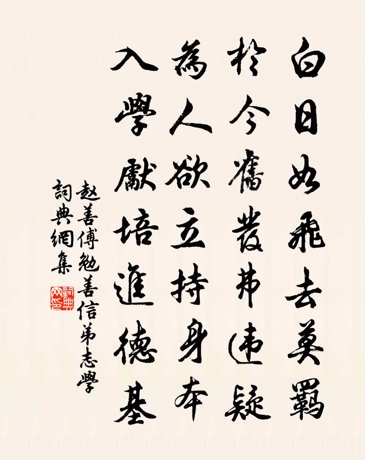 詩詞名句歷史字典書法欣賞書法字典國語詞典說文解字康熙字典古漢語字典標 題 作 者 詩 句 勉善信弟志學作者:趙善傅 朝代:宋代勉善信弟志學原文白日如飛去莫羈,於今舊發弗違疑。為人慾立持身本,入學先培進德基。詩詞問答問:勉善信弟志學的作者是誰?答:趙善傅問:勉善信弟志學寫於哪個朝代?答:宋代趙善傅勉善信弟志學書法欣賞勉善信弟志學書法作品詩詞推薦晚春書懷簡陳巽叔二首王炎〔宋代〕畏病不多酌,遣情時自吟。絮飛春漠漠,樹密午陰陰。壯縣今岑寂,微官有陸沉。青山啼杜宇,未斷故園心。極相思蔡伸〔宋代〕相思情味堪傷。誰與話衷腸。明朝見也,桃花人面,碧蘚迴廊。別後相逢唯有夢,夢回時、展轉思量。不如早睡,次金東園農家雜詠八首楊公遠〔宋代〕林下欹傾茅草屋,門前詰曲竹笆籬。數聲清笛知何處,牛背斜陽牧豎吹。題萬山許鍊師法振〔唐代〕道成人不識,流水響空山。花暗軒窗外,雲隨坐臥間。驗圖名已久,絕粒事長閒。更欲崑崙去,羞看絳節還。感遇·江南有丹橘張九齡〔唐代〕江南有丹橘,經冬猶綠林。豈伊地氣暖,自有歲寒心。可以薦嘉客,奈何阻重深。運命惟所遇,循環不可尋。徒言自勉李覯〔宋代〕月欲東生日又西,莫隨兒女醉明時。黃泉一向埋愚鬼,不與人間史筆知。偈七首釋允韶〔宋代〕老漢當年臘月八,三更夜半顛狂發。剛把長釘釘眼睛,直至而今未能拔。謝胡編校惠藥醫膝病遂以藥名賦劉黻〔宋代〕益智莫如愚,誰甘遂作非。年增思續斷,親老續當歸。起石安吟久,防風見客稀。前胡古君子,松節自相依。述懷呈十七家叔陳與義〔宋代〕兒時學道逃悲歡,只今未免憂饑寒。浮生萬事蟻旋磨,冷官十年魚上竿。竹林步兵亦忍辱,長安閉門出無仆。門前贈相士徐碧眼白玉蟾〔宋代〕碧眼何須青白為,冰辭雹語不吾欺。君看袞袞腰金者,曾見騷壇大將誰。次韻汪以南閒居漫吟十首方回〔宋代〕何人不骸骨,龍蟻共一朽。聖賢獨不死,天若顧之厚。太昊初畫卦,迄周興井柳。經制斯大備,中墜賴魚叟。立言次韻真歇和尚圓覺經頌一十四首清淨慧菩薩釋正覺〔宋代〕覺了前前非處難,而今步步到長安。色心{左氵右上勿右下日}合無絲路,法性圓融沒許般。個事本來元脫灑,幾和錢學士喜雪王安石〔宋代〕手把詩翁憶雪詩,坐愁窮海瘴煙霏。誰令天上蒼茫合,忽見空中散漫飛。閶闔與風生氣勢,姮娥交月借光輝。山鴉偈頌一百四十一首釋師範〔宋代〕王道平平,其壽綿綿。漁歌樵唱,共樂堯年。無為焉,無私焉,乾坤一統舊山川。贈比部蕭郎中十兄(甫從姑子也)杜甫〔唐代〕有美生人傑,由來積德門。漢朝丞相系,梁日帝王孫。蘊藉為郎久,魁梧秉哲尊。詞華傾後輩,風雅藹孤鶱。宅相大雨後詠南軒竹二絕句蘇轍〔宋代〕苦寒壞我千竿綠,好雨還催眾筍長。痛飲雖無嵇阮客,瓢尊一試午陰涼。宮中行樂詞八首·其二李白〔唐代〕柳色黃金嫩,梨花白雪香。玉樓巢翡翠,金殿鎖鴛鴦。選妓隨雕輦,征歌出洞房。宮中誰第一,飛燕在昭陽。早春汪若水宋壽谷見過鄭芬〔宋代〕雲起松洋路,吾廬蹴水開。故人嫌俗縛,雙騎出城來。春晝散微雨,隣家多早梅。彈琴徵古調,何處可登台。水竹袁說友〔宋代〕拳石環清泚,龍鬚細屈蟠。兩峰低峍崒,一簇小琅玕。密葉風前影,疏枝水底寒。相從此君爾,著意問平安。浣紗女王昌齡〔唐代〕錢塘江畔是誰家,江上女兒全勝花。吳王在時不得出,今日公然來浣紗。名句推薦流水便隨春遠,行雲終與誰同。晏幾道《臨江仙·鬥草階前初見》 天長地久有時盡,此恨綿綿無絕期。白居易《長恨歌》 醉翁之意不在酒,在乎山水之間也。歐陽修《醉翁亭記》 奇文共欣賞,疑義相與析。陶淵明《移居二首》 繡袂捧琴兮,登君子堂。貫休《善哉行·傷古曲無知音》 冰合井泉月入閨,金缸青凝照悲啼。李白《夜坐吟》 白鳥明邊帆影直。隔江聞夜笛。周密《聞鵲喜·吳山觀濤》 去年元夜時,花市燈如晝。歐陽修《生查子·元夕》 不誘於譽,不恐於誹,率道而行,端然正己。荀子《荀子·非十二子》 道由白雲盡,春與青溪長。劉昚虛《闕題》
