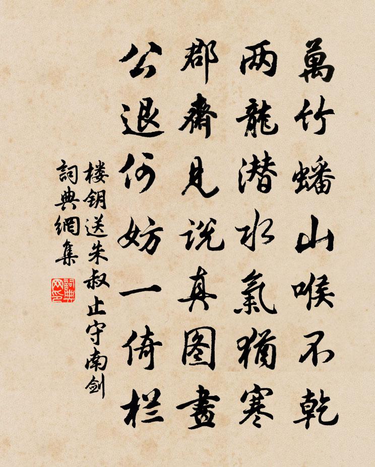 詩詞名句歷史字典書法欣賞書法字典國語詞典說文解字康熙字典古漢語字典標 題 作 者 詩 句 送朱叔止守南劍作者:樓鑰 朝代:宋代送朱叔止守南劍原文萬竹蟠山喉不乾,兩龍潛水氣猶寒。郡齋見說真圖畫,公退何妨一倚欄。詩詞問答問:送朱叔止守南劍的作者是誰?答:樓鑰問:送朱叔止守南劍寫於哪個朝代?答:宋代樓鑰送朱叔止守南劍書法欣賞送朱叔止守南劍書法作品詩詞推薦朝中措(魏倅·定甫生日)王之道〔宋代〕州閭庠序少追隨。俯仰鬢成絲。仕宦孰逾君達,恩施遍及庭芝。溪頭春日,歡聲和氣,如見生時。好對高堂壽母,晚泊烽火磯董嗣杲〔宋代〕野陰遠閣雪風乾,向暮維舟水色寒。火號熒熒今夜燭,因知江北報平安。春懷示鄰里詹慥〔宋代〕斷牆著雨蝸成字,老屋無僧燕作家。剩欲出門追語笑,卻嫌歸髩著塵沙。風翻蛛網開三面,雷動蜂窠趁兩衙。屢失風入松 賞牡丹沈禧〔元代〕壽安新試粲紅裳。珍重異尋常。群芳落盡呈嬌態,倚欄乾、獨殿春陽。剩放天香國色,全勝魏紫姚黃。天時人事正和曇穎師四明十題石筍峰梅堯臣〔宋代〕巨石如龍孫,聳聳煙霧裡。明明落溪口,納納喧灘齒。何當助齋盂,菌蕃徒為美。和南伯山行韻二首袁說友〔宋代〕日日登山復下山,崎嶇分寸絕難攀。已無魚腹江湖慮,肯怯羊腸道路彎。滿目詩材供各子,一杯醽醁染衰顏。四方感遇十首次韻和黃著作魯直以將窮山海跡勝絕晁補之〔宋代〕鳲鳩興獨居,百兩誰與將。未見憂忡忡,既覯為龍光。吹竽沸齊市,零雨暗空桑。寒歌牛軛底,激烈氣彌剛。和禱富沙趙希逢〔宋代〕也知銅玉寧無璞,自是蒙金合以沙。挽首何辜聯盜械,脫身無路覓仙槎。懷珍空自經三獻,受用何嘗得五車。事業失調名佚名〔宋代〕金鋪翠、蛾毛巧。是工夫不少。鬧蛾兒揀了蜂兒賣,賣雪柳、宮梅好。再次韻陳造〔宋代〕歸擔乍弛誰洗泥,使君載酒攜歌兒。小家卷褥當酒負,醉倒一笑眠虎皮。平生自審枯槁甚,高情顧肯振拂之。均州和郭功父韻送芝道人游隱靜蘇軾〔宋代〕觀音妙智力,應感隨緣度。芝師訪東坡,寧辭萬里步。道義偶相契,十年同去住。行窮半世間,又欲浮杯渡。我願新毗陵守王立之書來以詩答之蜀中同寮也孫應時〔宋代〕俯仰三年夢,差池萬里歸。雙魚蒙記憶,五馬慶光輝。且說還家樂,休論與世違。平生歲寒約,搔首重依依。用峰山舊韻二首姚孝錫〔宋代〕信步西風寺,窮幽未寬賒。松根纏石瘦,雲磴出岩斜。思爽餘三唱,詩成自一家。空餘幾兩屐。不踏渡溪槎。促拍醜奴兒 學閒閒公體 此下原附閒閒公同賦元好問〔金代〕朝鏡惜蹉跎。一年年、來日無多。無情六合乾坤里,顛鸞倒鳳,撐霆裂月,直被消磨。世事飽經過。算都輸、暢飲步至東皋高啟〔明代〕斜日半川明,幽人每獨行。愁懷逢暮慘,詩意入秋清。鳥啄枯楊碎,蟲懸落葉輕。如何得歸後,猶似客中情?壺中天(登寄閒吟台)李彭老〔宋代〕素飆盪碧,喜雲飛寥廓,清透涼宇。倦鵲驚翻台榭迥,葉葉秋聲歸樹。珠斗斜河,冰輪輾霧,萬里青冥路。香深屏雨中過沙灘二首楊萬里〔宋代〕煙雨新圖學不成,煙能明晦雨能聲。莫教一點春風起,卷盡空濛寫晚晴。滿江紅姜夔〔宋代〕心字融入去聲,方諧音律。予欲以平韻為之,久不能成。因泛巢湖,聞遠岸簫鼓聲。問之舟師,云:居人為此湖神和徐榷院唐佐見寄七首何夢桂〔宋代〕南山有高樓,青雲可俯踐。樓上有佳人,當年慣識面。忽覺在他鄉,綽約思目見。綠綺無知音,心長曲未遍。青雲寄仵判院八首華岳〔宋代〕錦箋牙軸白雲詞,君外知音更有誰。一榻何時對風雨,與君聯臂話相思。名句推薦群居防口,獨坐防心。佚名《增廣賢文·下集》 人心不足蛇吞象。馮夢龍《警世通言·卷二十五》 劇辛樂毅感恩分,輸肝剖膽效英才。李白《行路難三首》 相恨不如潮有信,相思始覺海非深。白居易《浪淘沙·借問江潮與海水》 危樓高百尺,手可摘星辰。李白《夜宿山寺》 善操理者不能有全功,善處身者不能無過失。薛居正《舊五代史·後周·世宗紀二》 常人突遭禍患,可決其再興,心動於警勵也。王永彬《圍爐夜話·第三七則》 綠竹入幽徑,青蘿拂行衣。李白《下終南山過斛斯山人宿置酒》 更願諸公著意,休教忘了中原。李好古《清平樂·瓜洲渡口》 旅館寒燈獨不眠,客心何事轉悽然。高適《除夜作》