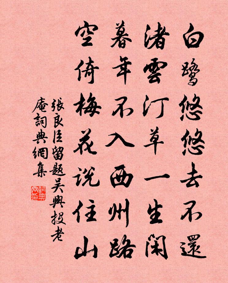 詩詞名句歷史字典書法欣賞書法字典國語詞典說文解字康熙字典古漢語字典標 題 作 者 詩 句 留題吳興投老庵作者:張良臣 朝代:宋代留題吳興投老庵原文白鷺悠悠去不還,渚雲汀草一生閒。暮年不入西州路,空倚梅花說住山。詩詞問答問:留題吳興投老庵的作者是誰?答:張良臣問:留題吳興投老庵寫於哪個朝代?答:宋代張良臣留題吳興投老庵書法欣賞留題吳興投老庵書法作品詩詞推薦避地山谷鄧肅〔宋代〕大禹不到處,石壁誰鑿開。雲端欲相摶,飛出白雲來。余沫亂飛雪,雄聲敵春雷。泝流涌百尺,銀山陟崔嵬。顧我玉漏遲 七夕行台諸公見餞 讀畫齋叢書本滕賓〔元代〕問誰爭乞巧。誰知巧處成煩惱。天上佳期,底事別多歡少。雨夢雲情半餉,又早被西風吹曉。愁未了。星橋隔斷,鷓鴣天元好問〔金代〕零落棲遲感興多。酒杯直欲卷銀河。人間清鏡悲華發,世外仙棋爛斧柯。長袖舞,抗音歌。月明人影兩婆娑。醉來灩澦堆蘇泂〔宋代〕灩澦堆頭一葉舟,半年人共水東流。平生快意才如此,不數東南數十州。外廚遺火二首王安石〔宋代〕青煙散入夜雲流,赤焰侵尋上瓦溝。門戶便疑能炙手,比鄰何苦卻焦頭。溪上錢槱〔宋代〕秋老蘆花冉冉飛,曉天寒氣襲人衣。輕橈棹入鷗群去,釣得鱸魚帶雨歸。郊廟歌辭。祭汾陰樂章。南呂羽韓休〔唐代〕於穆濬哲,維清緝熙。肅事昭配,永言孝思。滌濯靜嘉,馨香在茲。神之聽之,用受福釐。書扇二首趙文〔宋代〕明月何時掇,秋風幾日還。若教人不熱,敢怨我長閒。甲寅西歸江行春懷十首汪莘〔宋代〕一層山只一溪斜,偃臥東風戀日華。莫把江行生旅思,他年憶此勝還家。題鑒上人房二首宋之問〔唐代〕落花雙樹積,芳草一庭春。玩之堪興異,何必見幽人。晚入應真理,經行尚未回。房中無俗物,林下有青苔。河南王少尹宅燕張常侍白舍人兼呈盧郎中李員外二副使劉禹錫〔唐代〕將星夜落使星來,三省清臣到外台。事重各銜天子詔,禮成同把故人杯。捲簾松竹雪初霽,滿院池塘春欲回。第一郊廟歌辭。享文敬太子廟樂章。送神崔邠〔唐代〕三獻具舉,九旗將旋。追勞表德,罷享賓天。風引仙管,堂虛畫筵。芳馨常在,瞻望悠然。蝶戀花袁去華〔宋代〕十二峰前朝復暮。空憶蘭台,公子高唐句。斷雨殘雲無覓處。古來離合歸冥數。咫尺明河無限路。牛女佳期,猶解代和韻釋紹嵩〔宋代〕石路無塵竹徑開,幽園尋勝獨登台。橋邊野水通漁路,城上秋山入酒杯。紫闥青雲俱未遂,紅顏白髮遞相催。悠悠秋日送嚴湘侍御歸京李鹹用〔唐代〕蟾影珪圓湖始波,楚人相別恨偏多。知君有路升霄漢,獨我無由出薜蘿。雖道危時難進取,到逢清世又如何。誰聽游道何二山晚包倪氏玉湖程公許〔宋代〕草草盤蔬一酒壺,虎岩小憩轉金與。靜觀生物春風裡,笑拂詩牌劫火余。散策松陰寒悄悄,擷香梅逕雪速速。歸航再韻寄元齡弟二首裘萬頃〔宋代〕小舟閒已杙江湄,滿眼璚瑤定有詩。詩似其人人似雪,只應清處恐人知。蠶婦杜荀鶴〔唐代〕粉色全無飢色加,豈知人世有榮華。年年道我蠶辛苦,底事渾身著苧麻。失調名佚名〔宋代〕蟾輝兔影十分滿。貽韋鍊師儲光羲〔唐代〕精思莫知日,意靜如空虛。三鳥自來去,九光遙卷舒。新池近天井,玉宇停雲車。余亦苦山路,洗心祈道書。名句推薦今夜月明江上、酒初醒。黃庭堅《南歌子·槐綠低窗暗》 相知無遠近,萬里尚為鄰。張九齡《送韋城李少府》 郎騎竹馬來,繞床弄青梅。李白《長干行二首》 親所好,力為具。親所惡,謹為去。李毓秀《弟子規·入則孝》 人之所助者,信也。佚名《易傳·繫辭傳上·第十二章》 浪花有意千里雪,桃花無言一隊春。李煜《漁父·浪花有意千里雪》 足以充虛繼氣,強股肱,耳目聰明,則止。墨子《墨子·21章 節用(中)》 何事非相思,江上葳蕤竹。吳均《登二妃廟》 松葉堪為酒,春來釀幾多。張九齡《答陸澧》 焚琴煮鶴從來有,惜玉憐香幾個知!馮夢龍《醒世恆言·卷三》